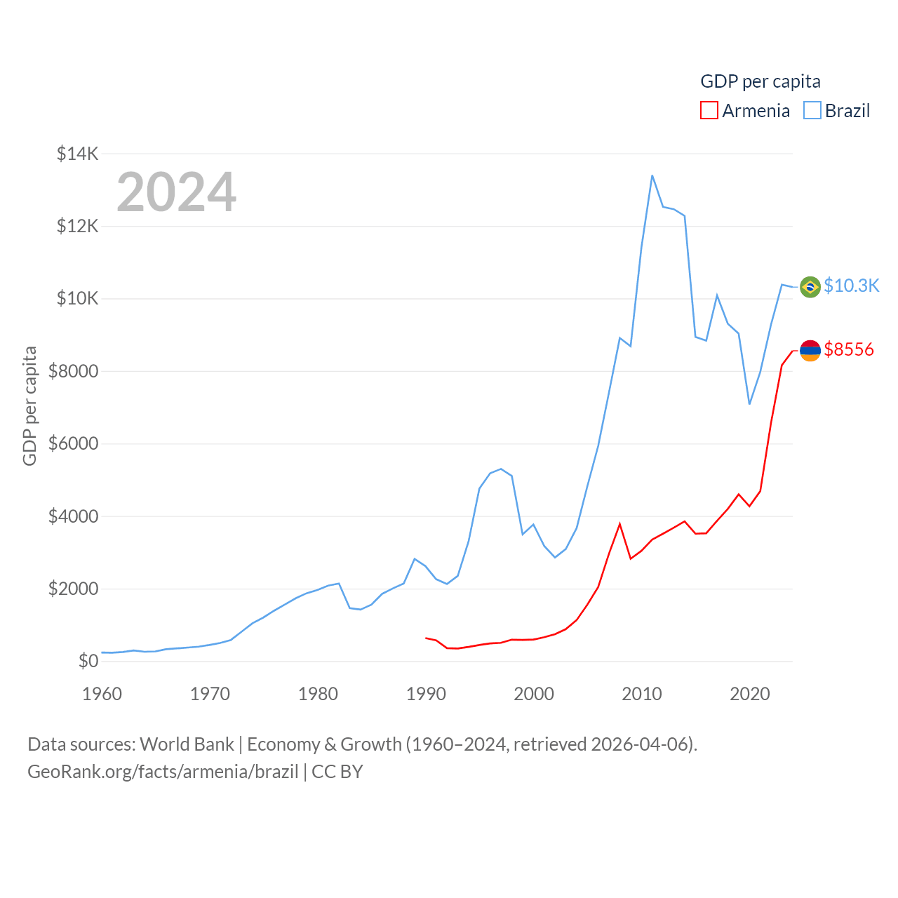 By GDP, Armenia ranks 114/197 ($26B) and Brazil ranks 10/197 ($2.19T). By GDP per capita, Armenia ranks 90/197 ($8,556), while Brazil ranks 85/197 ($10,311).