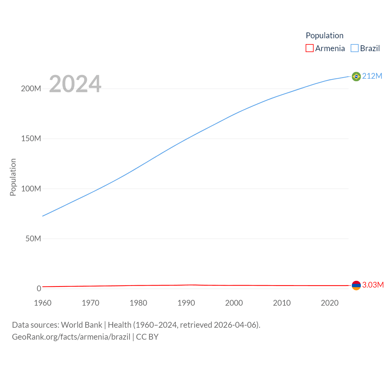 Armenia has a population of 3.03M (ranked 135/197), compared with 212M in Brazil (ranked 7/197). Armenia's land area is 10,888 sq mi versus 3,227,096 sq mi for Brazil (ranked 138th vs. 5th).
