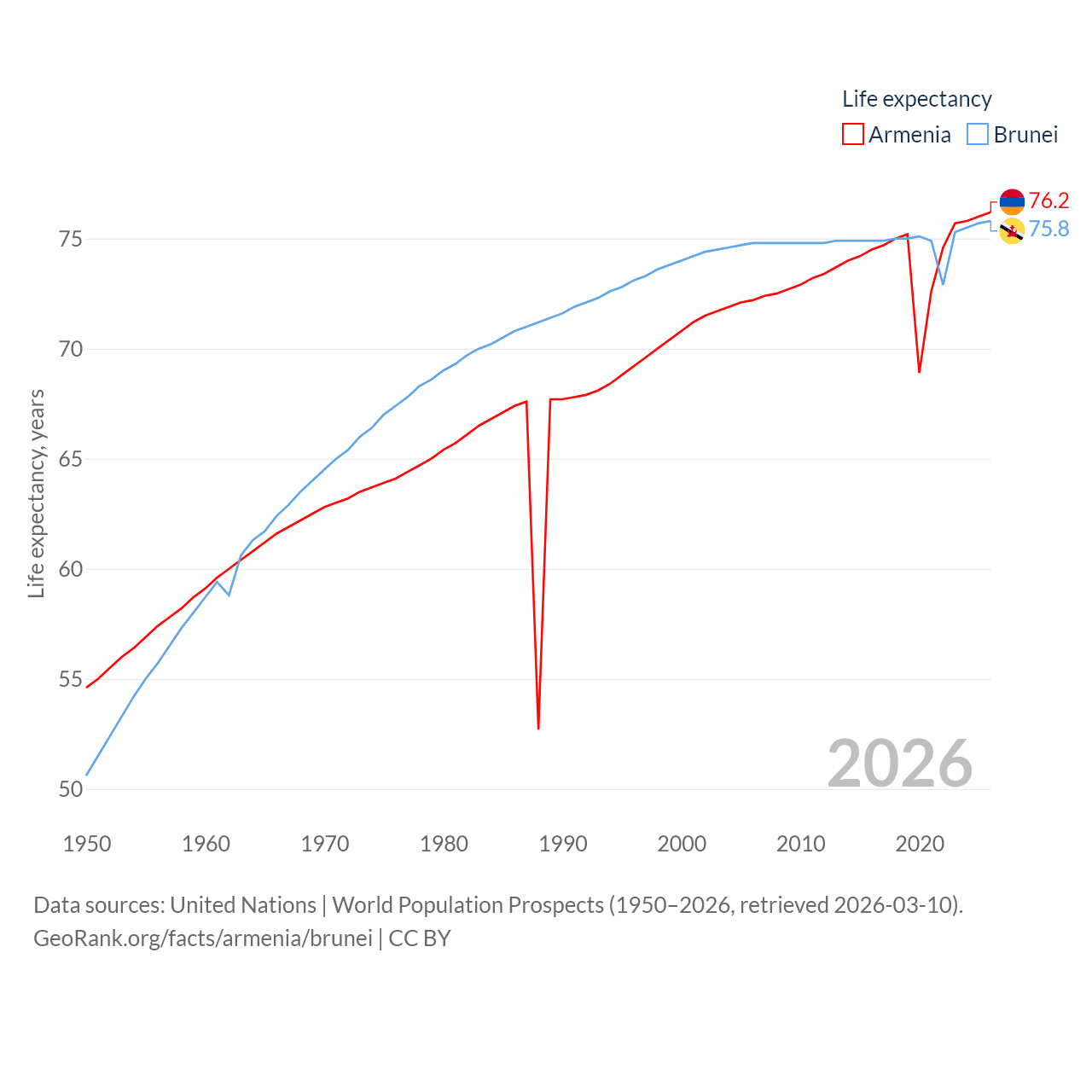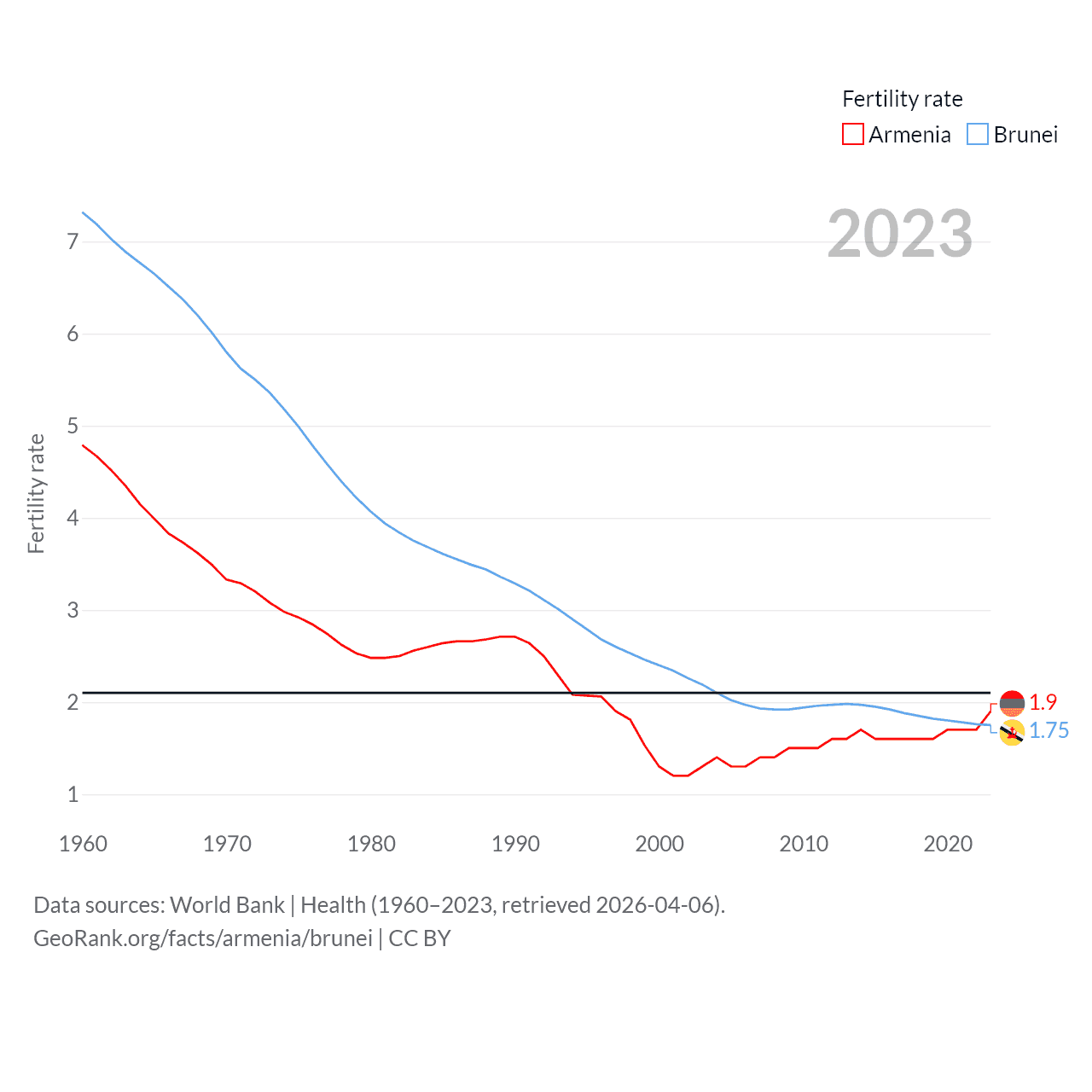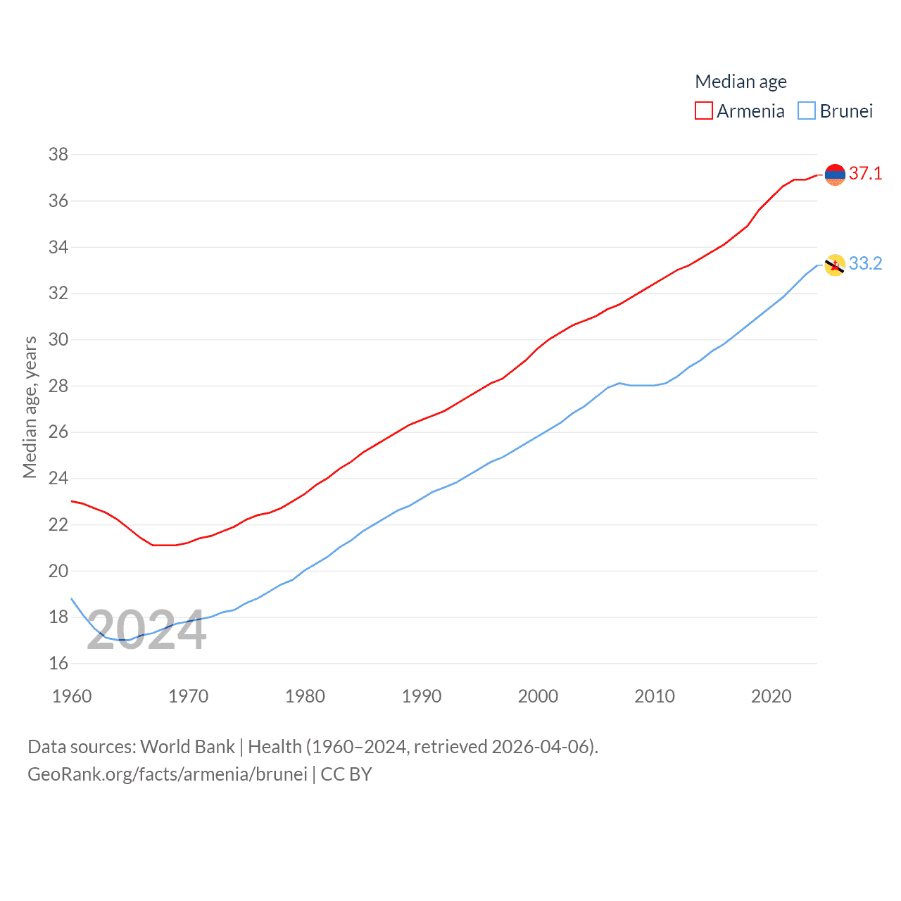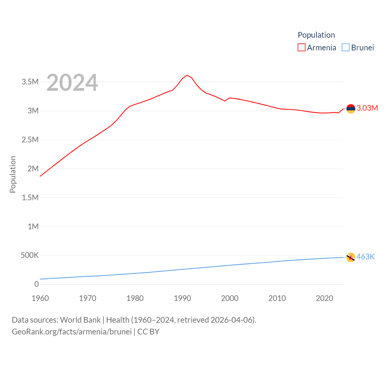 Armenia has a population of 3.03M (ranked 135/197), compared with 463K in Brunei (ranked 170/197). Armenia's land area is 10,888 sq mi versus 2,035 sq mi for Brunei (ranked 138th vs. 165th).