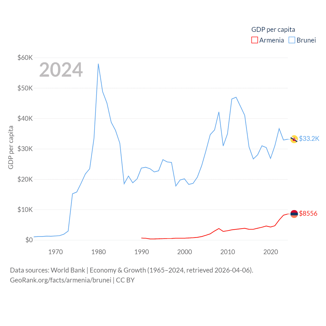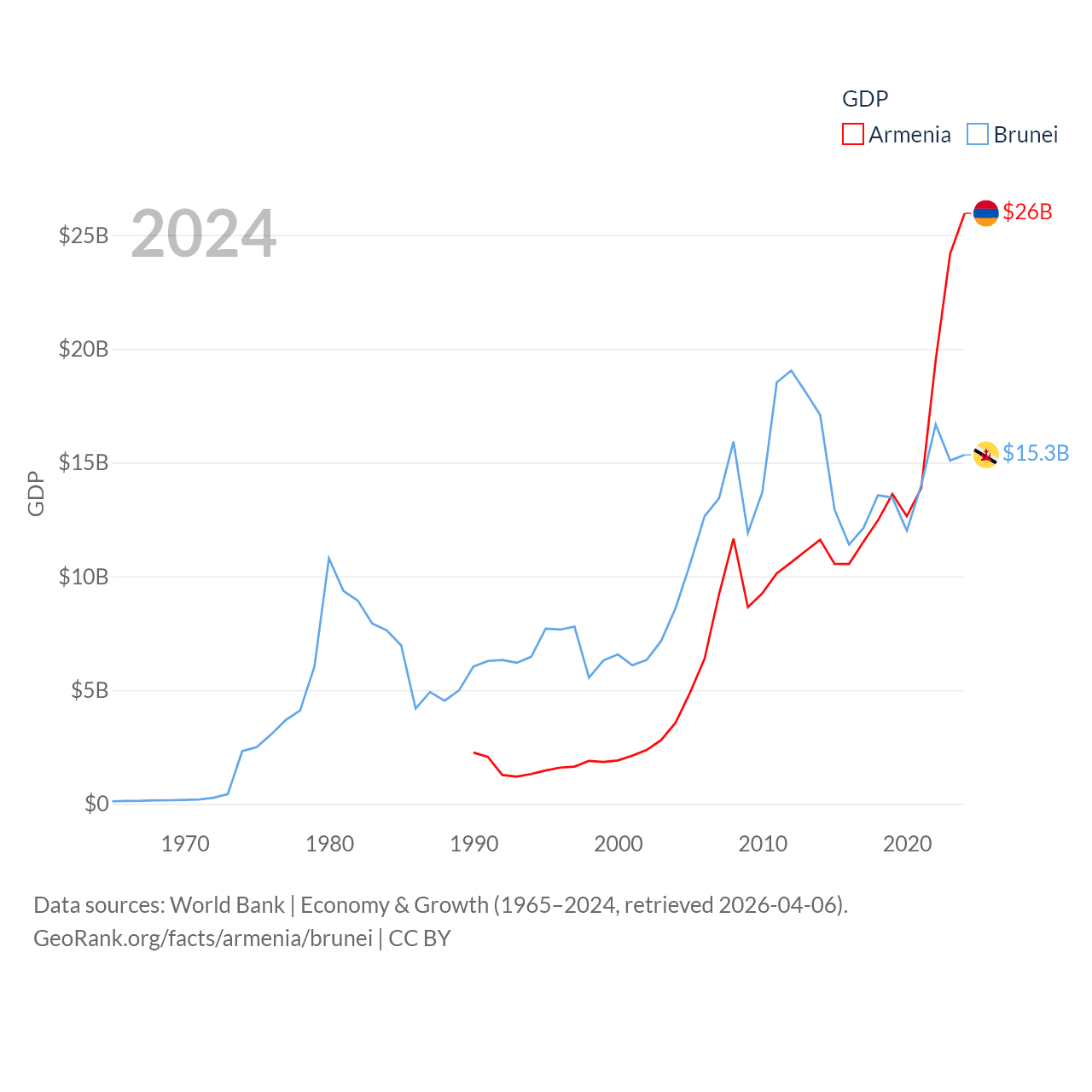 By GDP, Armenia ranks 114/197 ($26B) and Brunei ranks 142/197 ($15.3B). By GDP per capita, Armenia ranks 90/197 ($8,556), while Brunei ranks 36/197 ($33,153).