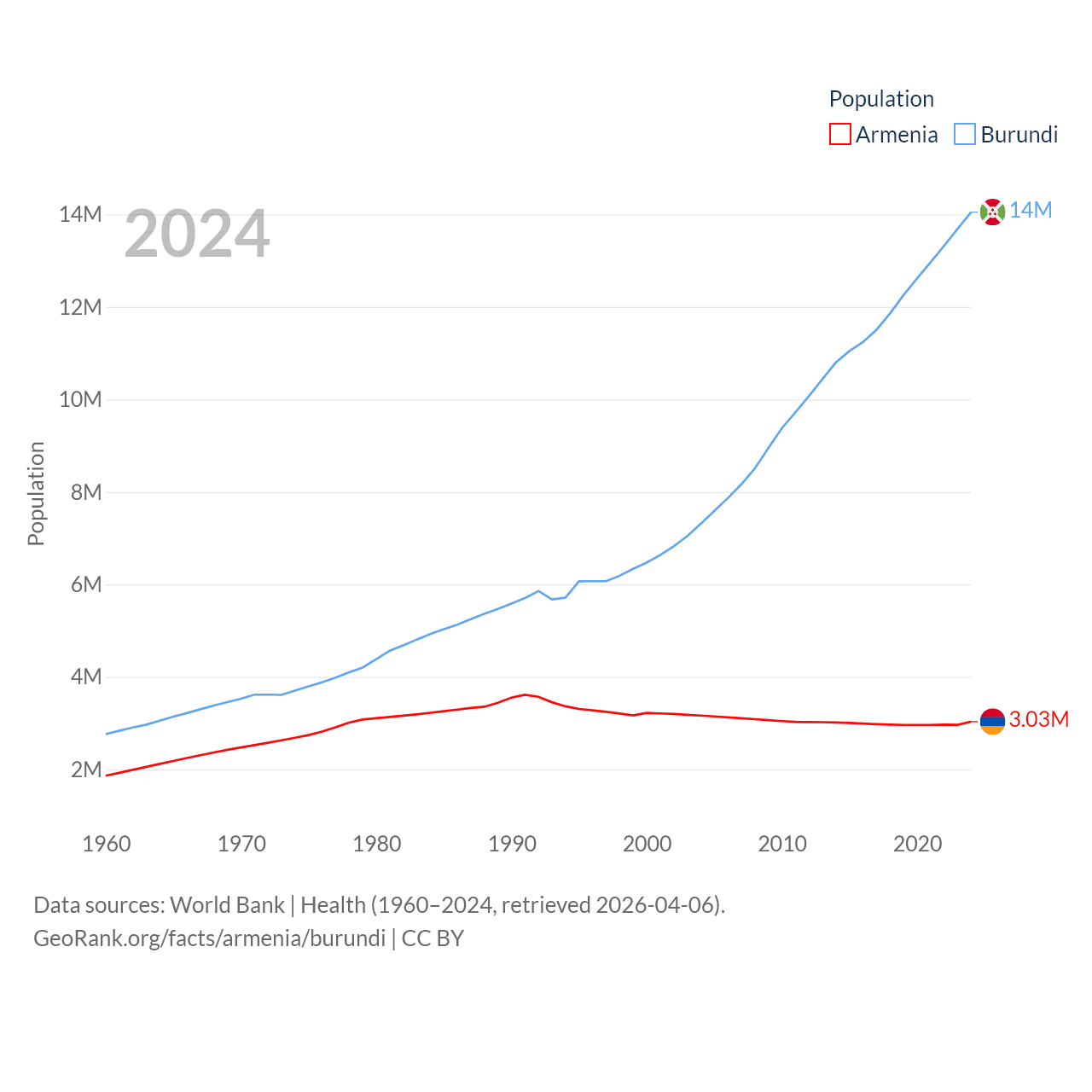 Armenia has a population of 3.03M (ranked 135/197), compared with 14M in Burundi (ranked 78/197). Armenia's land area is 10,888 sq mi versus 9,915 sq mi for Burundi (ranked 138th vs. 144th).