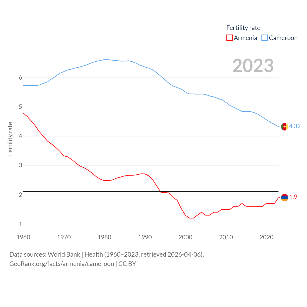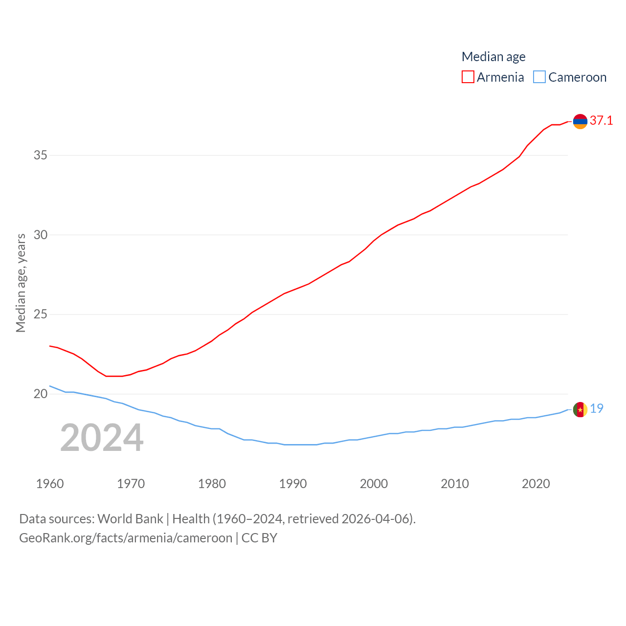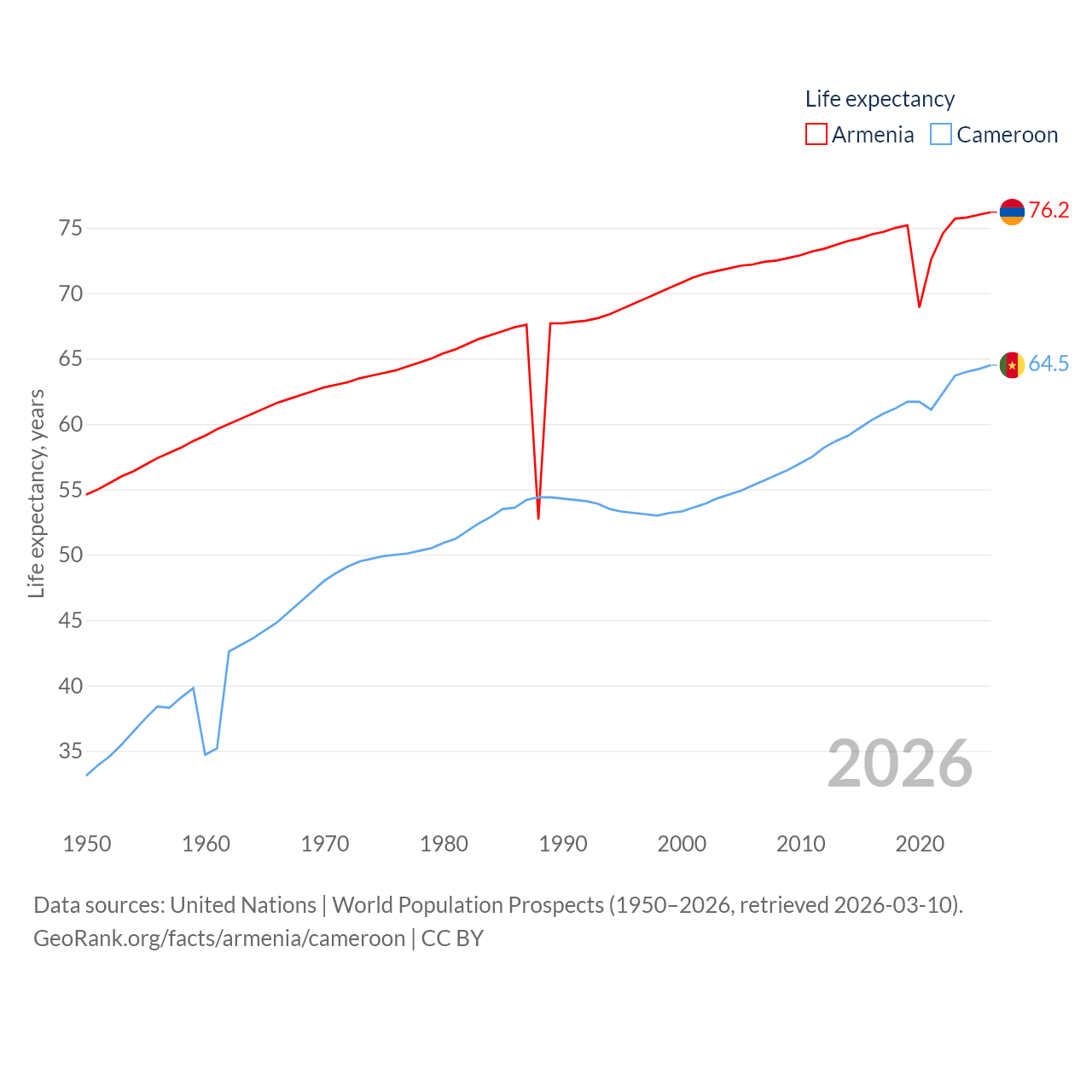 Armenia has a population of 3.03M (ranked 135/197), compared with 29.1M in Cameroon (ranked 52/197). Armenia's land area is 10,888 sq mi versus 182,514 sq mi for Cameroon (ranked 138th vs. 52nd).
