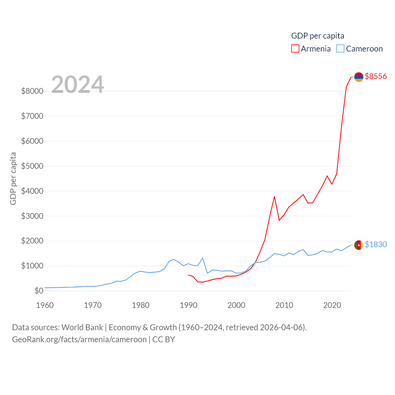 By GDP, Armenia ranks 114/197 ($26B) and Cameroon ranks 91/197 ($53.3B). By GDP per capita, Armenia ranks 90/197 ($8,556), while Cameroon ranks 158/197 ($1,830).