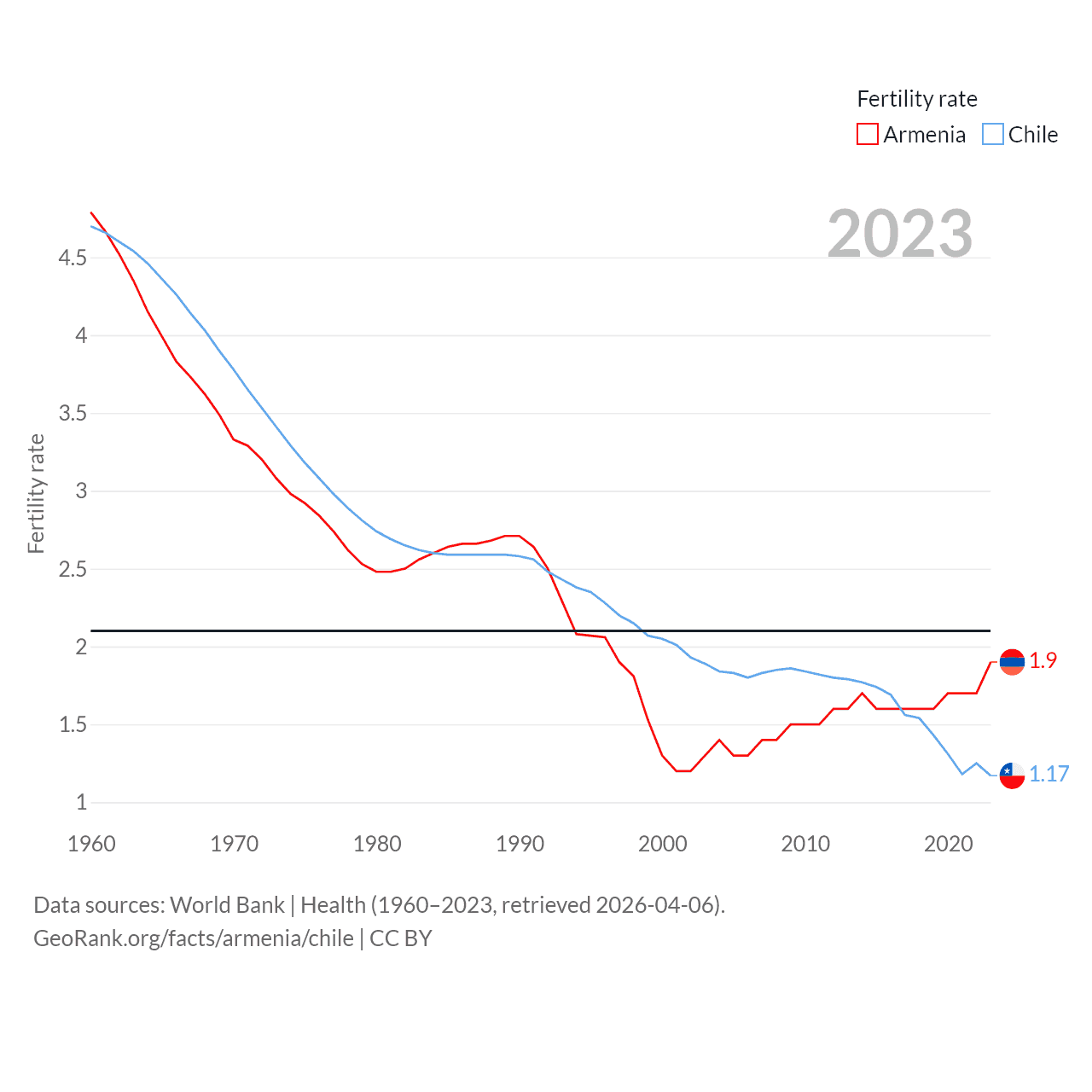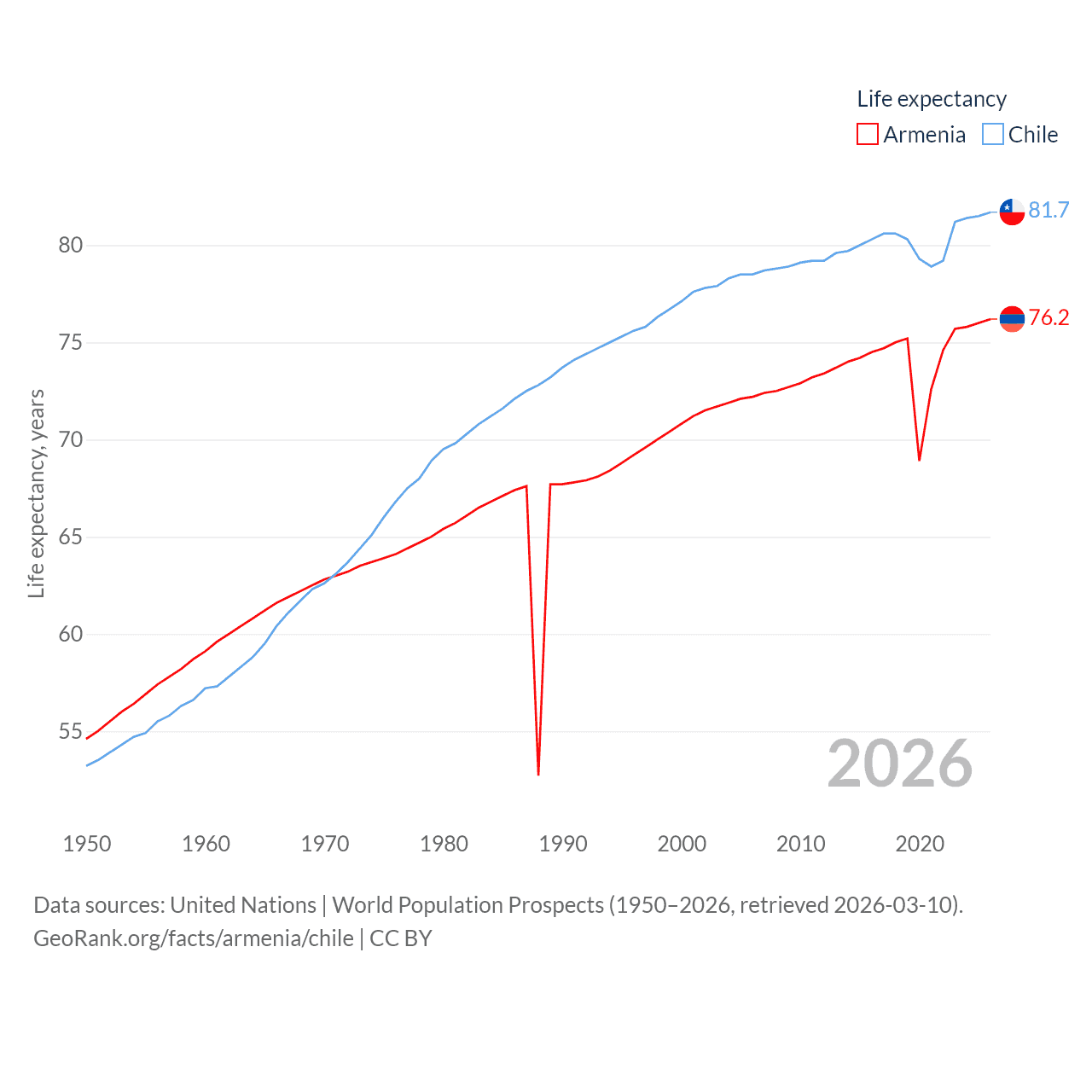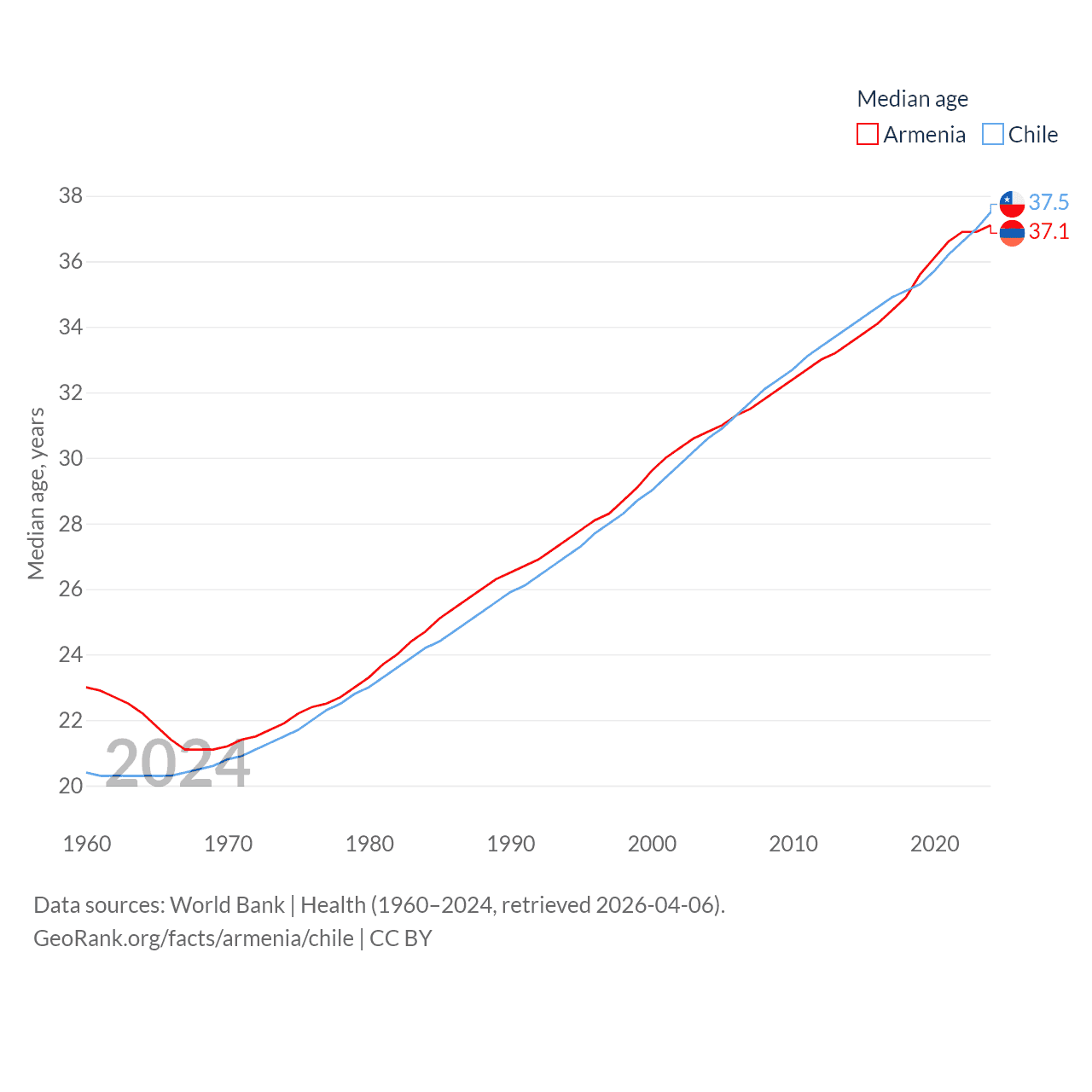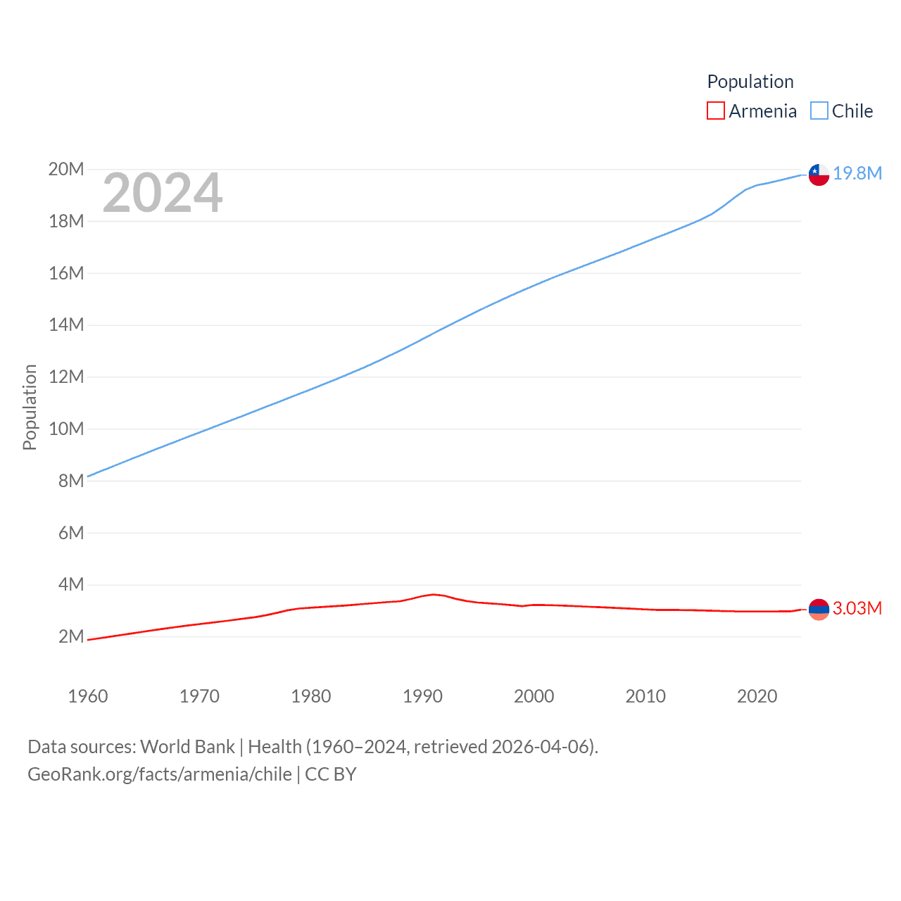 Armenia has a population of 3.03M (ranked 135/197), compared with 19.8M in Chile (ranked 66/197). Armenia's land area is 10,888 sq mi versus 286,809 sq mi for Chile (ranked 138th vs. 38th).