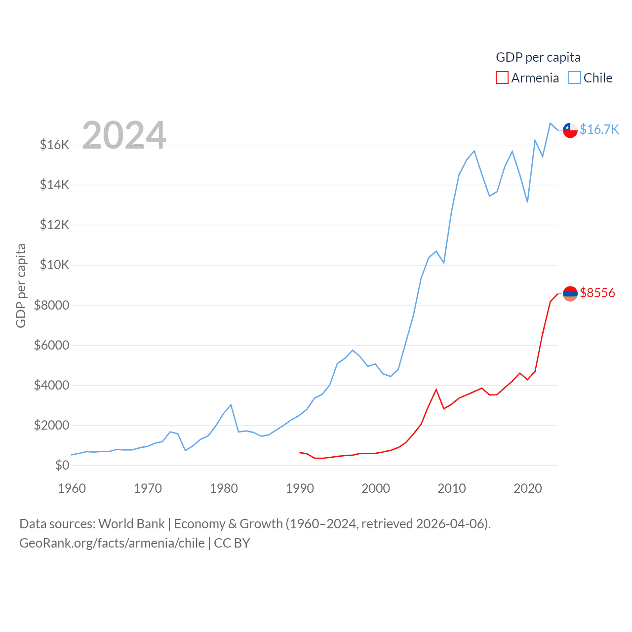 By GDP, Armenia ranks 114/197 ($26B) and Chile ranks 45/197 ($330B). By GDP per capita, Armenia ranks 90/197 ($8,556), while Chile ranks 65/197 ($16,710).
