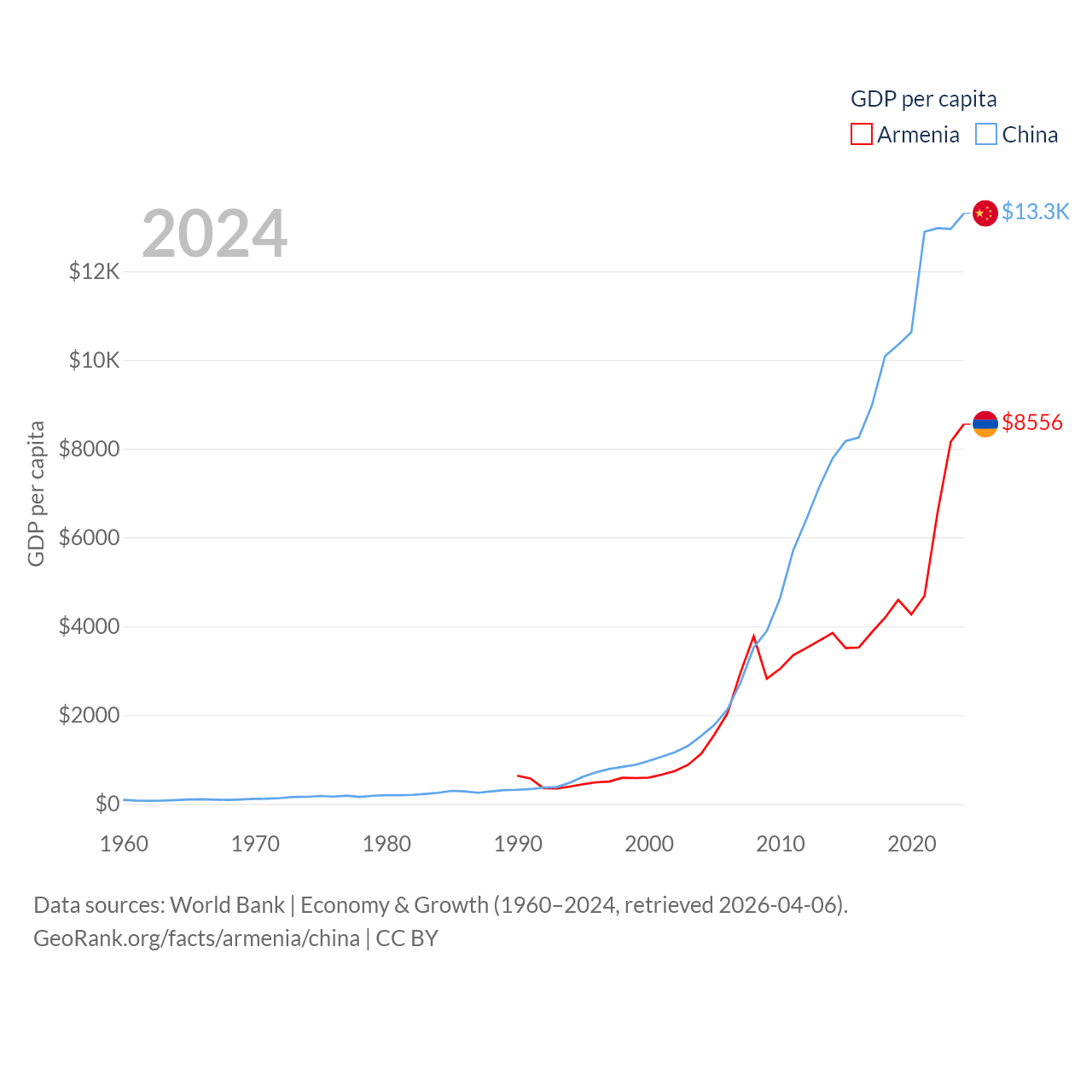 By GDP, Armenia ranks 114/197 ($26B) and China ranks 2/197 ($18.7T). By GDP per capita, Armenia ranks 90/197 ($8,556), while China ranks 76/197 ($13,303).
