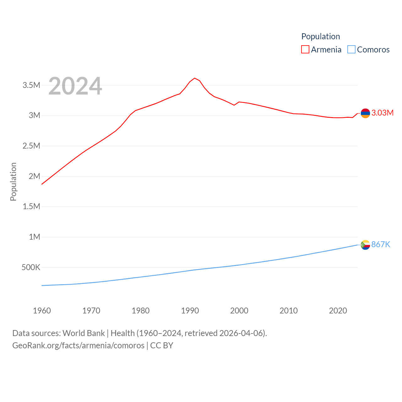 Armenia has a population of 3.03M (ranked 135/197), compared with 867K in Comoros (ranked 160/197). Armenia's land area is 10,888 sq mi versus 719 sq mi for Comoros (ranked 138th vs. 171st).