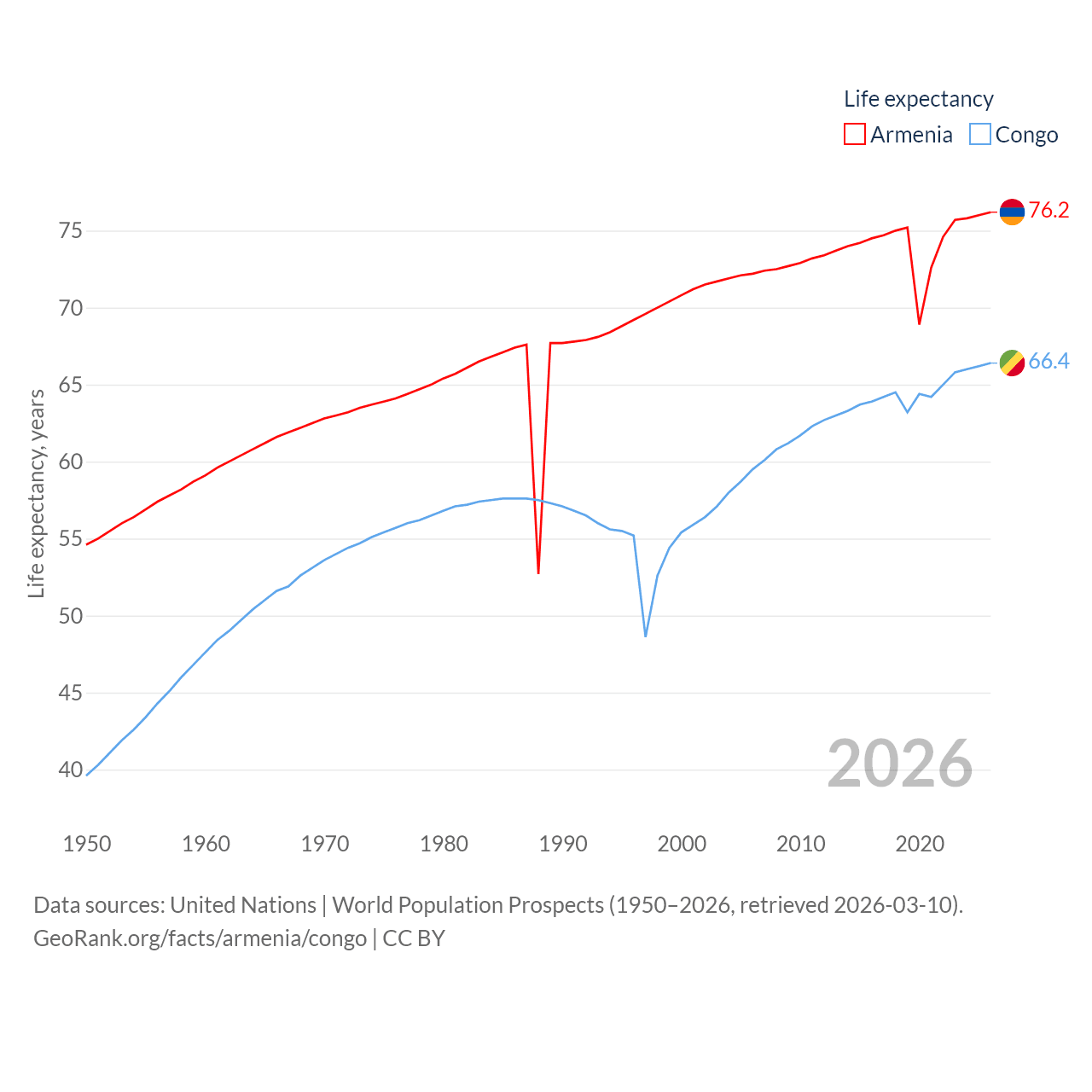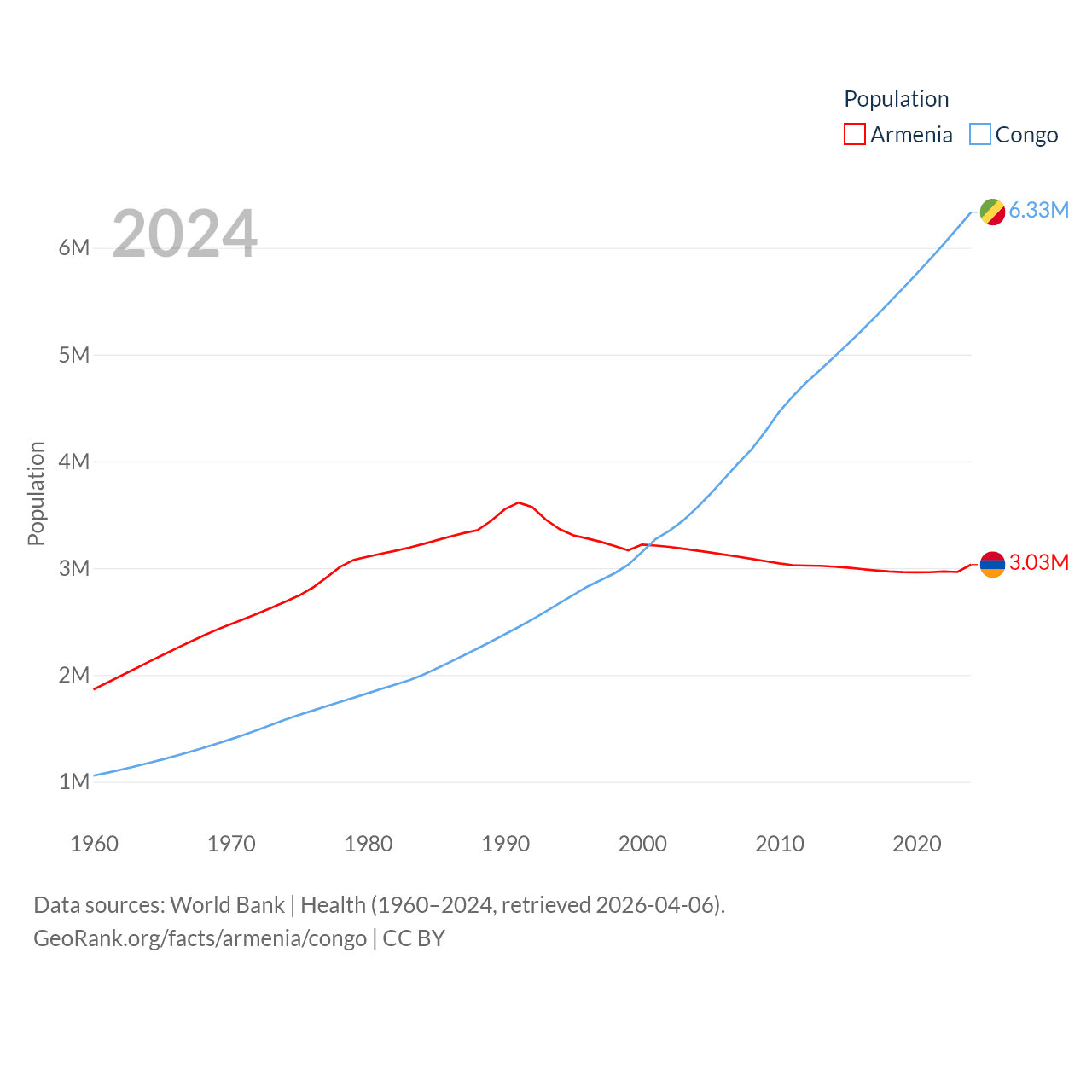 Armenia has a population of 3.03M (ranked 135/197), compared with 6.33M in The Congo (ranked 112/197). Armenia's land area is 10,888 sq mi versus 131,854 sq mi for The Congo (ranked 138th vs. 64th).