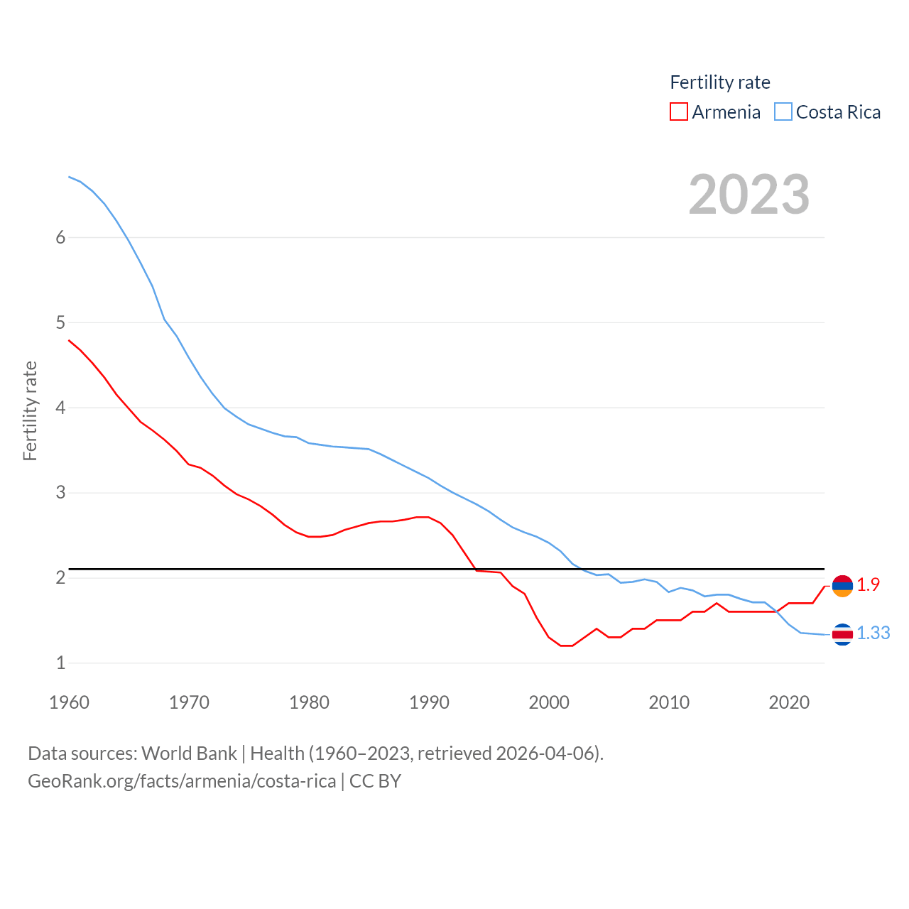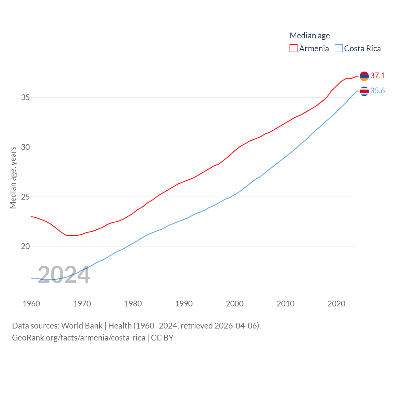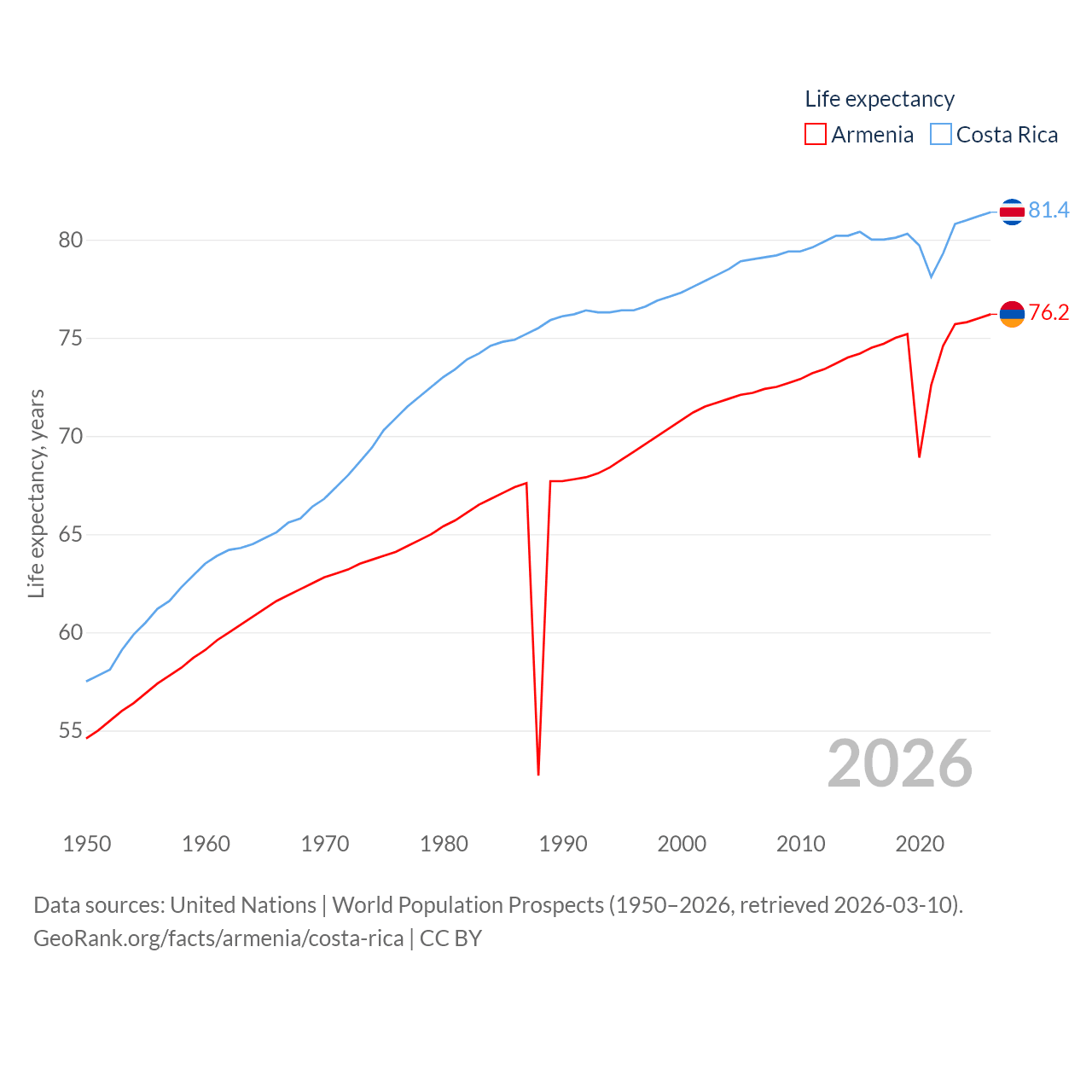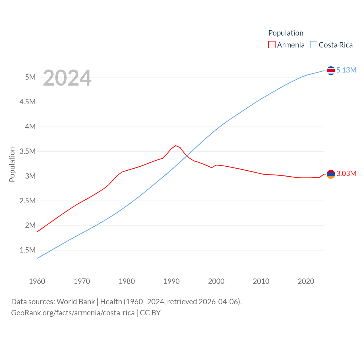 Armenia has a population of 3.03M (ranked 135/197), compared with 5.13M in Costa Rica (ranked 126/197). Armenia's land area is 10,888 sq mi versus 19,714 sq mi for Costa Rica (ranked 138th vs. 126th).