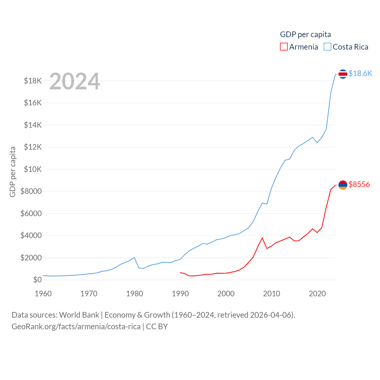 By GDP, Armenia ranks 114/197 ($26B) and Costa Rica ranks 73/197 ($95.4B). By GDP per capita, Armenia ranks 90/197 ($8,556), while Costa Rica ranks 62/197 ($18,587).