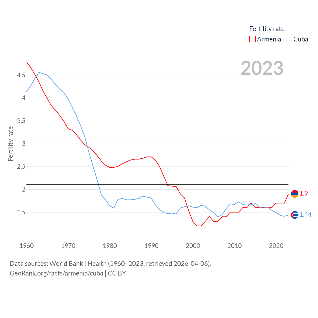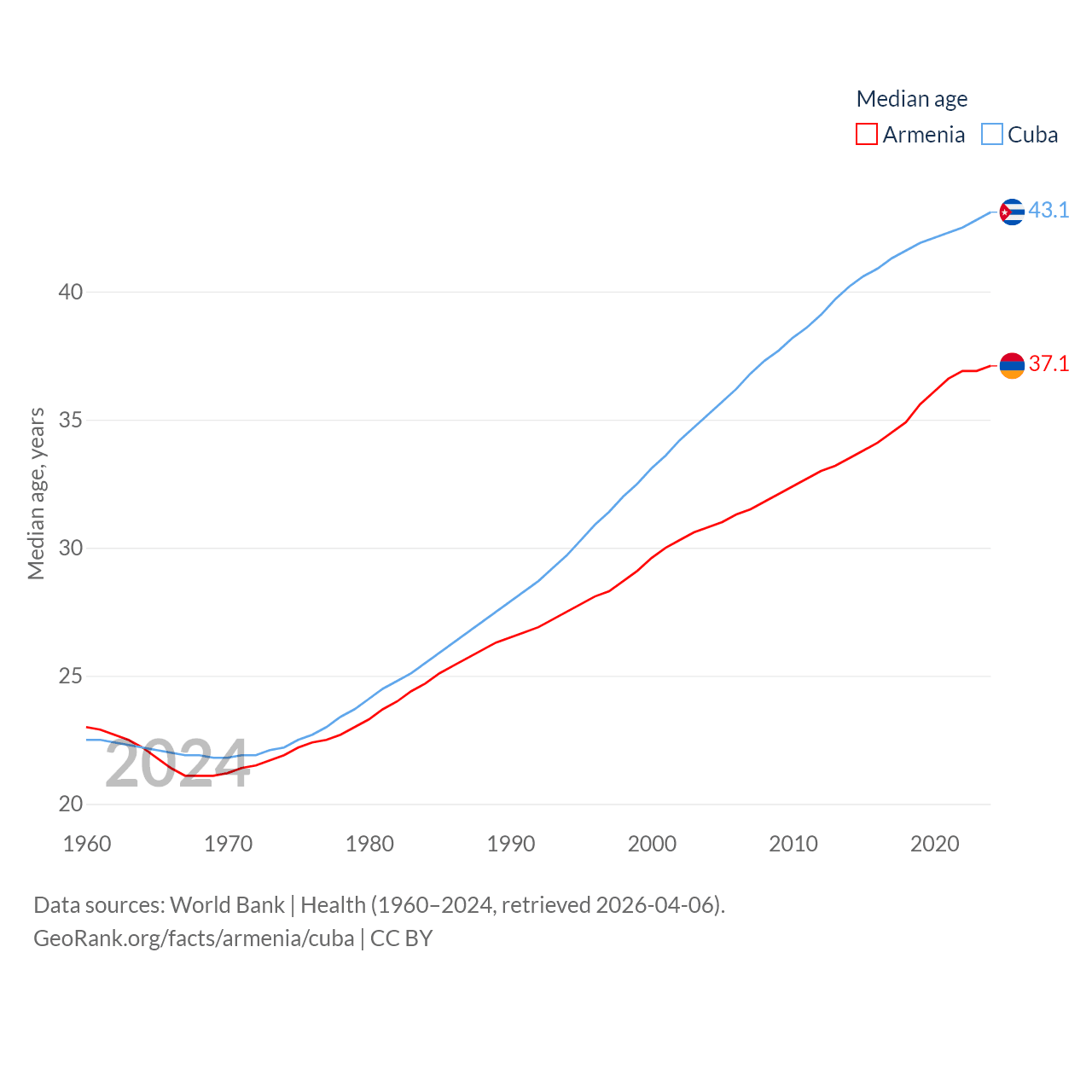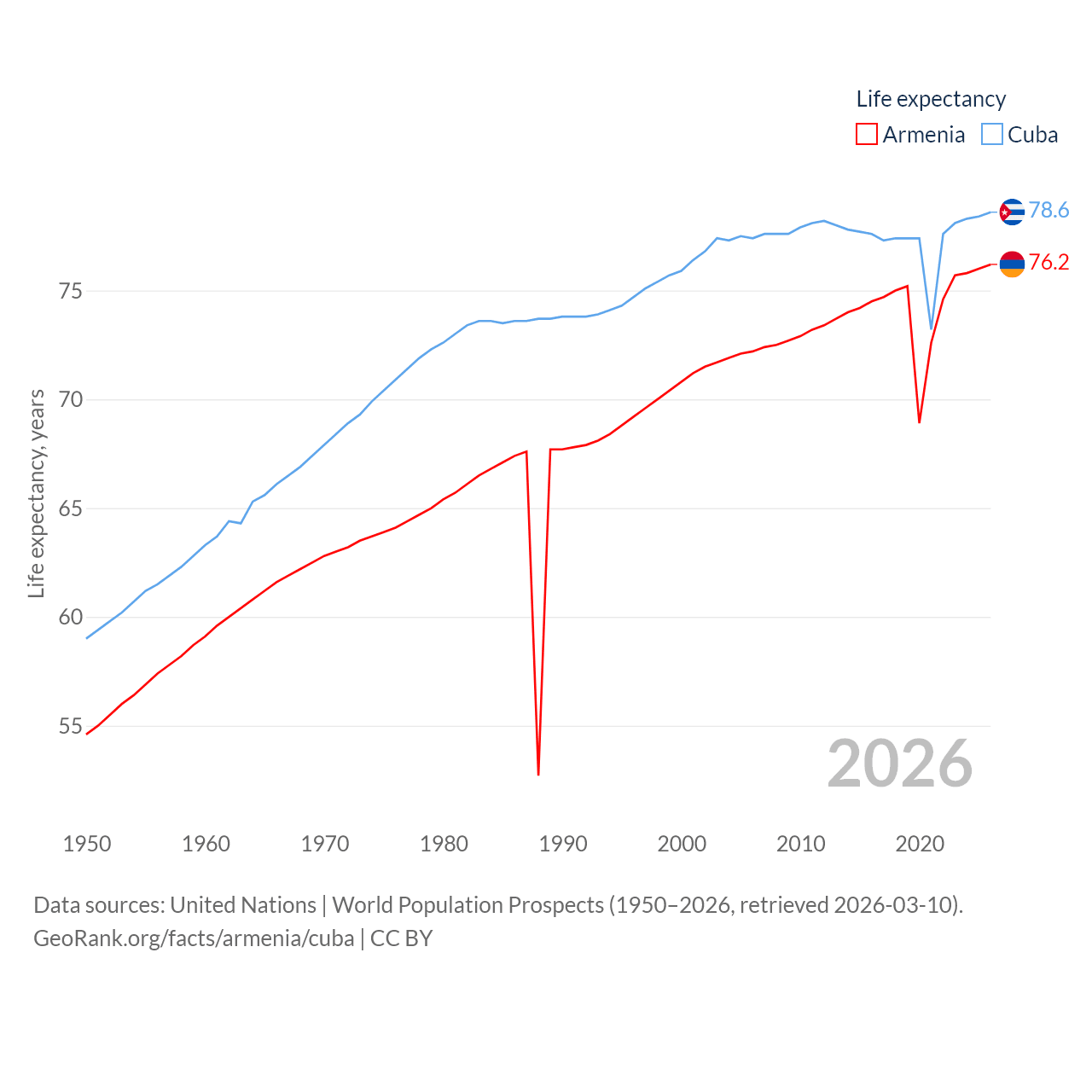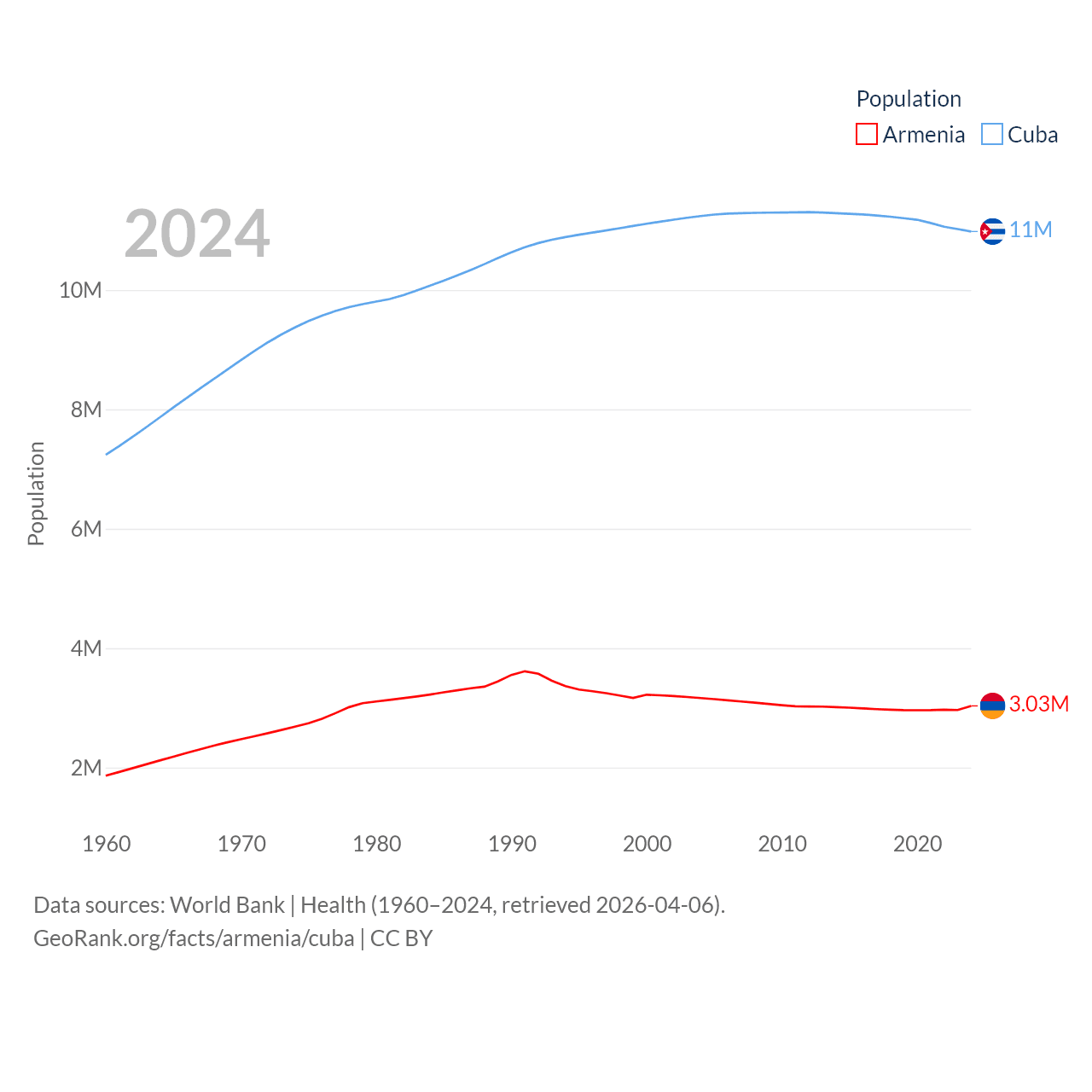 Armenia has a population of 3.03M (ranked 135/197), compared with 11M in Cuba (ranked 87/197). Armenia's land area is 10,888 sq mi versus 40,077 sq mi for Cuba (ranked 138th vs. 103rd).