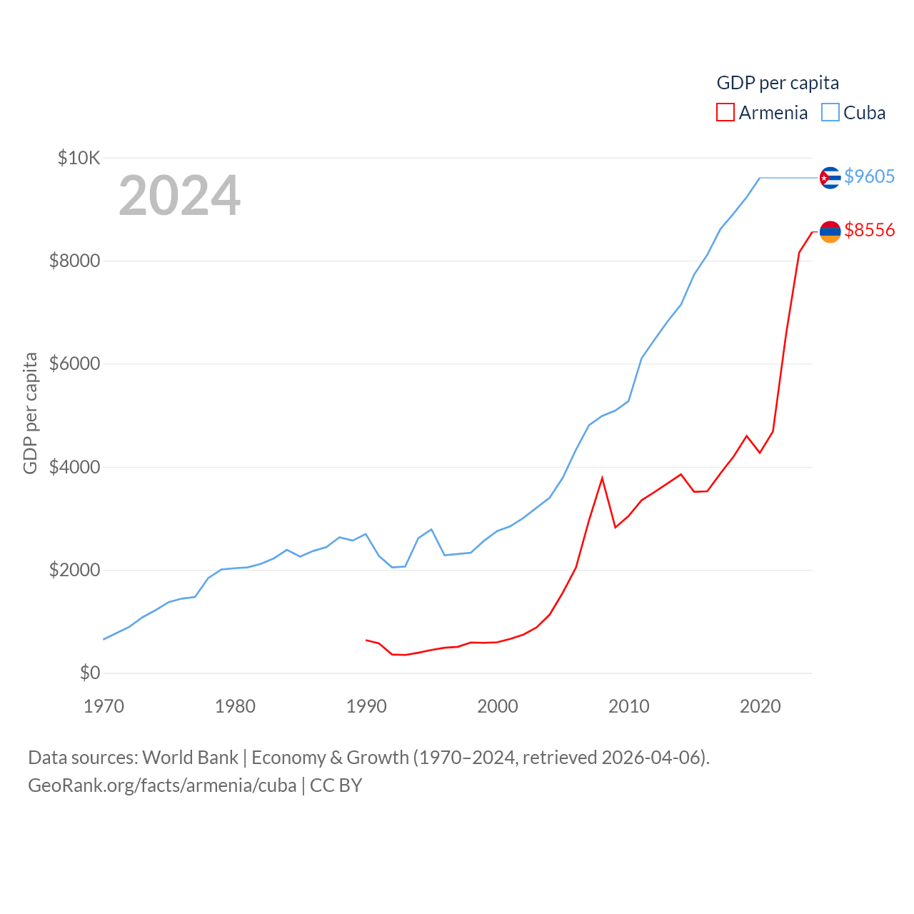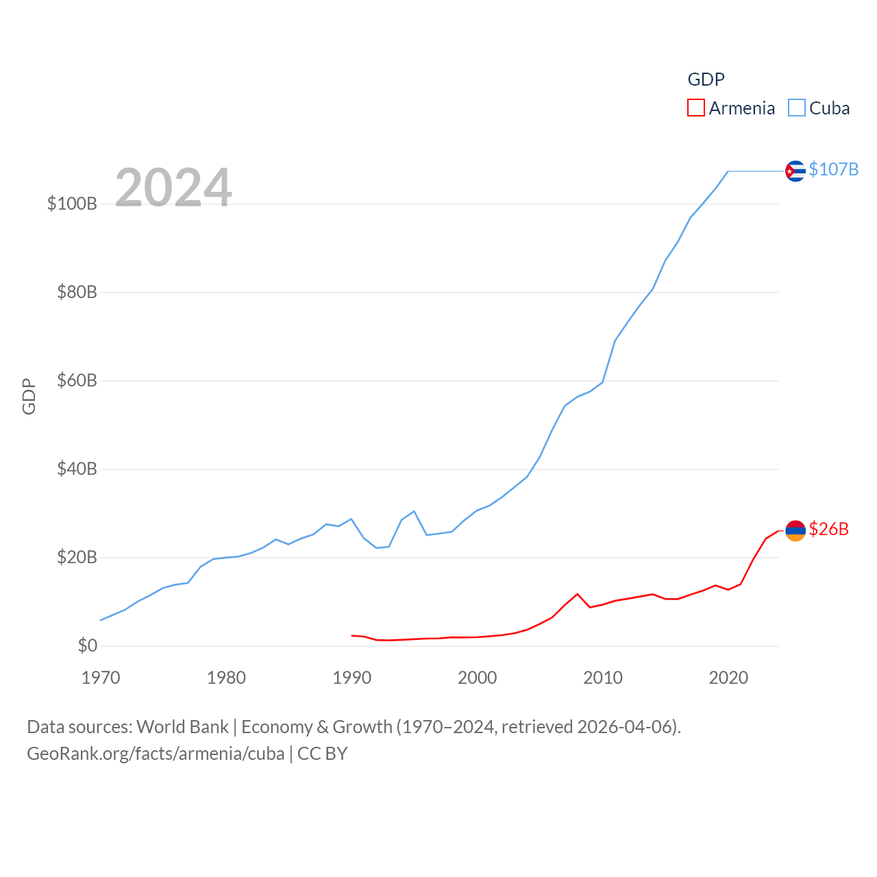 By GDP, Armenia ranks 114/197 ($26B) and Cuba ranks 69/197 ($107B). By GDP per capita, Armenia ranks 90/197 ($8,556), while Cuba ranks 86/197 ($9,605).