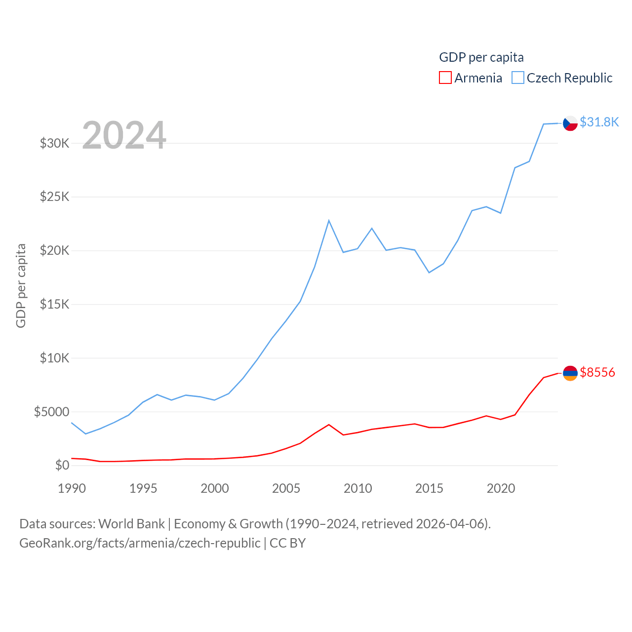 Data sources: World Bank | Economy & Growth (1990–2024, retrieved 2026-04-06).
