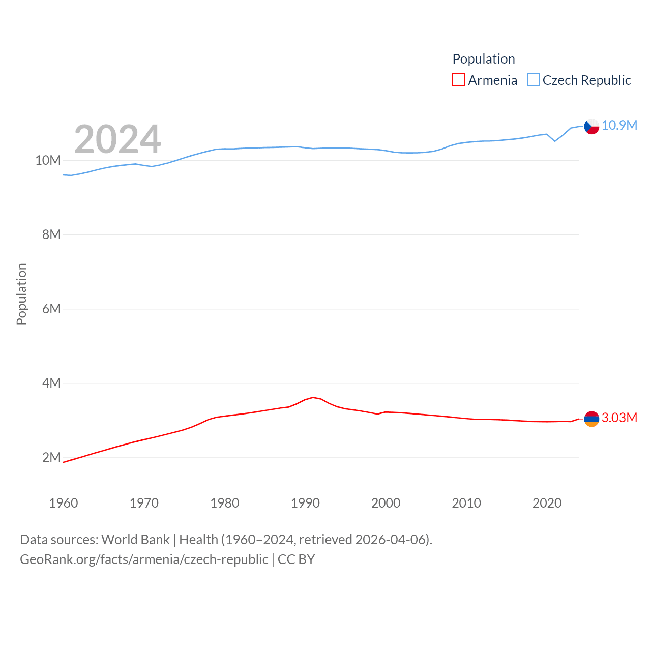 Armenia has a population of 3.03M (ranked 135/197), compared with 10.9M in The Czech Republic (ranked 88/197). Armenia's land area is 10,888 sq mi versus 29,794 sq mi for The Czech Republic (ranked 138th vs. 114th).