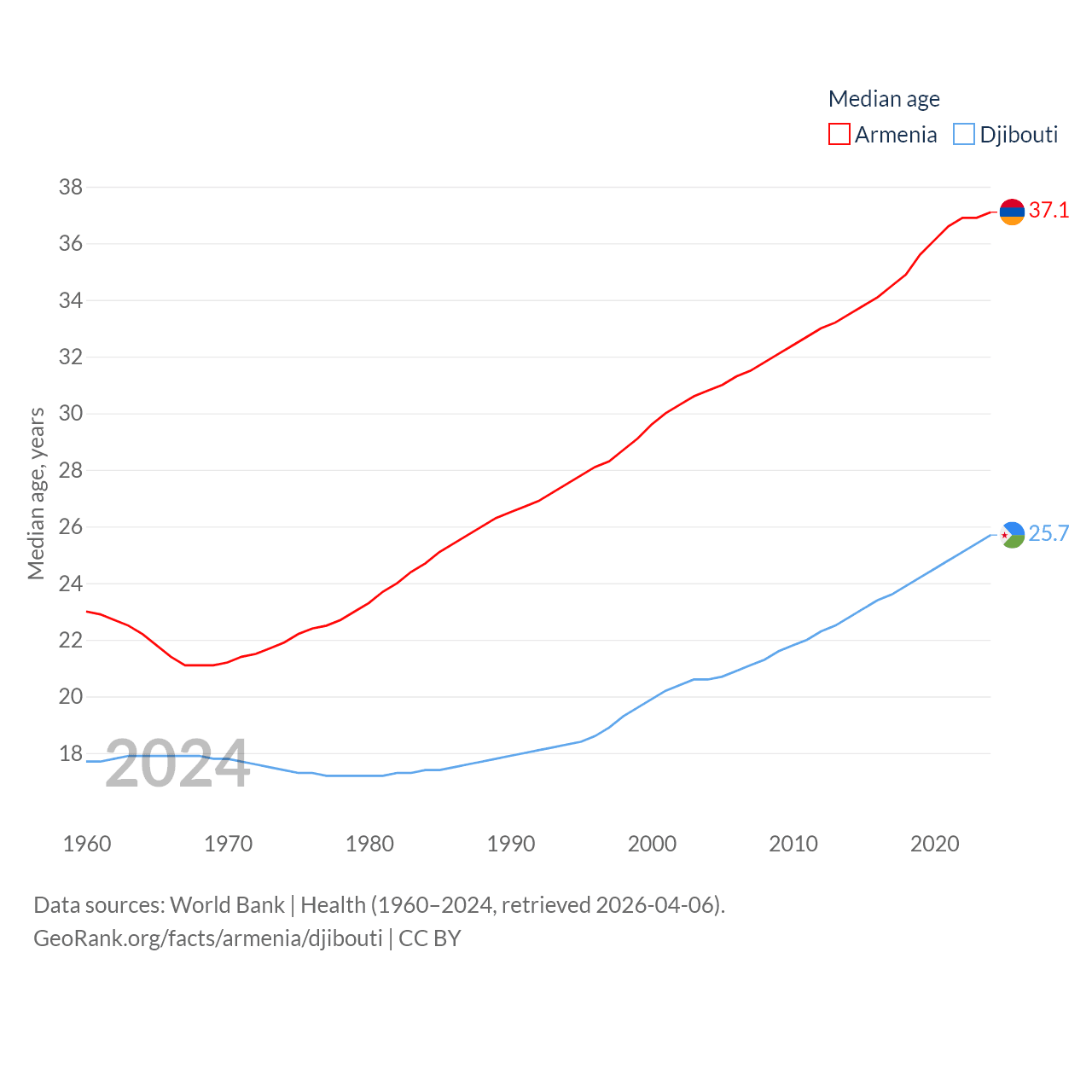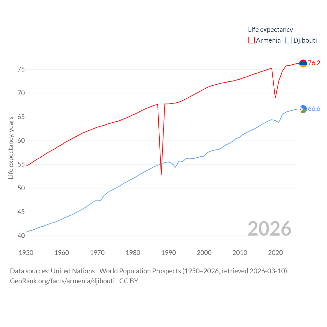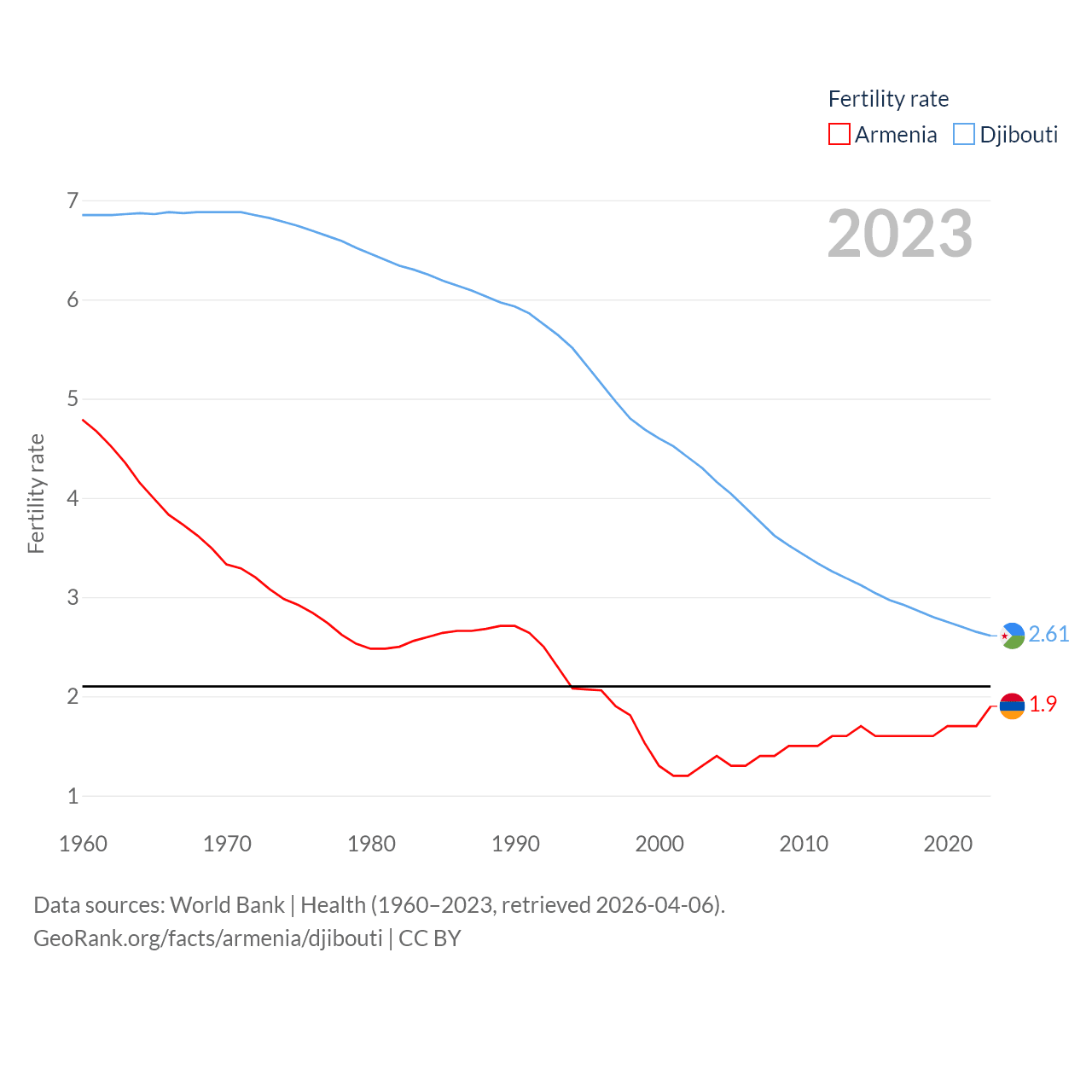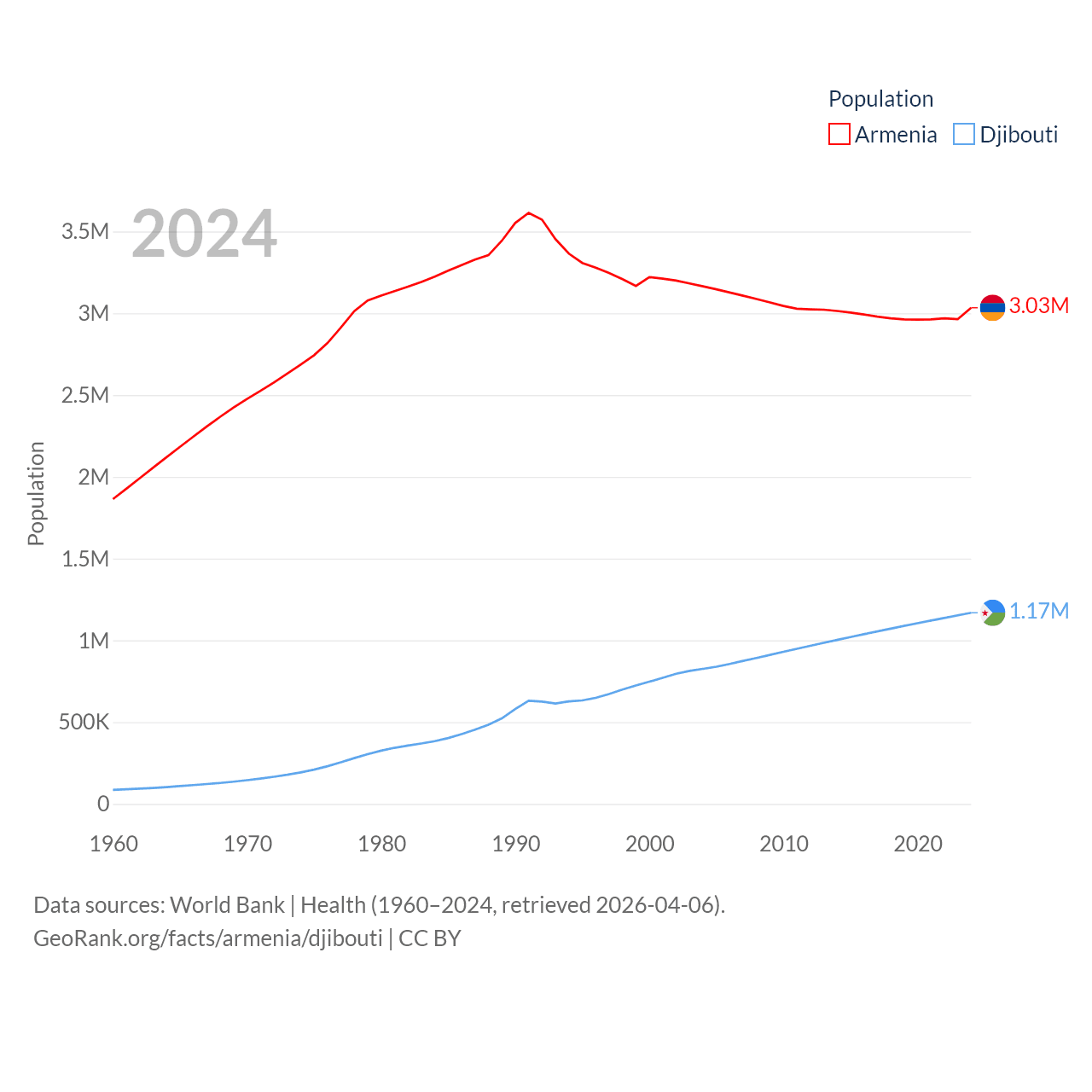 Armenia has a population of 3.03M (ranked 135/197), compared with 1.17M in Djibouti (ranked 158/197). Armenia's land area is 10,888 sq mi versus 8,950 sq mi for Djibouti (ranked 138th vs. 147th).
