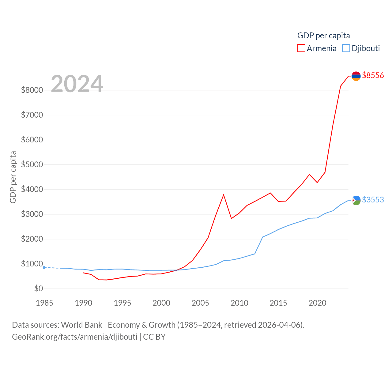 By GDP, Armenia ranks 114/197 ($26B) and Djibouti ranks 165/197 ($4.15B). By GDP per capita, Armenia ranks 90/197 ($8,556), while Djibouti ranks 133/197 ($3,553).