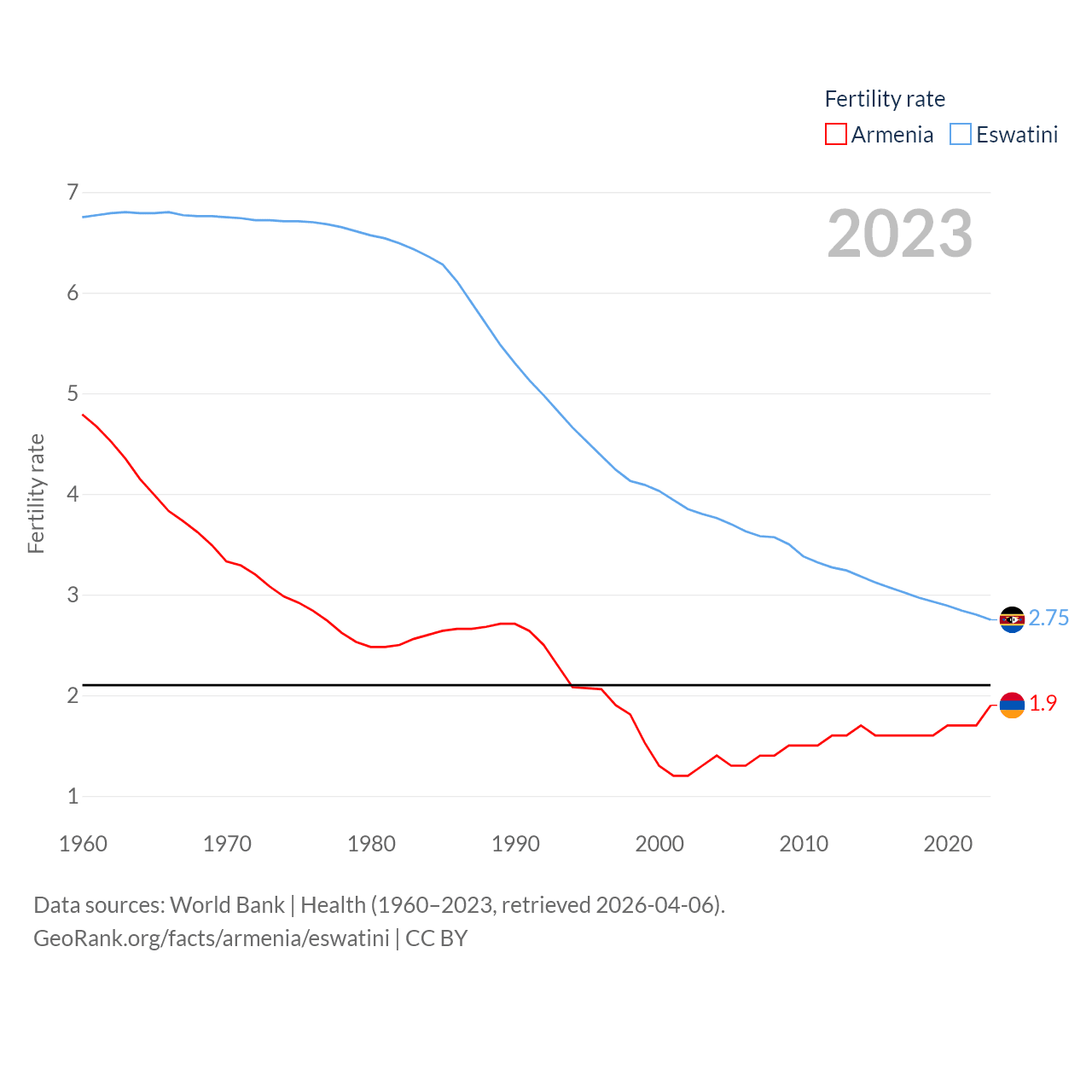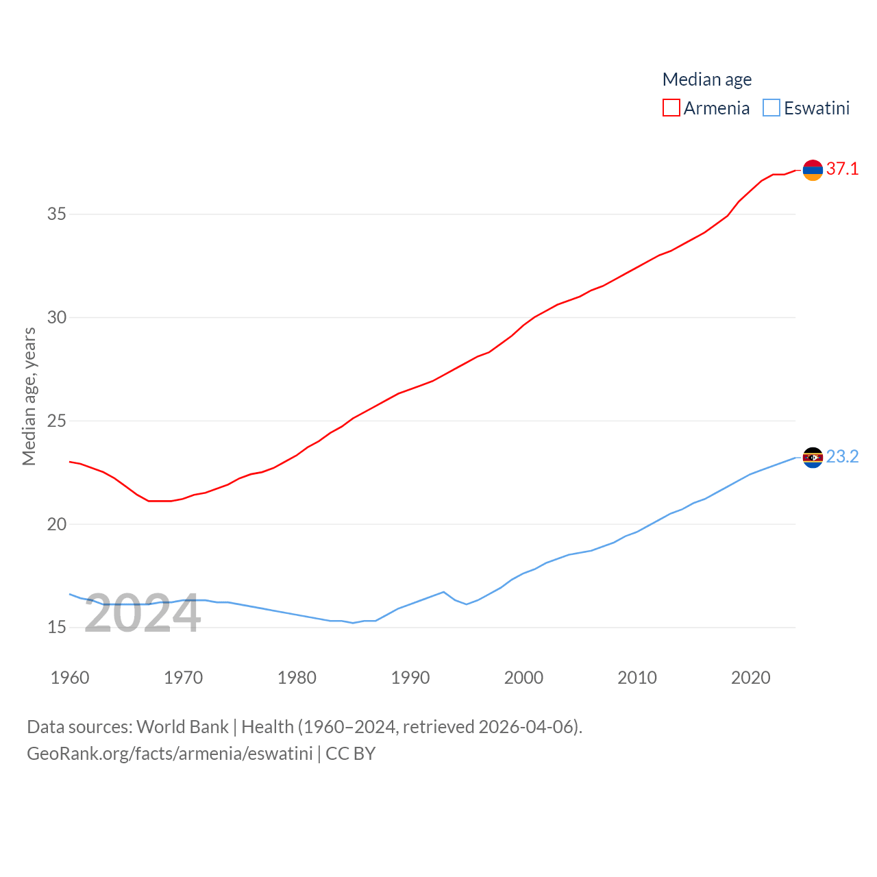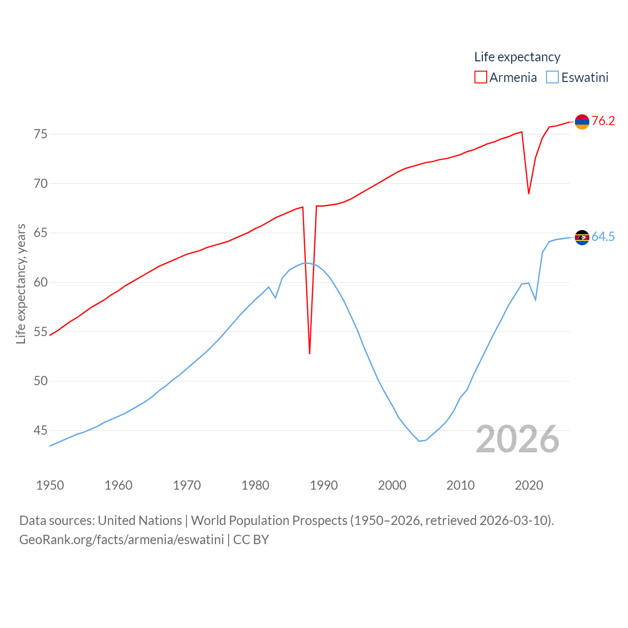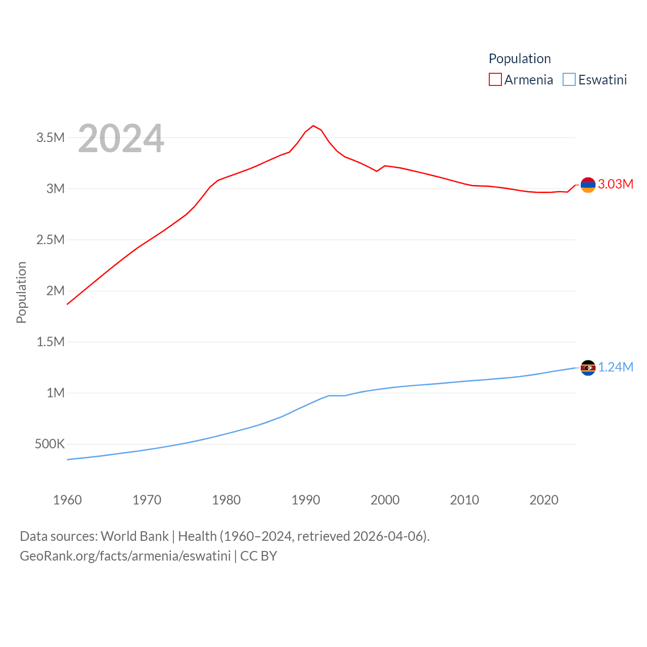 Armenia has a population of 3.03M (ranked 135/197), compared with 1.24M in Eswatini (ranked 157/197). Armenia's land area is 10,888 sq mi versus 6,641 sq mi for Eswatini (ranked 138th vs. 154th).