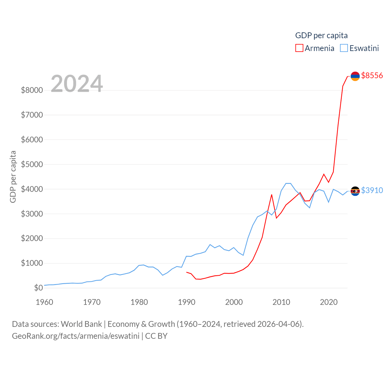 By GDP, Armenia ranks 114/197 ($26B) and Eswatini ranks 162/197 ($4.86B). By GDP per capita, Armenia ranks 90/197 ($8,556), while Eswatini ranks 131/197 ($3,910).