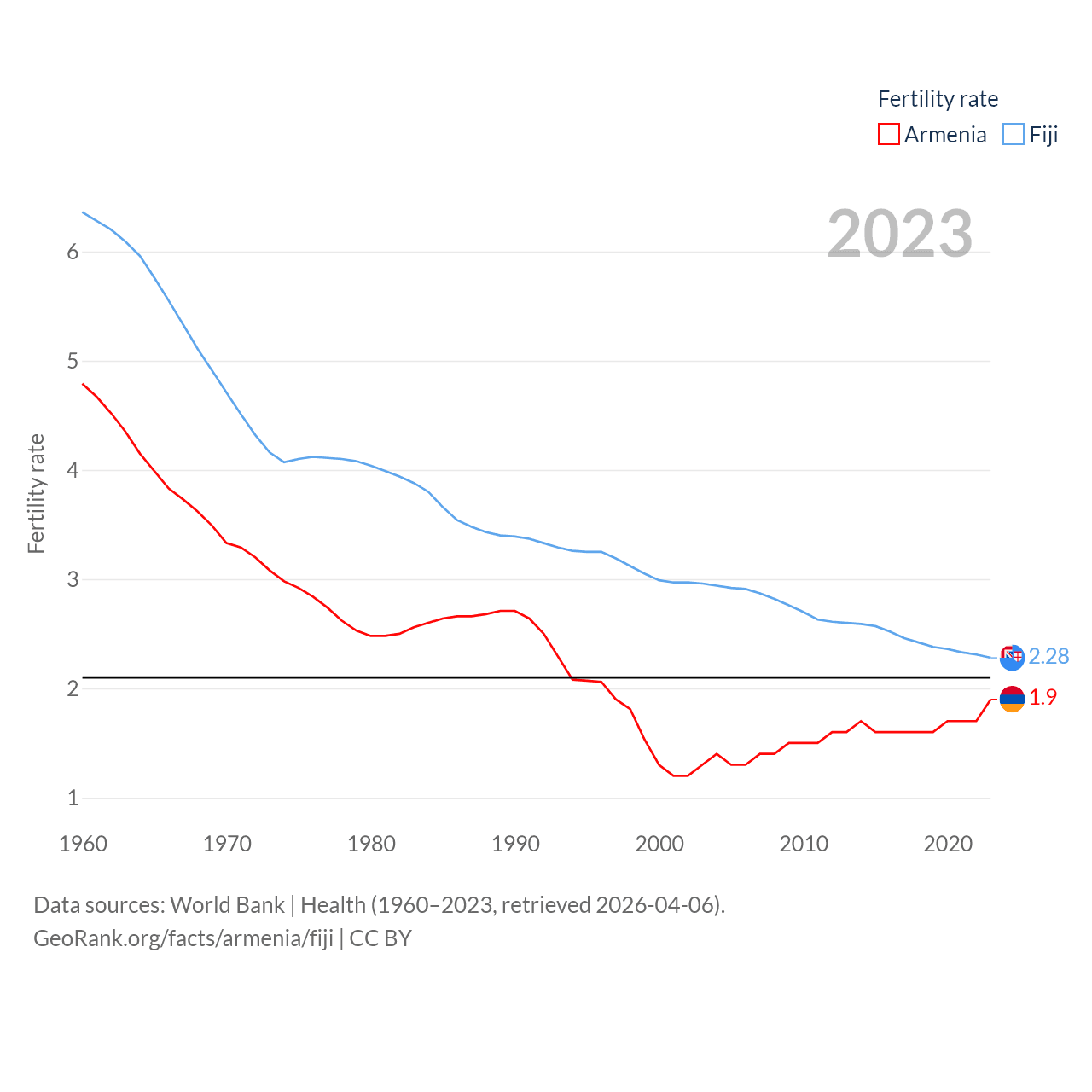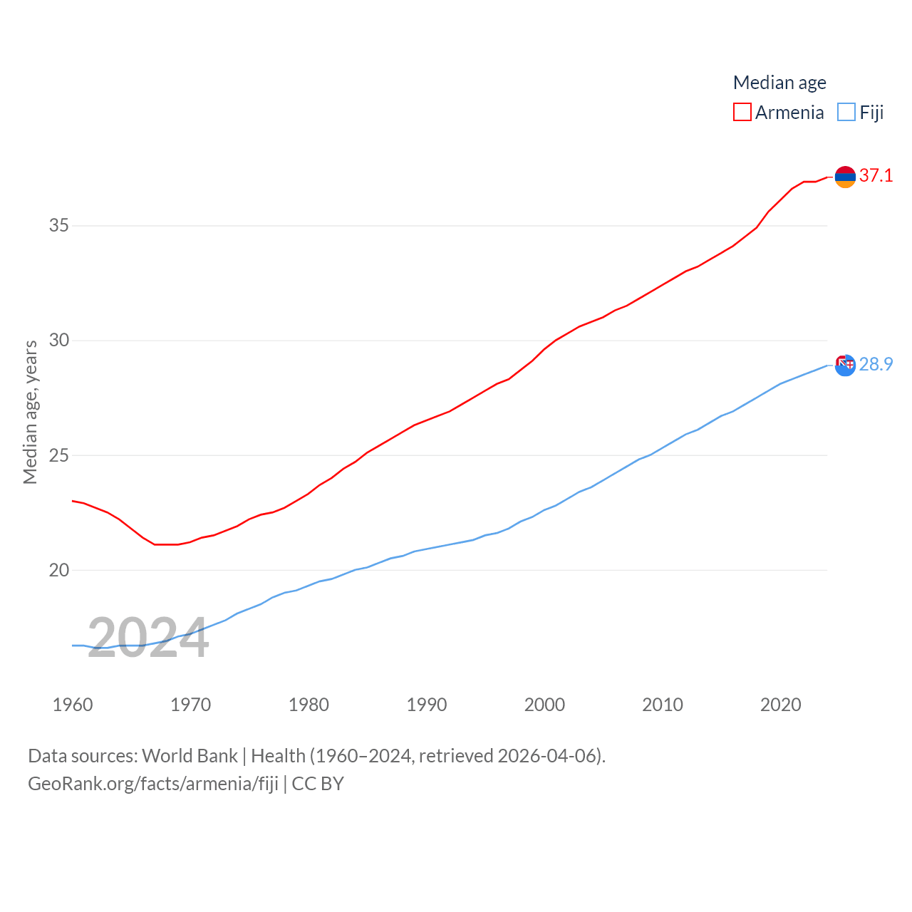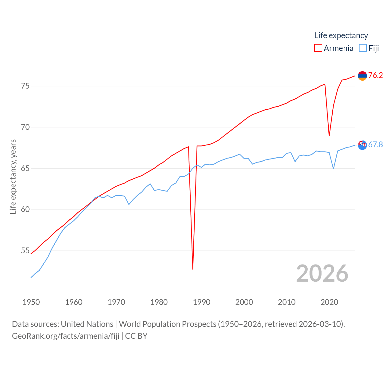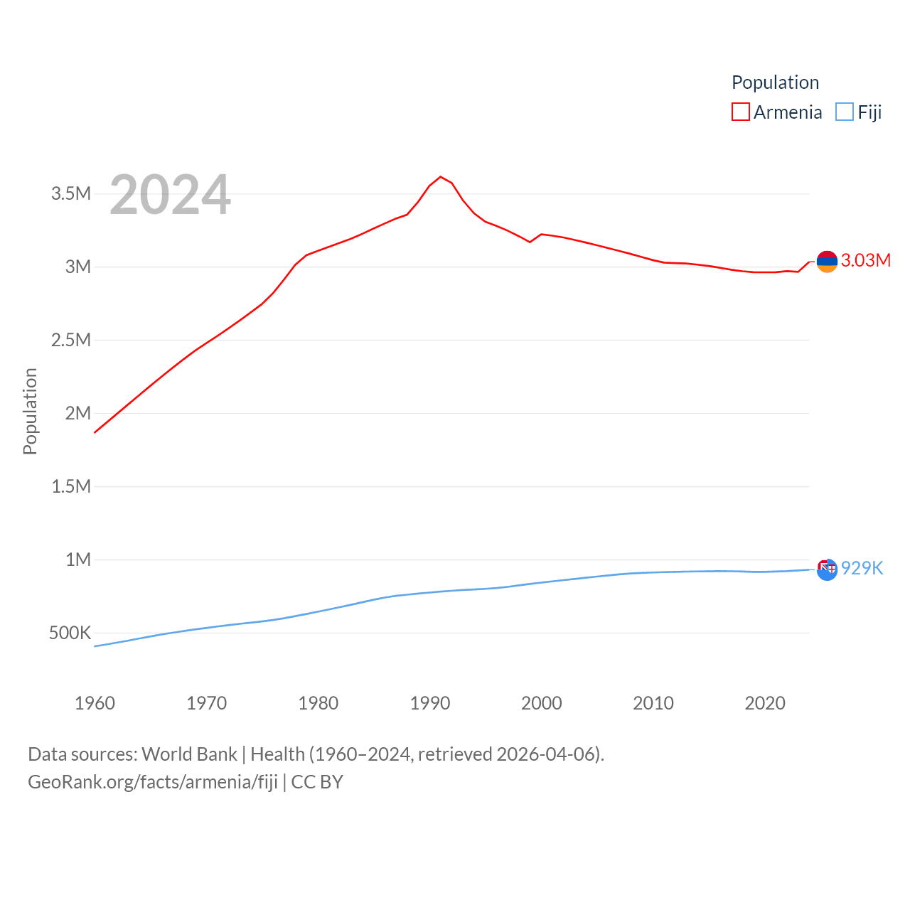 Armenia has a population of 3.03M (ranked 135/197), compared with 929K in Fiji (ranked 159/197). Armenia's land area is 10,888 sq mi versus 7,054 sq mi for Fiji (ranked 138th vs. 152nd).