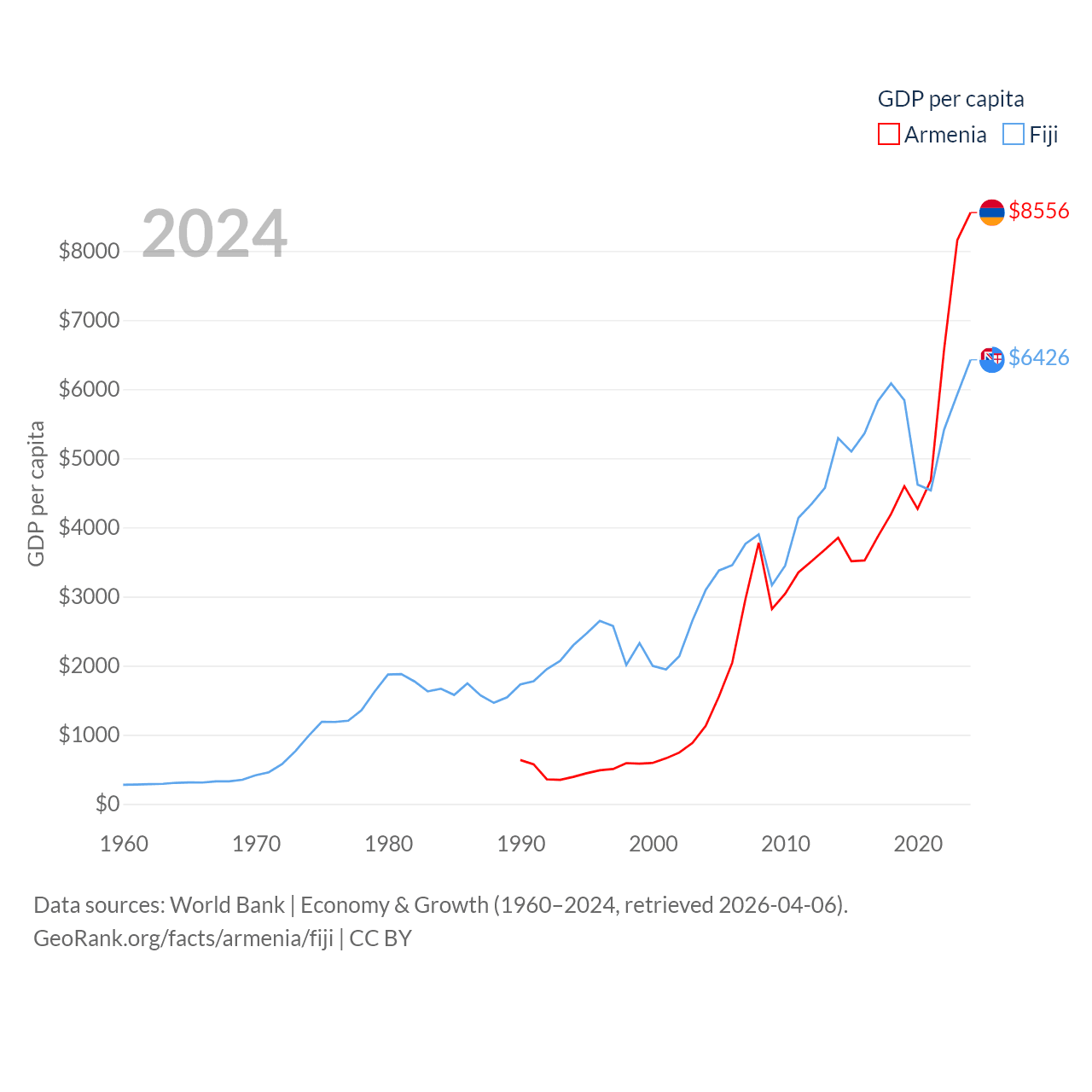 By GDP, Armenia ranks 114/197 ($26B) and Fiji ranks 161/197 ($5.97B). By GDP per capita, Armenia ranks 90/197 ($8,556), while Fiji ranks 108/197 ($6,426).