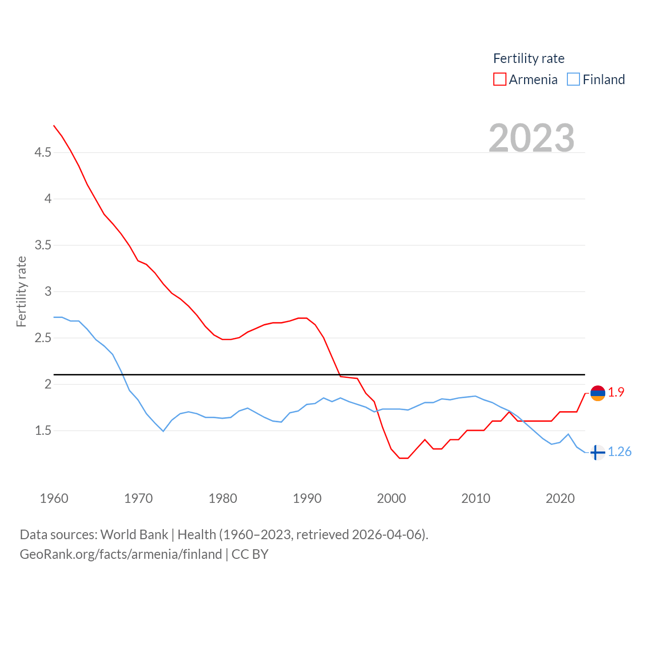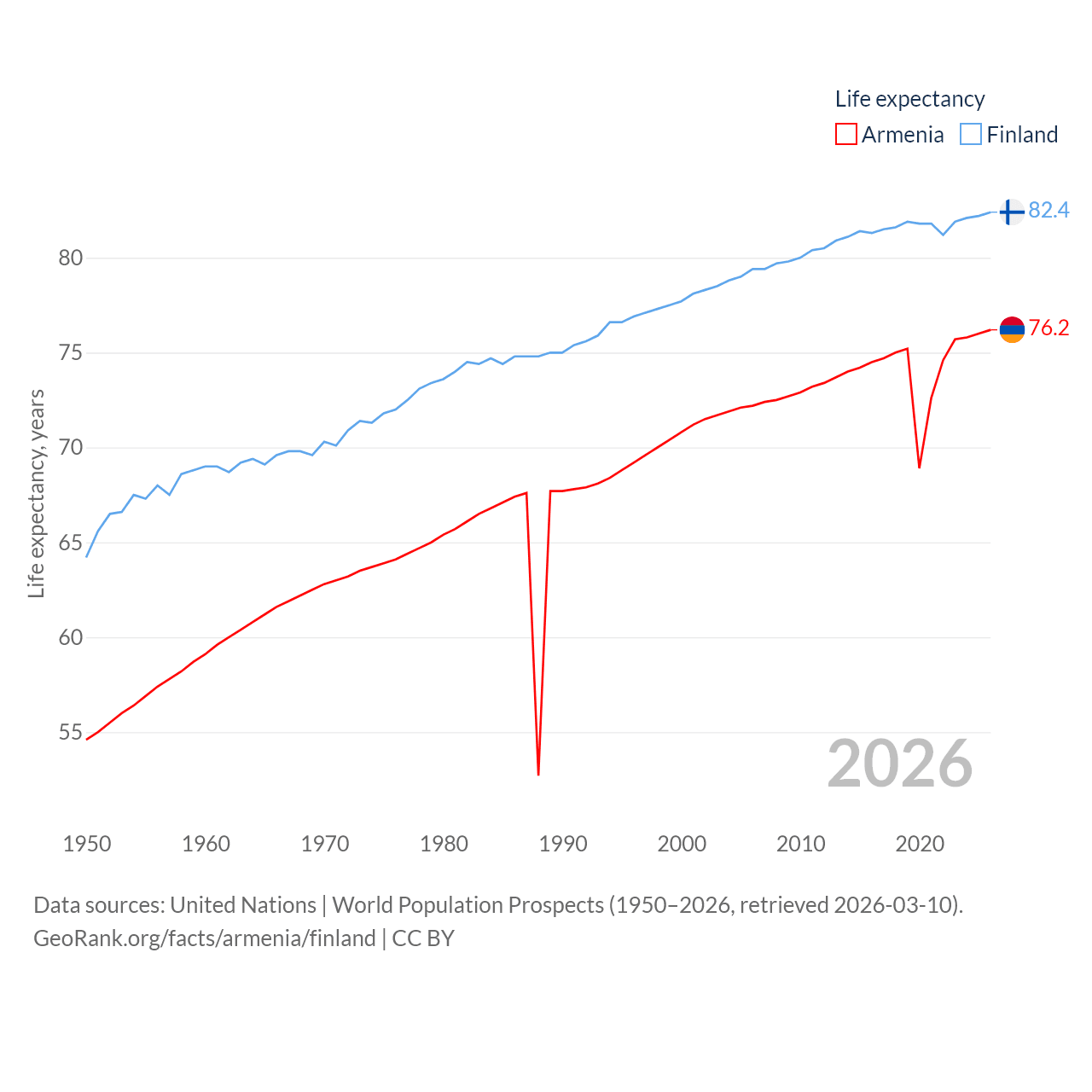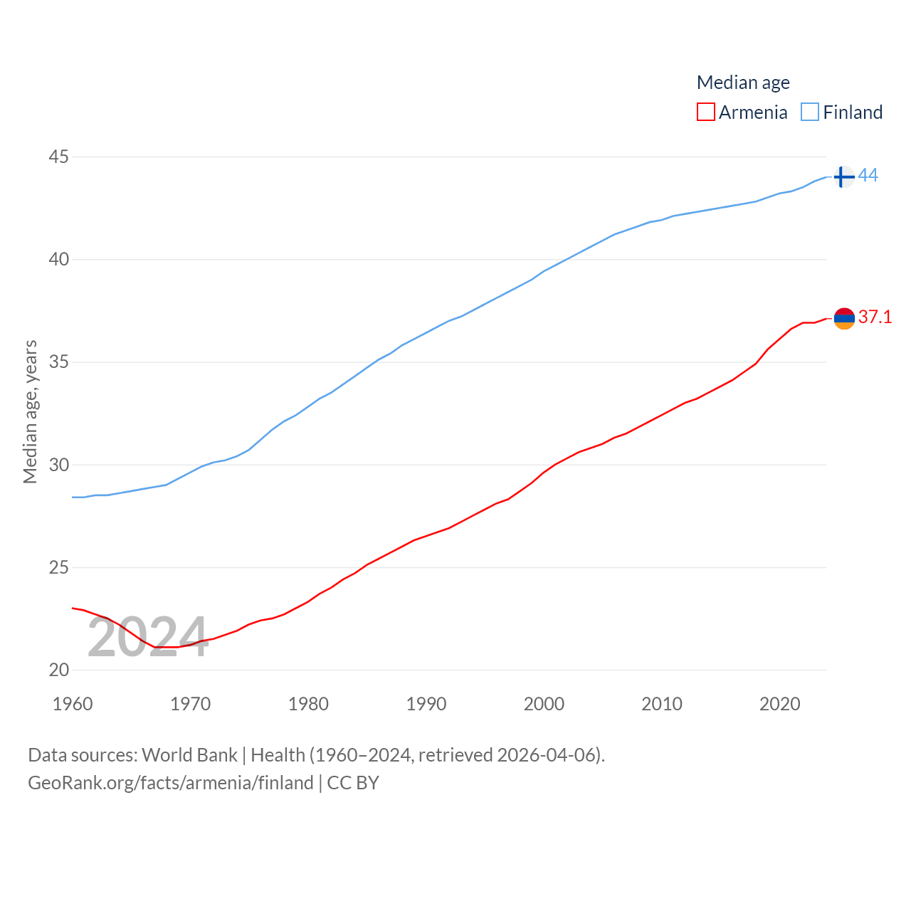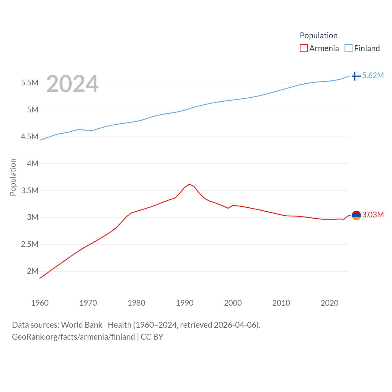 Armenia has a population of 3.03M (ranked 135/197), compared with 5.62M in Finland (ranked 116/197). Armenia's land area is 10,888 sq mi versus 117,360 sq mi for Finland (ranked 138th vs. 70th).