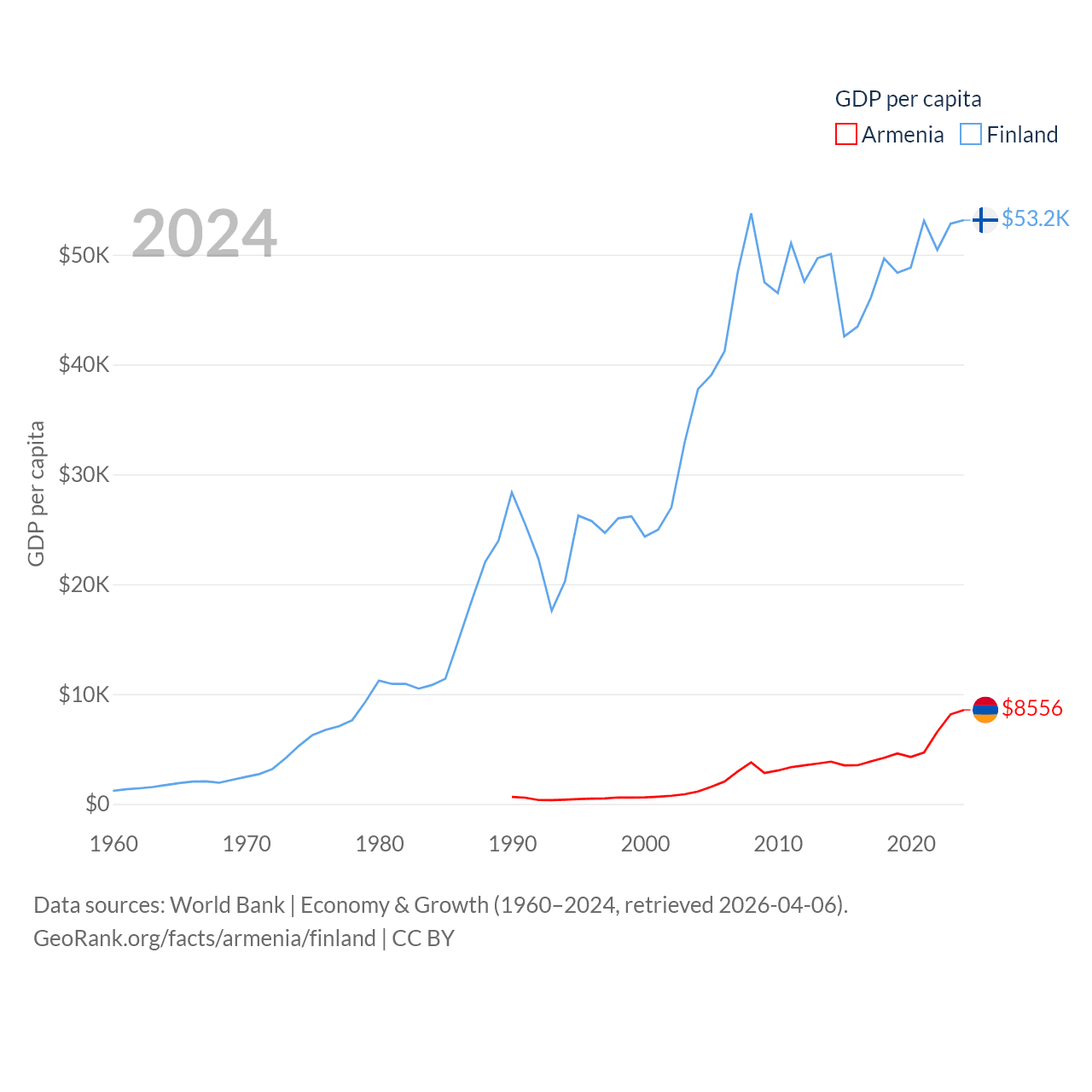 By GDP, Armenia ranks 114/197 ($26B) and Finland ranks 47/197 ($299B). By GDP per capita, Armenia ranks 90/197 ($8,556), while Finland ranks 23/197 ($53,150).