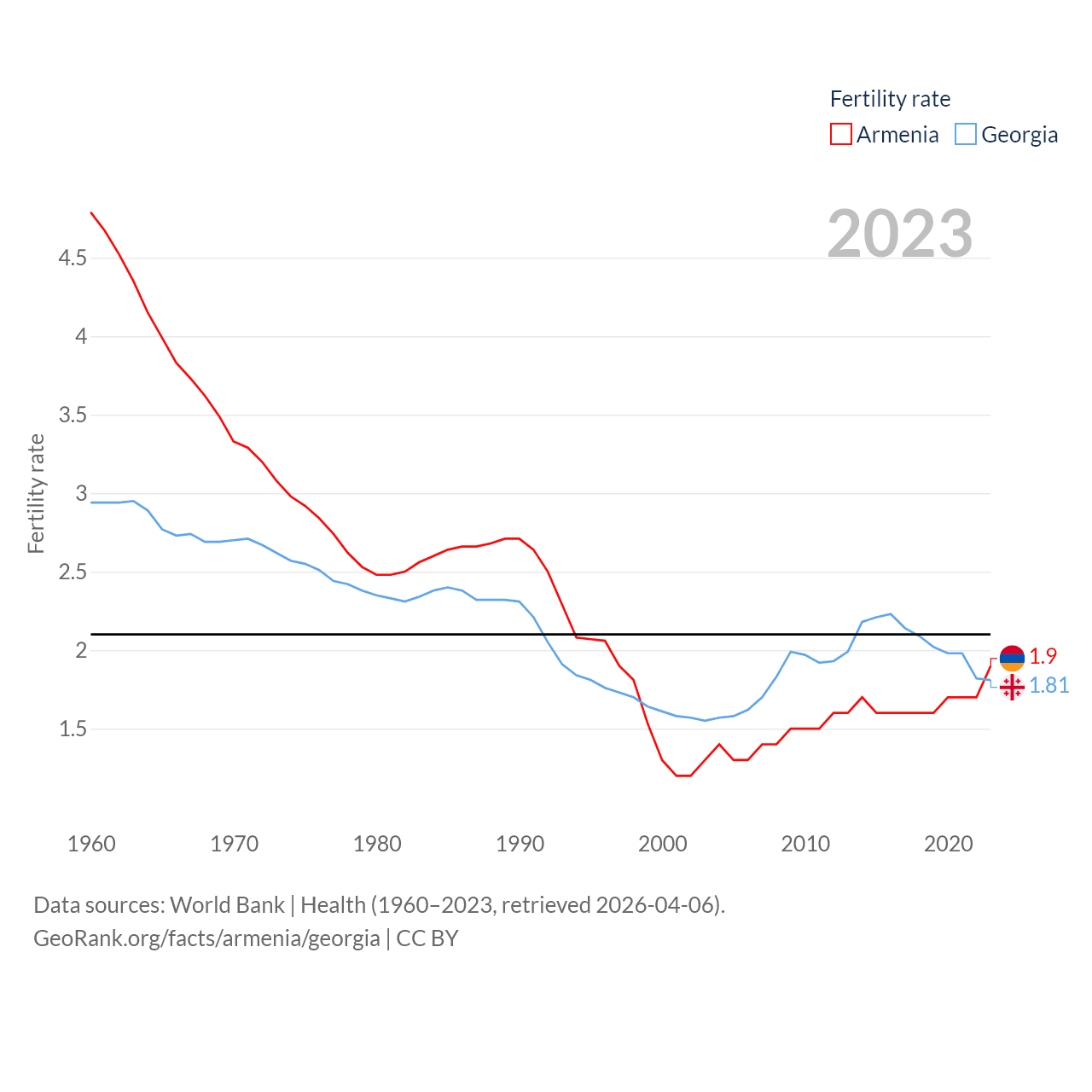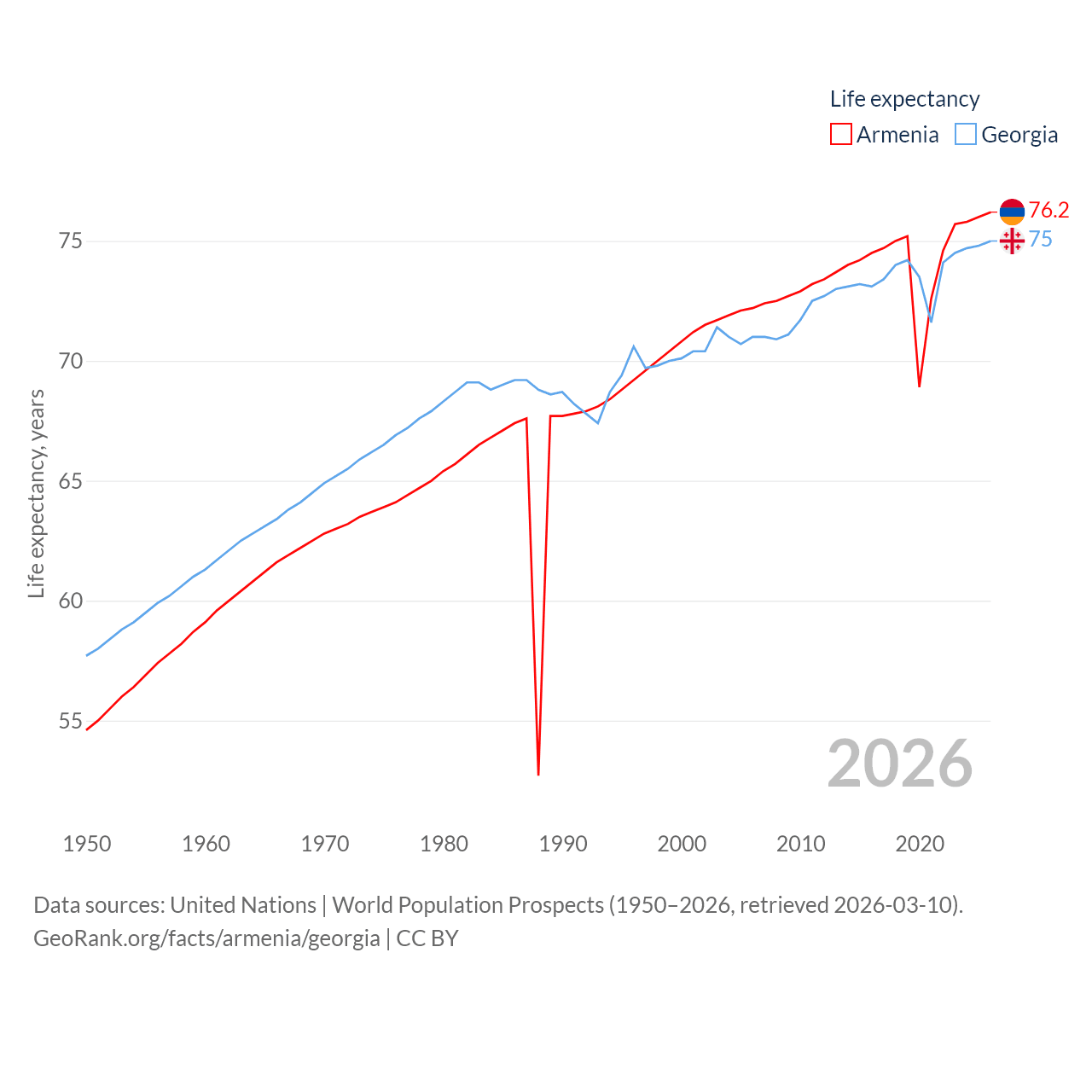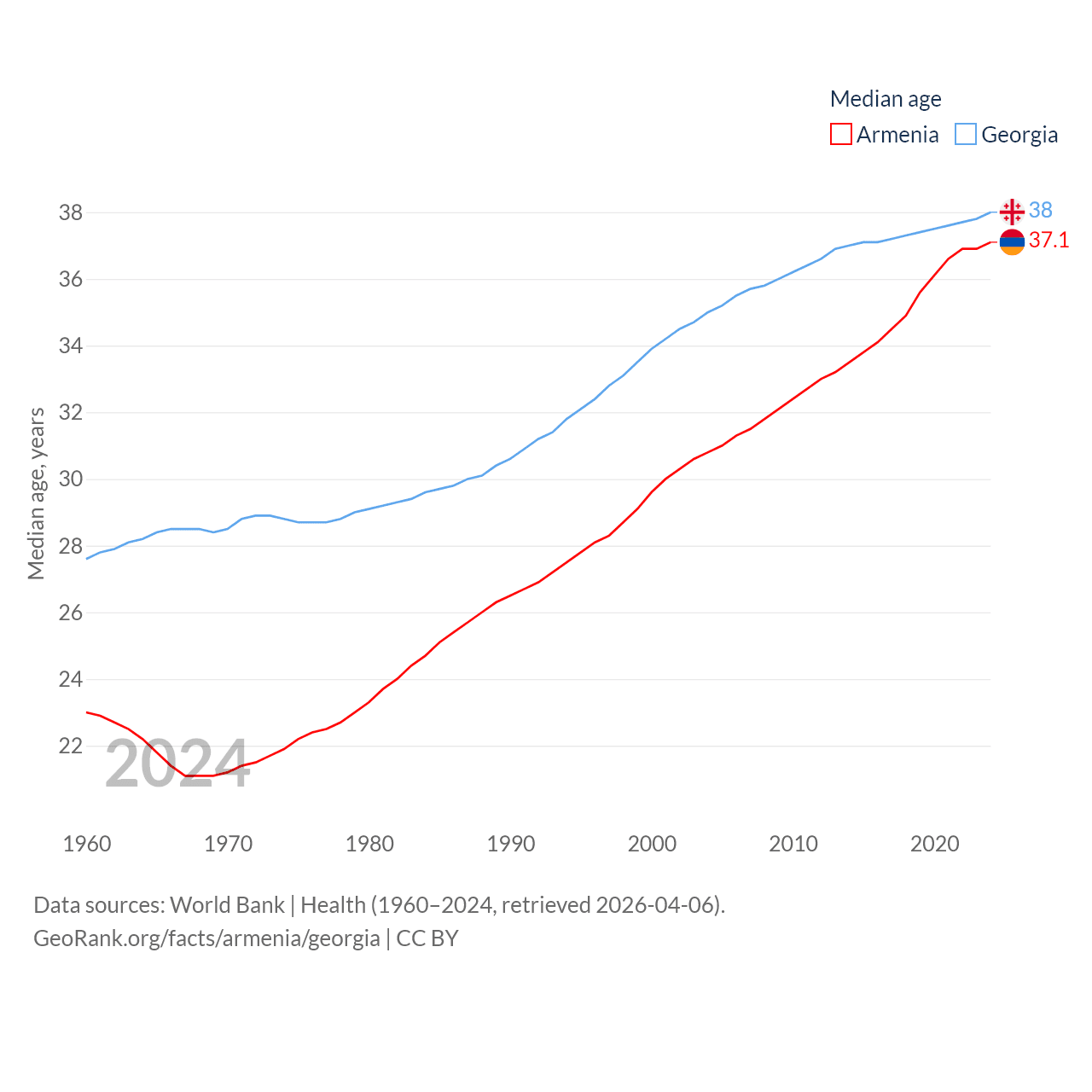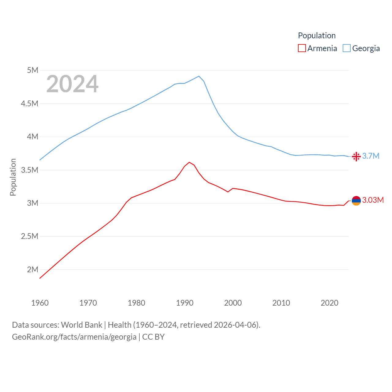 Armenia has a population of 3.03M (ranked 135/197), compared with 3.7M in Georgia (ranked 130/197). Armenia's land area is 10,888 sq mi versus 26,830 sq mi for Georgia (ranked 138th vs. 118th).