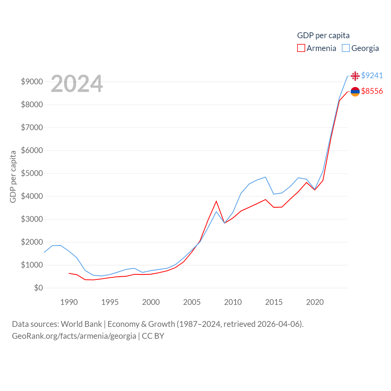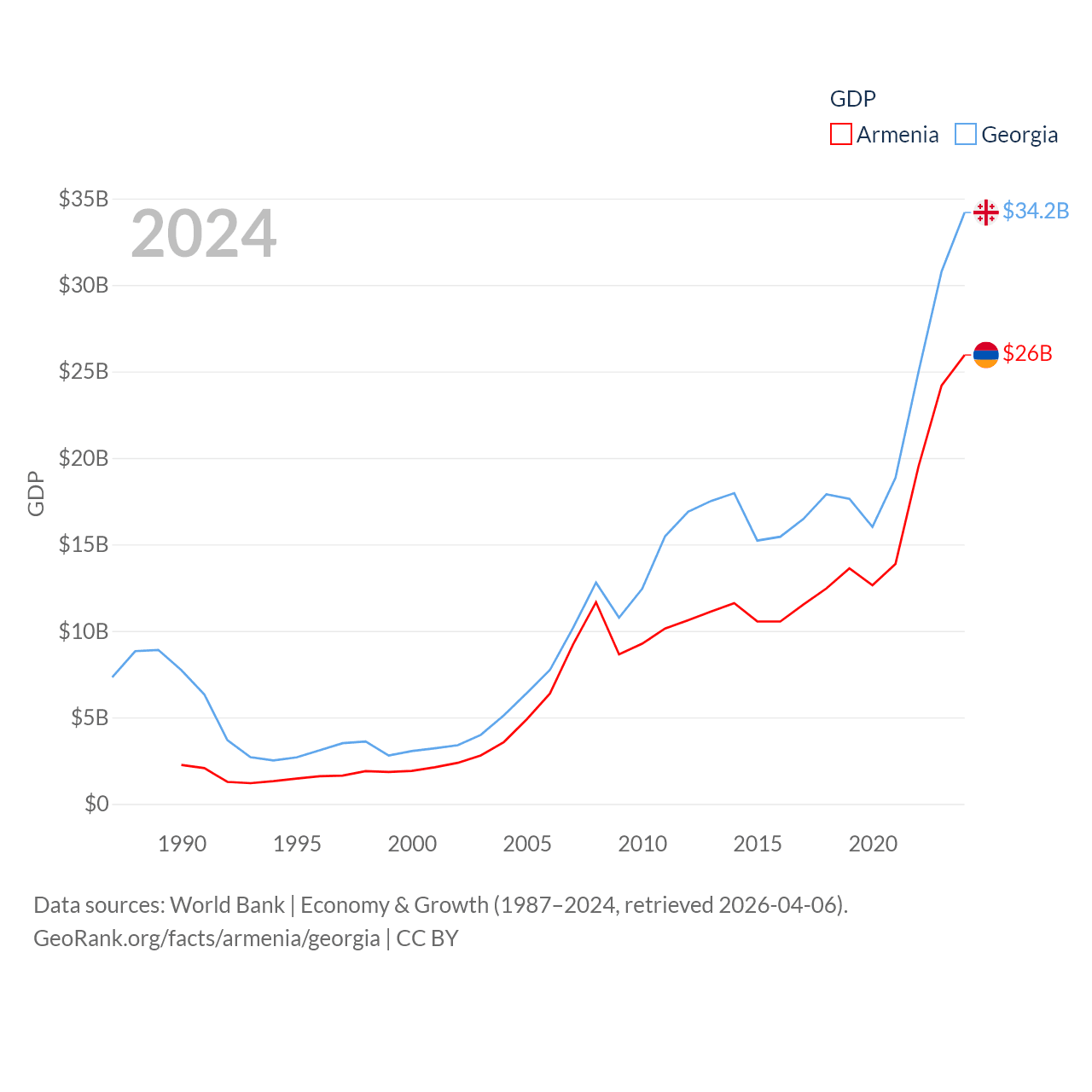 By GDP, Armenia ranks 114/197 ($26B) and Georgia ranks 107/197 ($34.2B). By GDP per capita, Armenia ranks 90/197 ($8,556), while Georgia ranks 89/197 ($9,241).