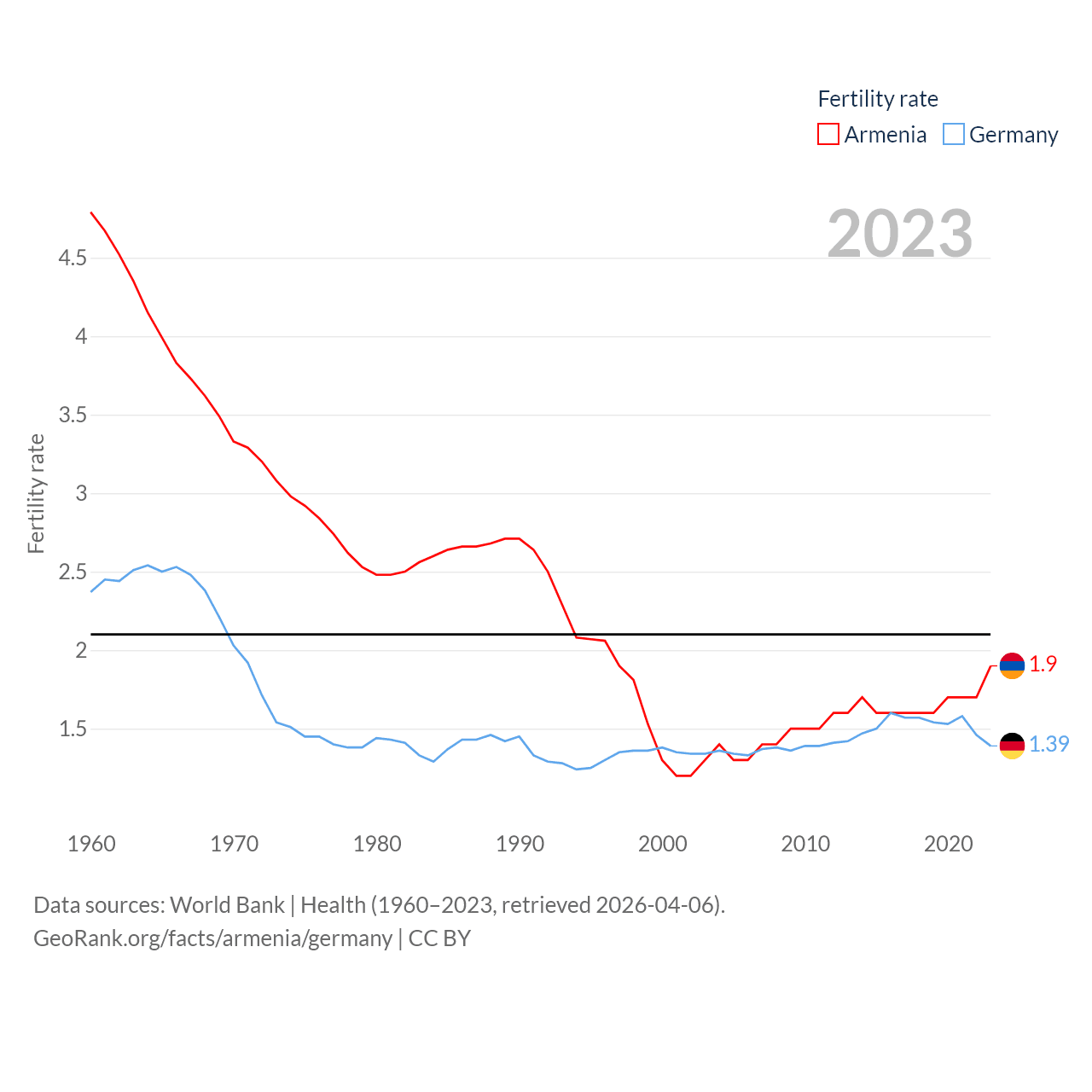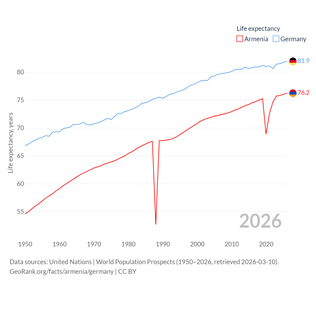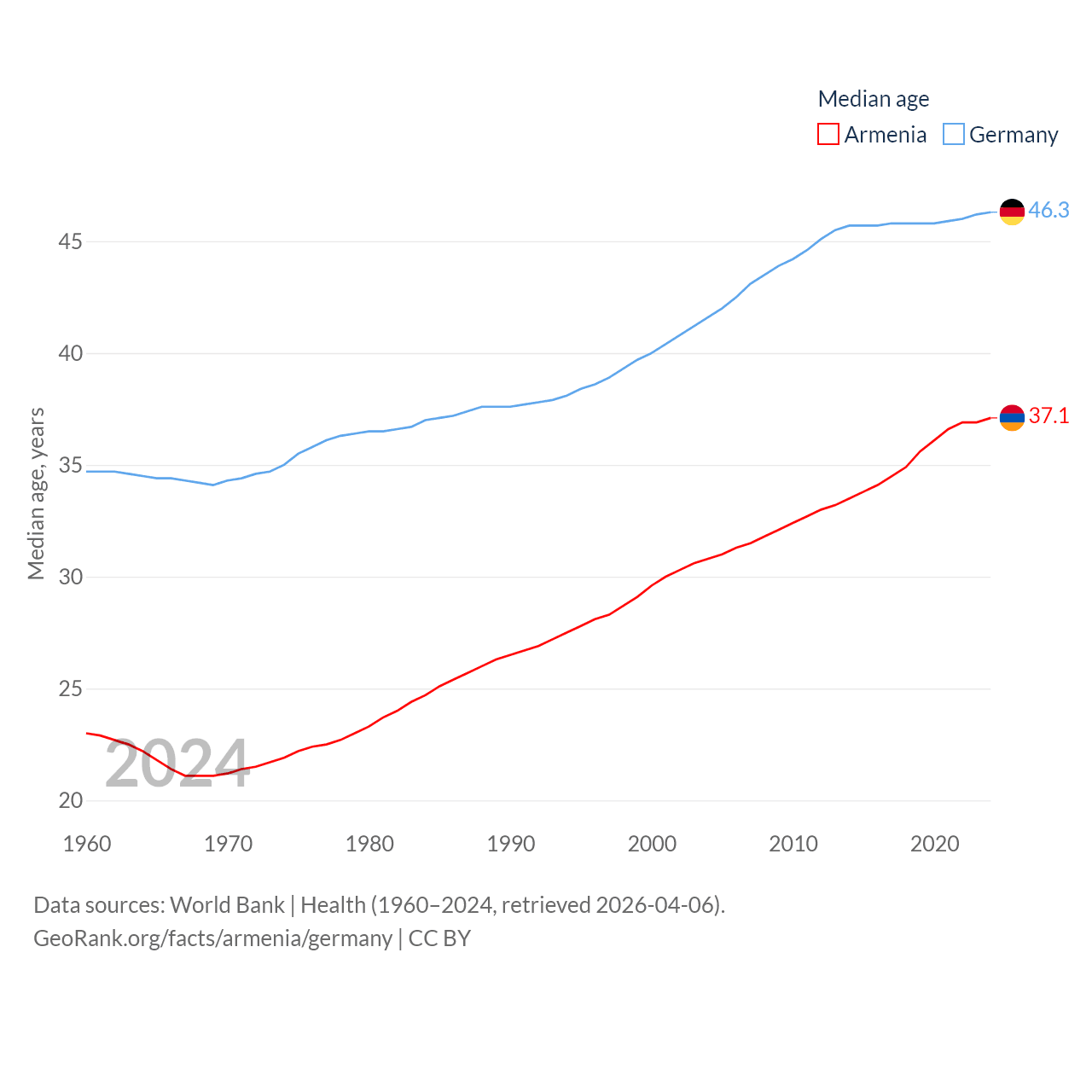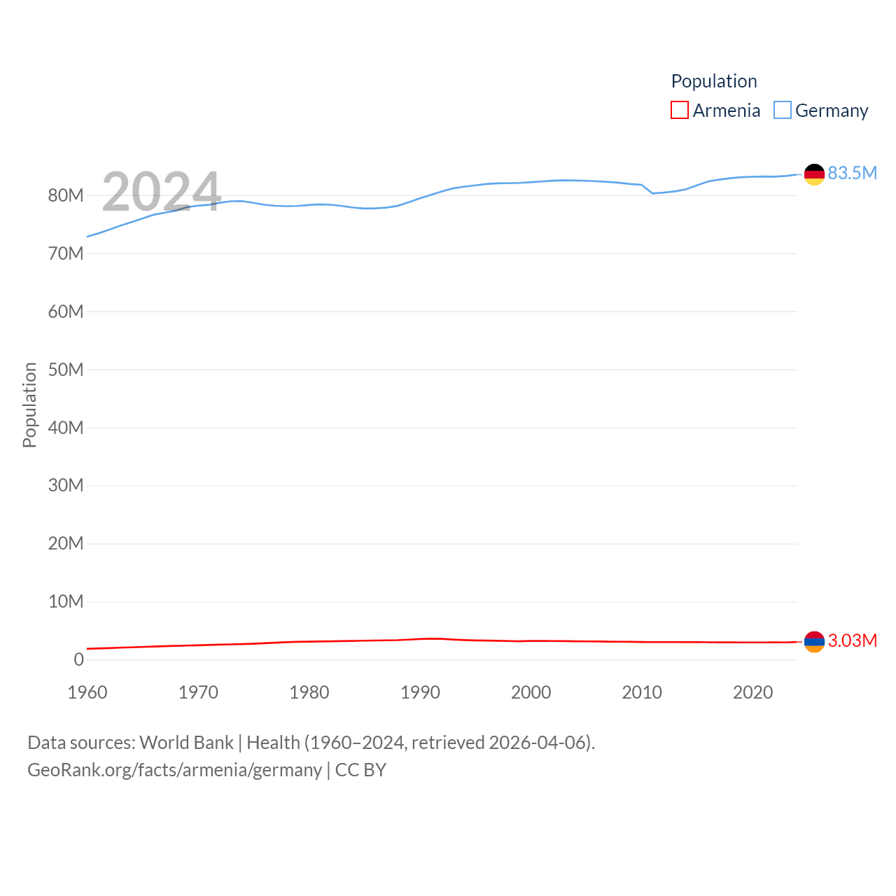 Armenia has a population of 3.03M (ranked 135/197), compared with 83.5M in Germany (ranked 19/197). Armenia's land area is 10,888 sq mi versus 134,916 sq mi for Germany (ranked 138th vs. 63rd).
