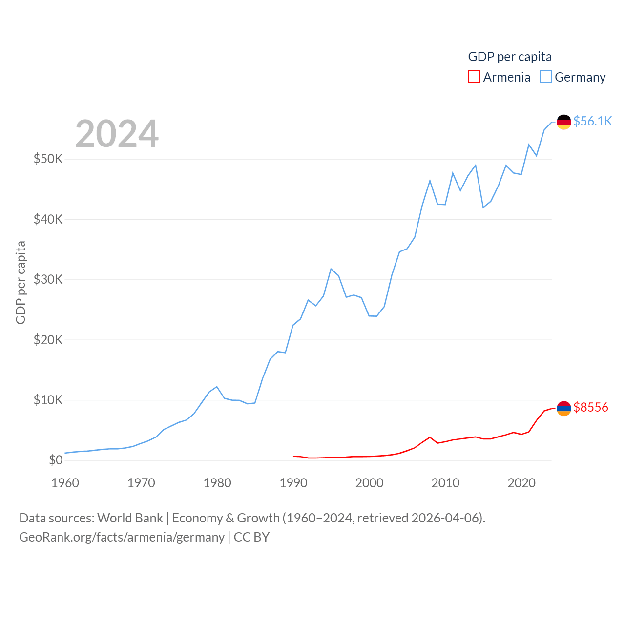 By GDP, Armenia ranks 114/197 ($26B) and Germany ranks 3/197 ($4.69T). By GDP per capita, Armenia ranks 90/197 ($8,556), while Germany ranks 19/197 ($56,104).