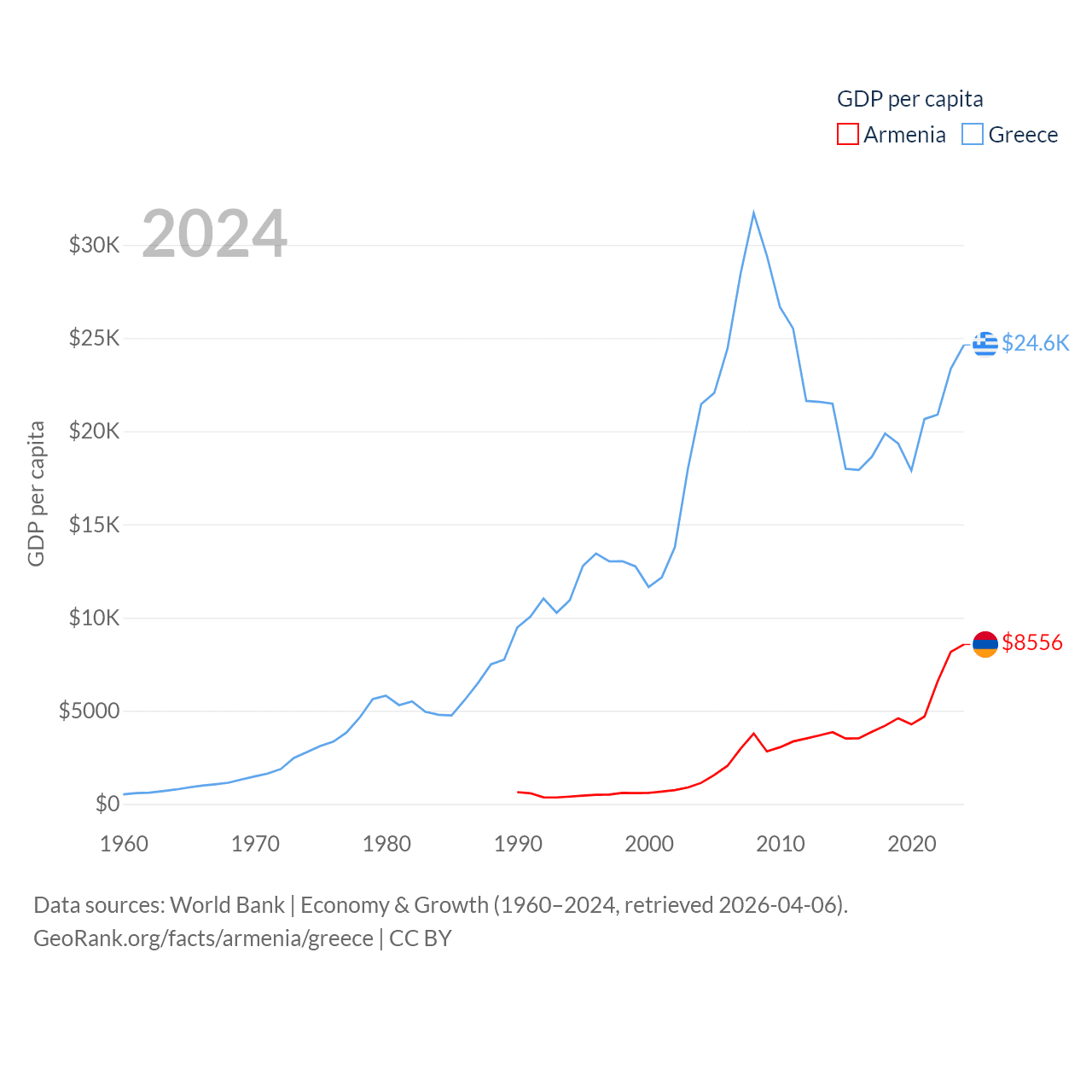 By GDP, Armenia ranks 114/197 ($26B) and Greece ranks 53/197 ($256B). By GDP per capita, Armenia ranks 90/197 ($8,556), while Greece ranks 49/197 ($24,626).