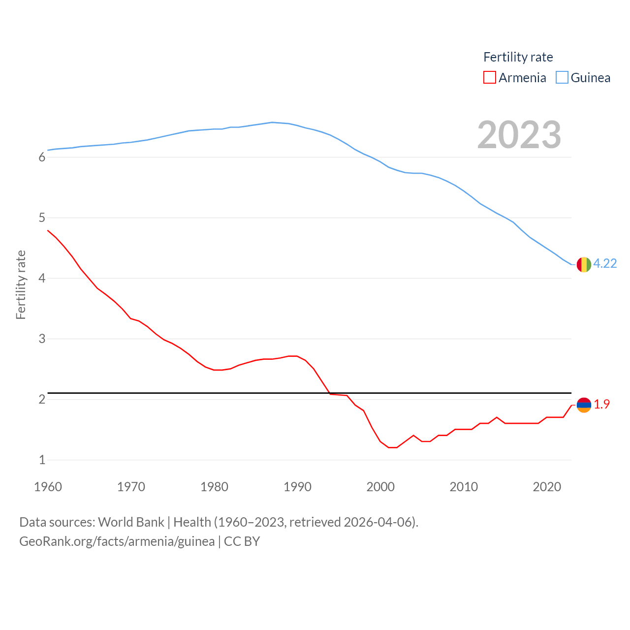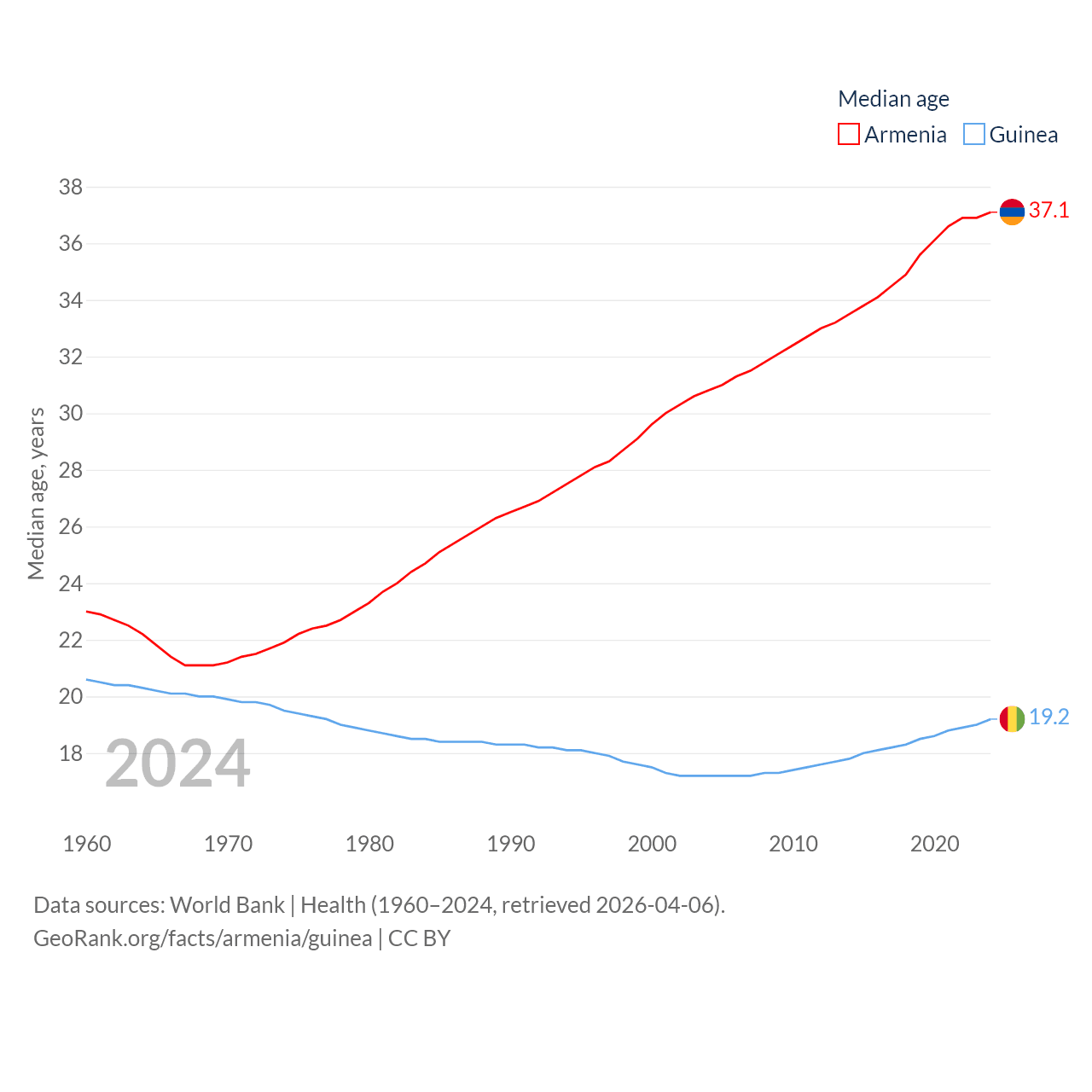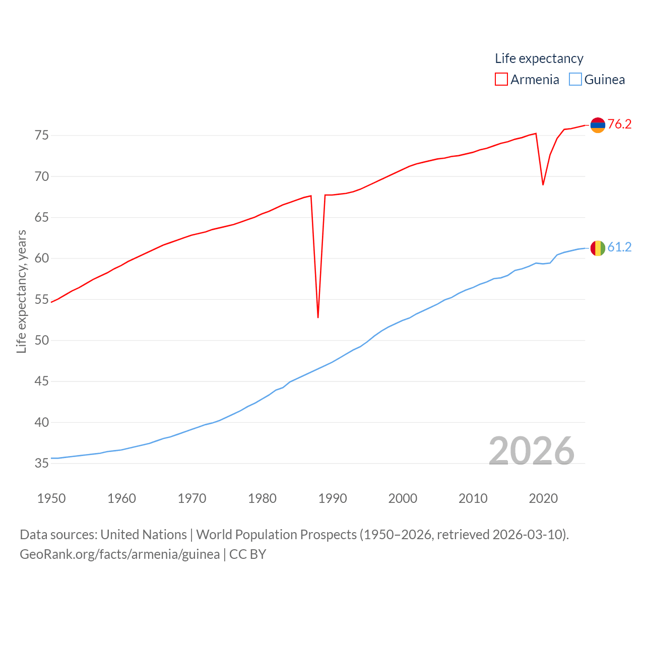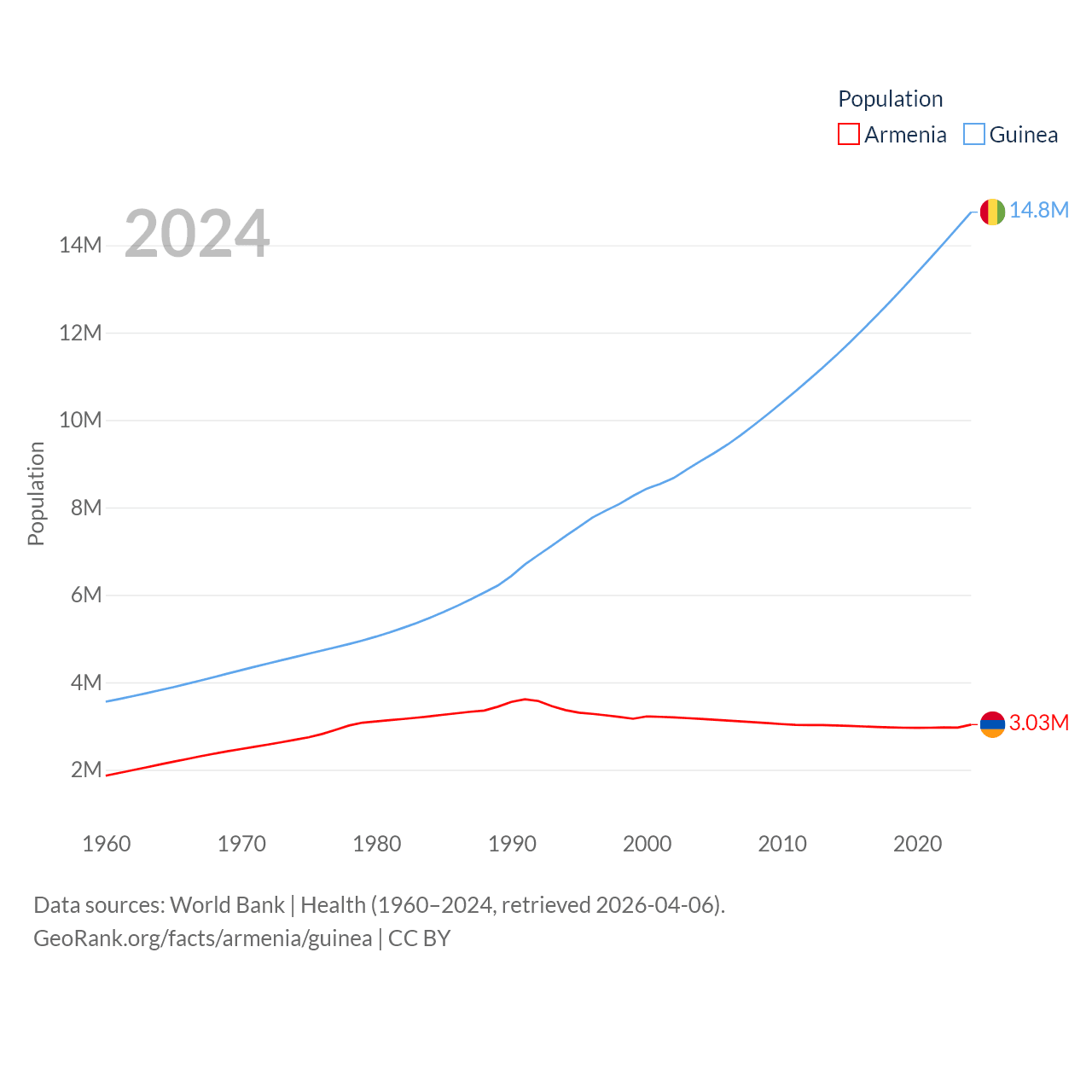 Armenia has a population of 3.03M (ranked 135/197), compared with 14.8M in Guinea (ranked 75/197). Armenia's land area is 10,888 sq mi versus 94,873 sq mi for Guinea (ranked 138th vs. 77th).
