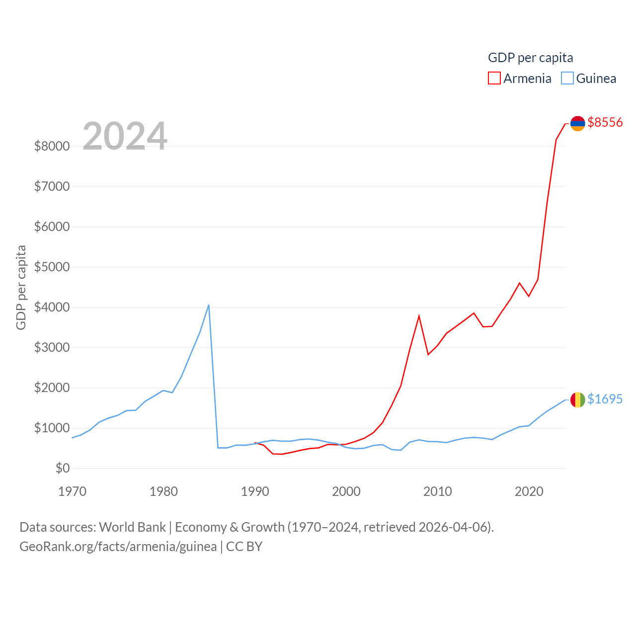 By GDP, Armenia ranks 114/197 ($26B) and Guinea ranks 118/197 ($25B). By GDP per capita, Armenia ranks 90/197 ($8,556), while Guinea ranks 160/197 ($1,695).