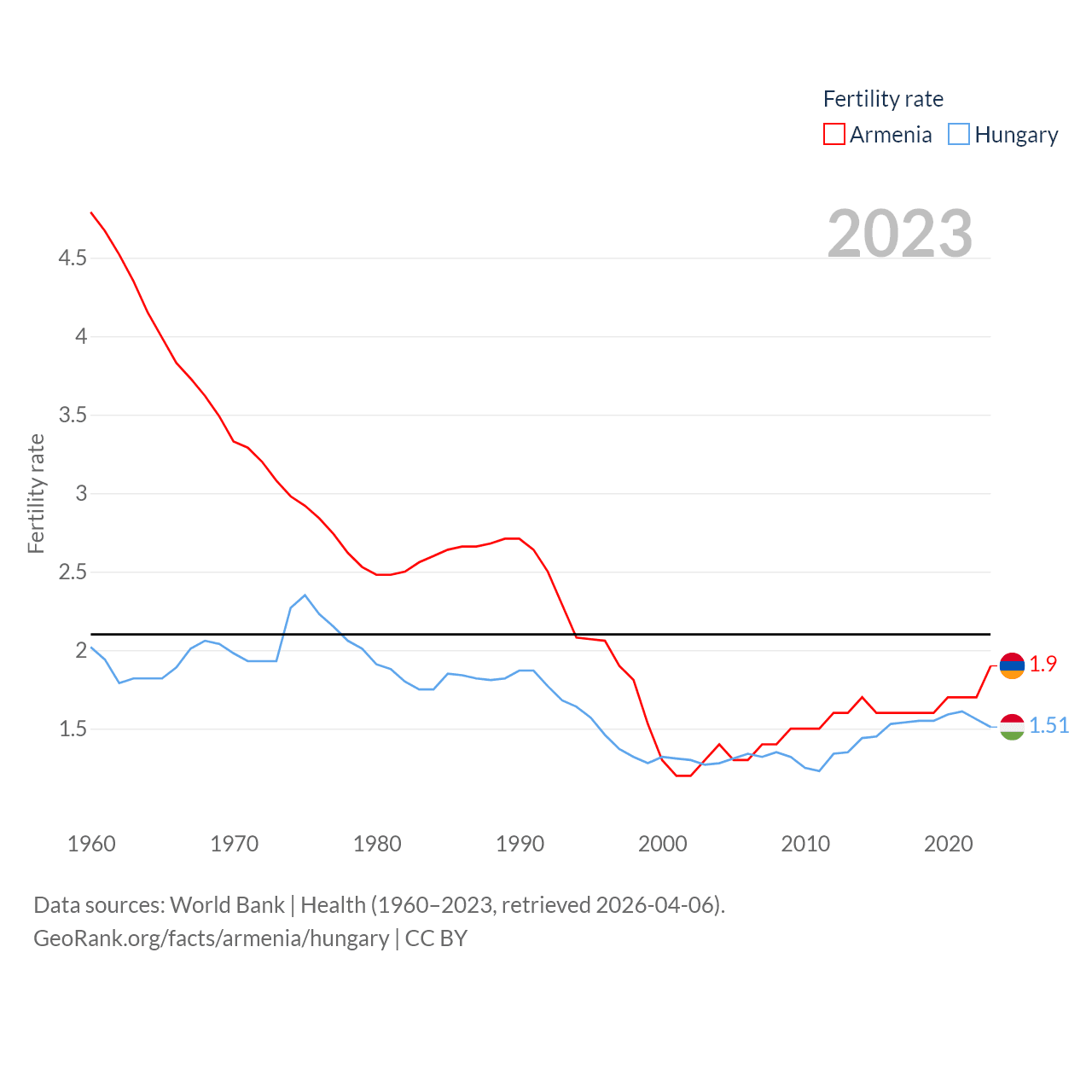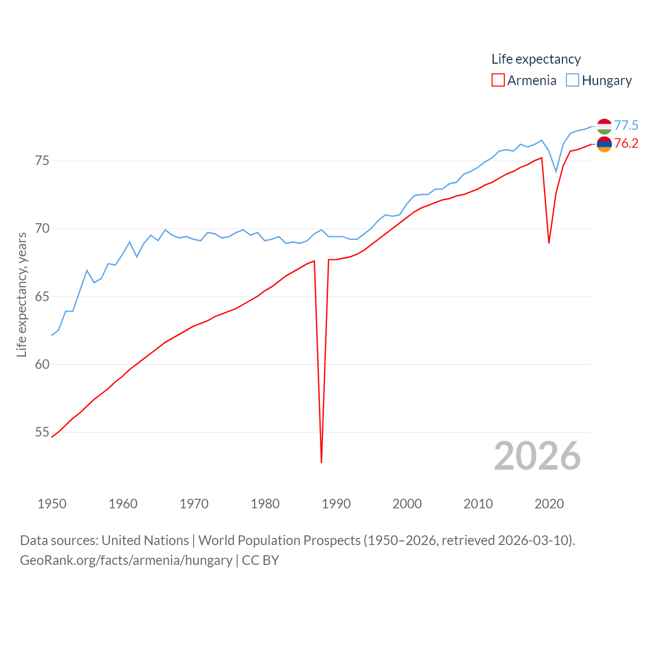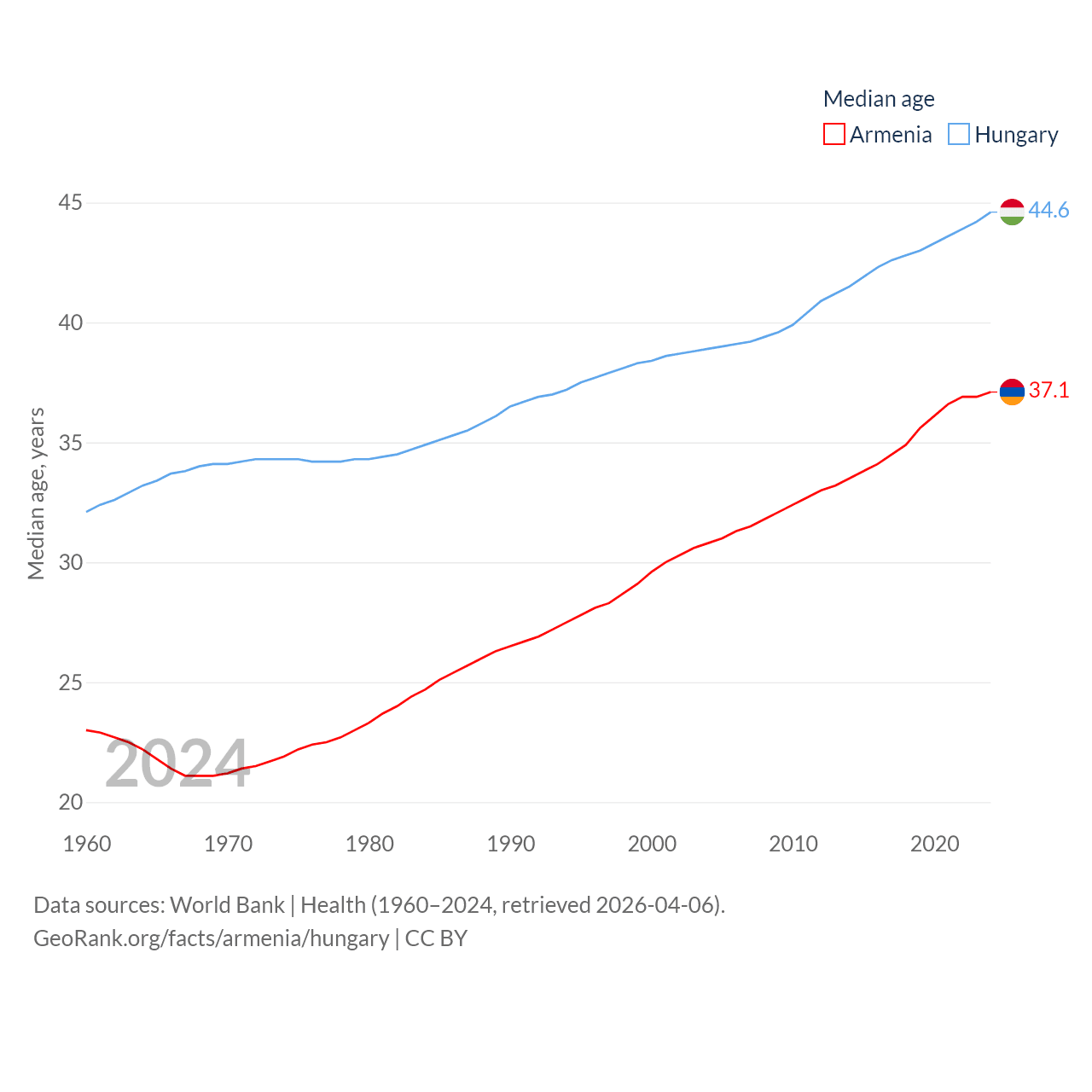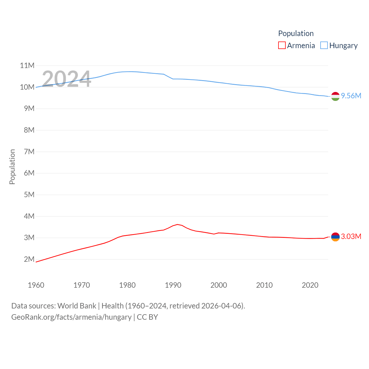 Armenia has a population of 3.03M (ranked 135/197), compared with 9.56M in Hungary (ranked 97/197). Armenia's land area is 10,888 sq mi versus 35,236 sq mi for Hungary (ranked 138th vs. 109th).