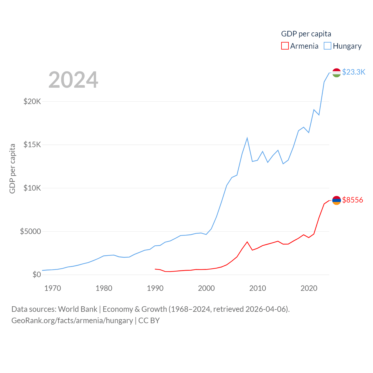 By GDP, Armenia ranks 114/197 ($26B) and Hungary ranks 55/197 ($223B). By GDP per capita, Armenia ranks 90/197 ($8,556), while Hungary ranks 55/197 ($23,292).
