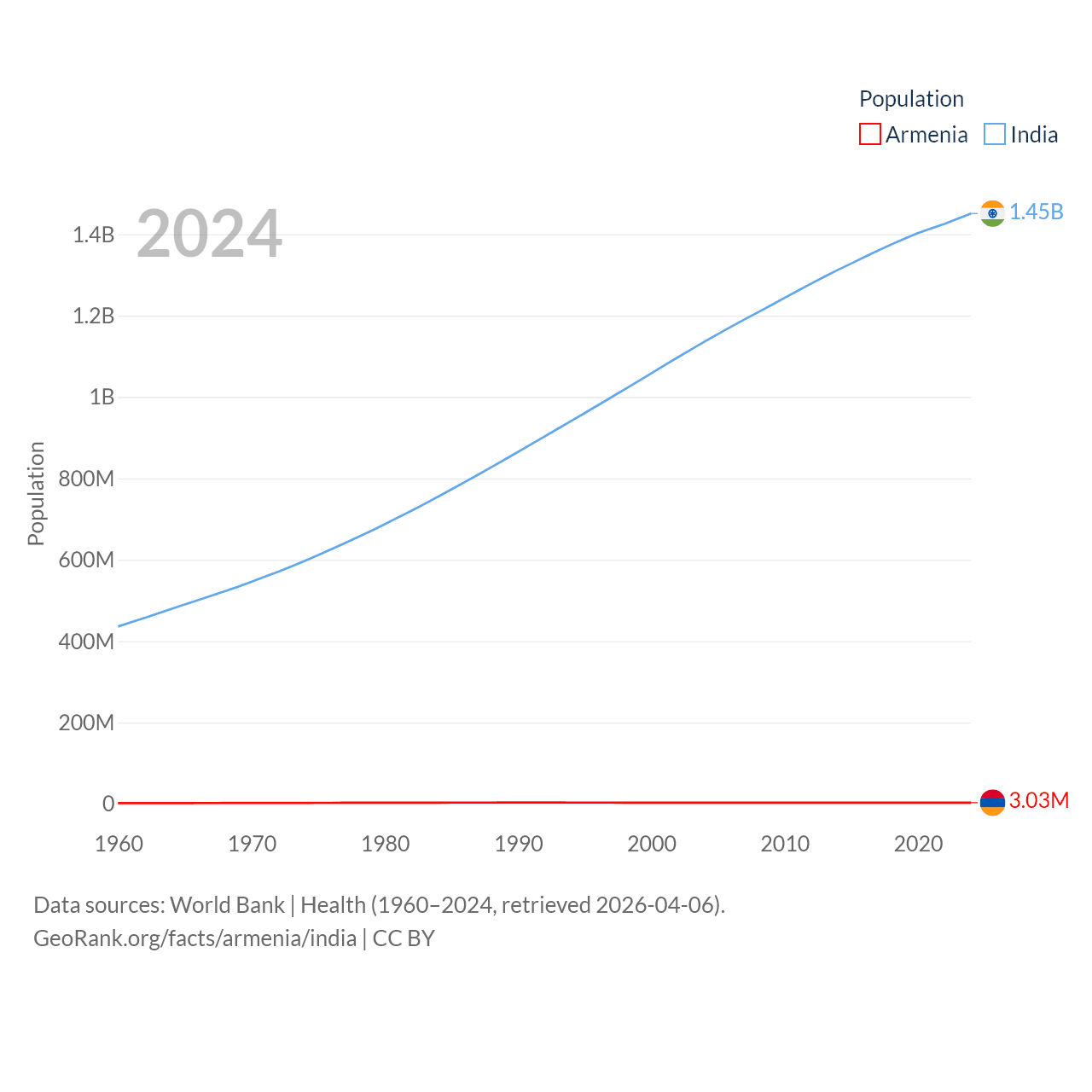 Armenia has a population of 3.03M (ranked 135/197), compared with 1.45B in India (ranked 1/197). Armenia's land area is 10,888 sq mi versus 1,147,955 sq mi for India (ranked 138th vs. 7th).