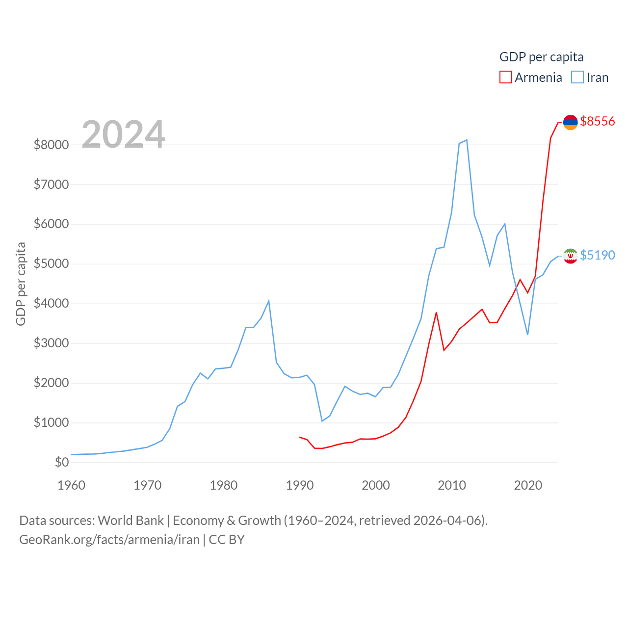 By GDP, Armenia ranks 114/197 ($26B) and Iran ranks 34/197 ($475B). By GDP per capita, Armenia ranks 90/197 ($8,556), while Iran ranks 119/197 ($5,190).