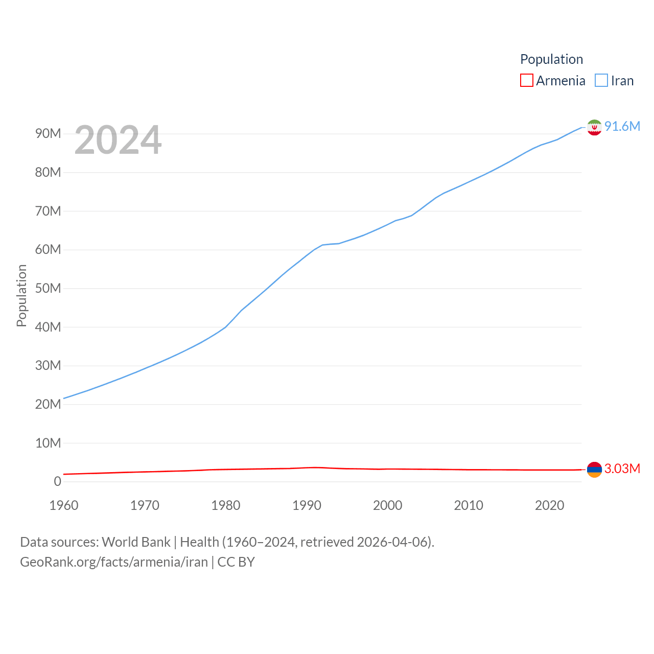 Armenia has a population of 3.03M (ranked 135/197), compared with 91.6M in Iran (ranked 17/197). Armenia's land area is 10,888 sq mi versus 626,451 sq mi for Iran (ranked 138th vs. 17th).