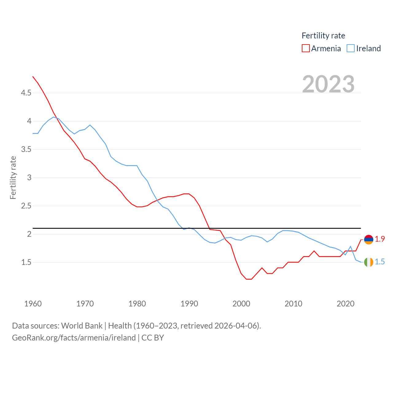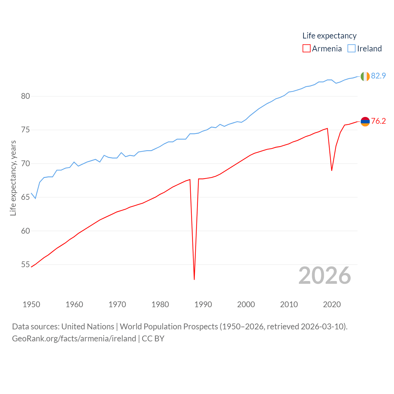 Armenia has a population of 3.03M (ranked 135/197), compared with 5.4M in Ireland (ranked 120/197). Armenia's land area is 10,888 sq mi versus 26,599 sq mi for Ireland (ranked 138th vs. 119th).