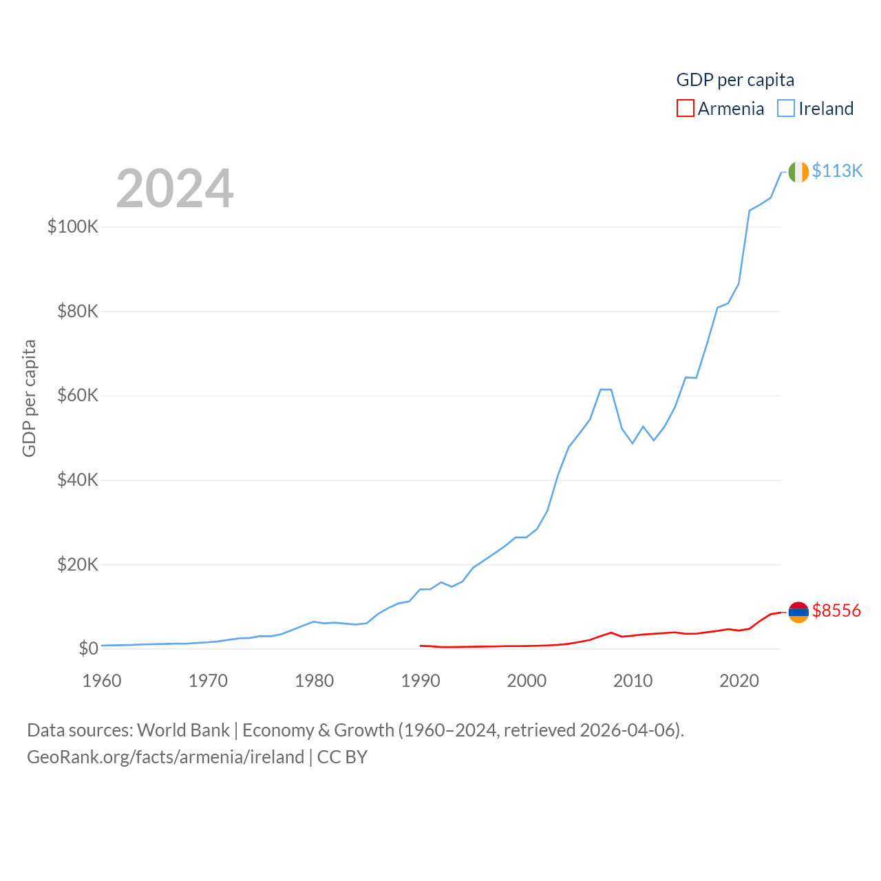 By GDP, Armenia ranks 114/197 ($26B) and Ireland ranks 25/197 ($609B). By GDP per capita, Armenia ranks 90/197 ($8,556), while Ireland ranks 4/197 ($112,895).