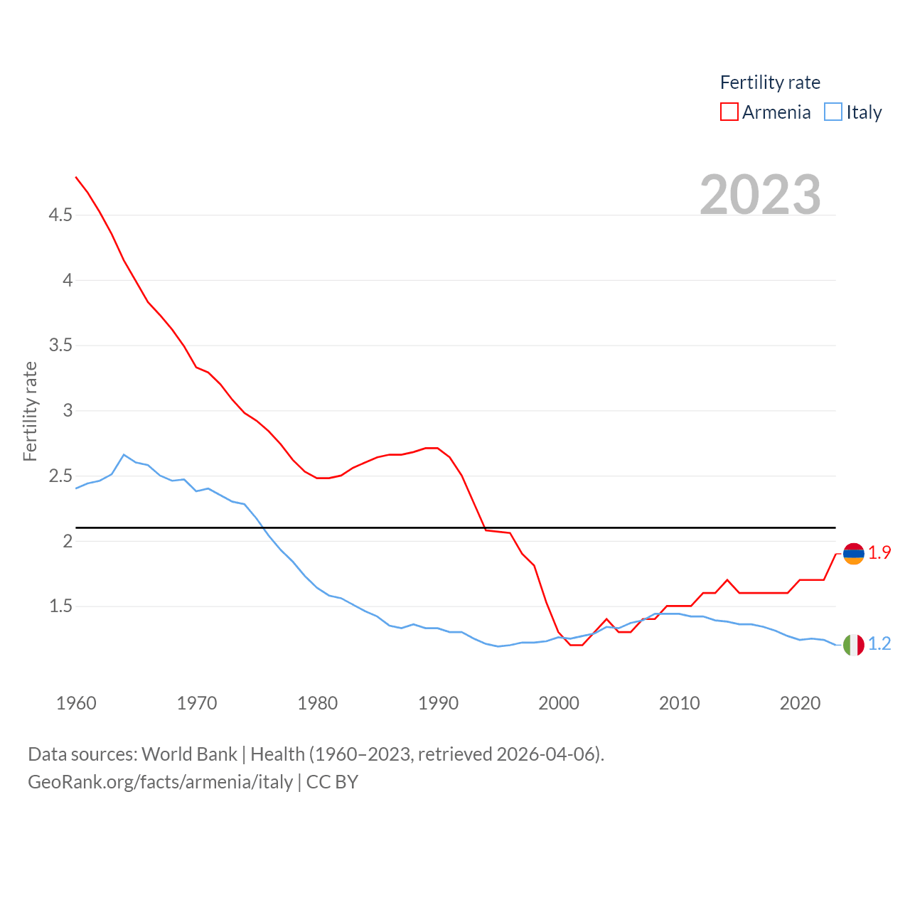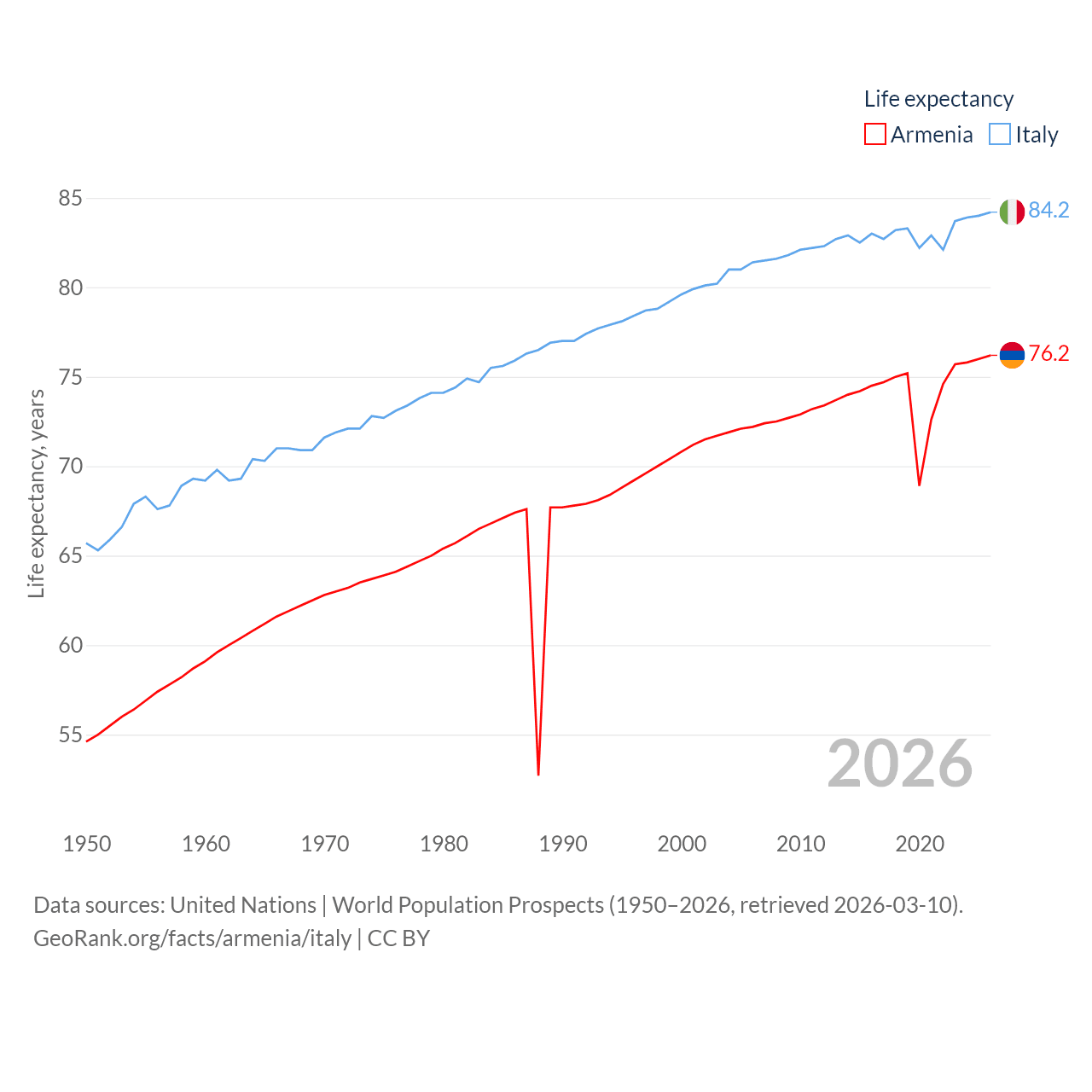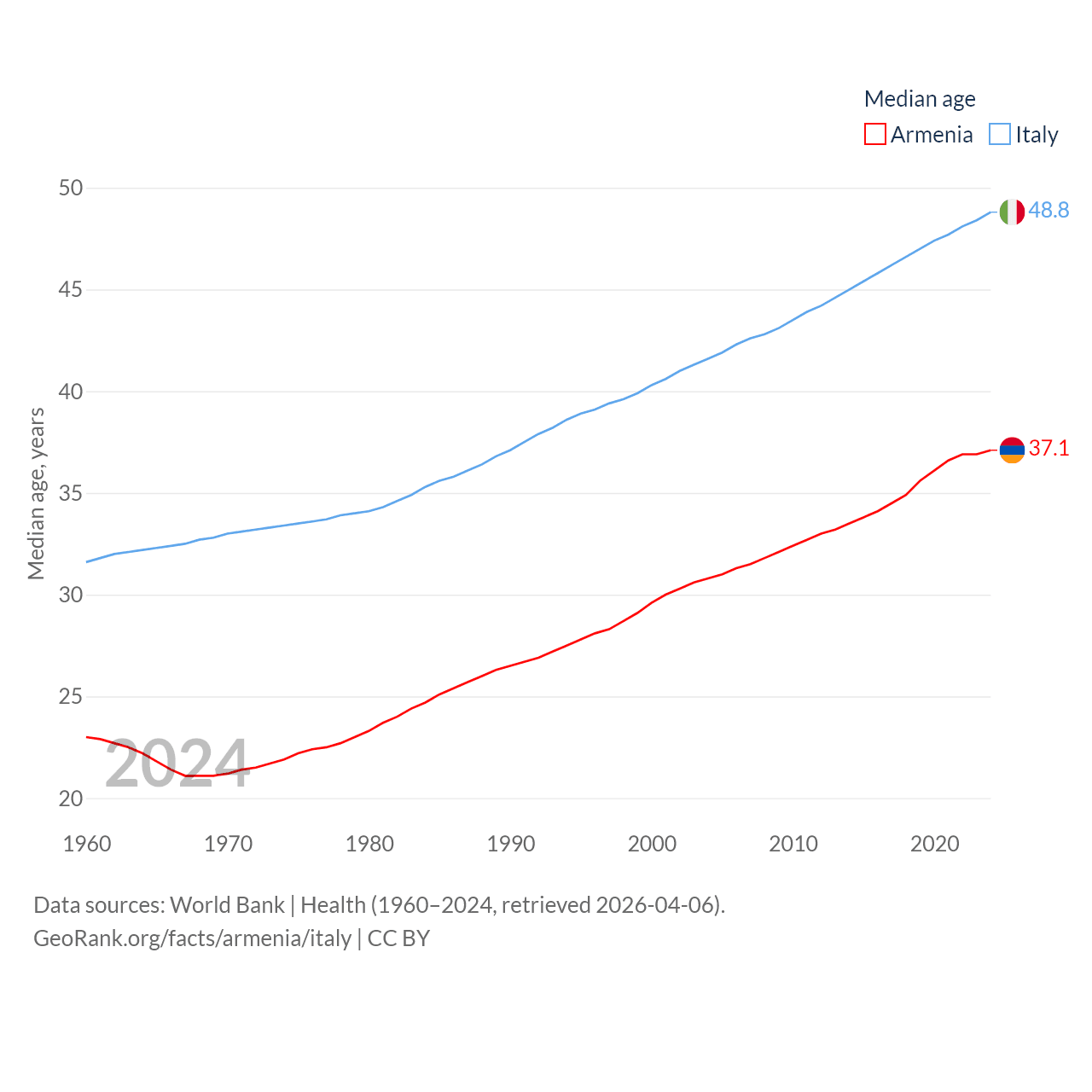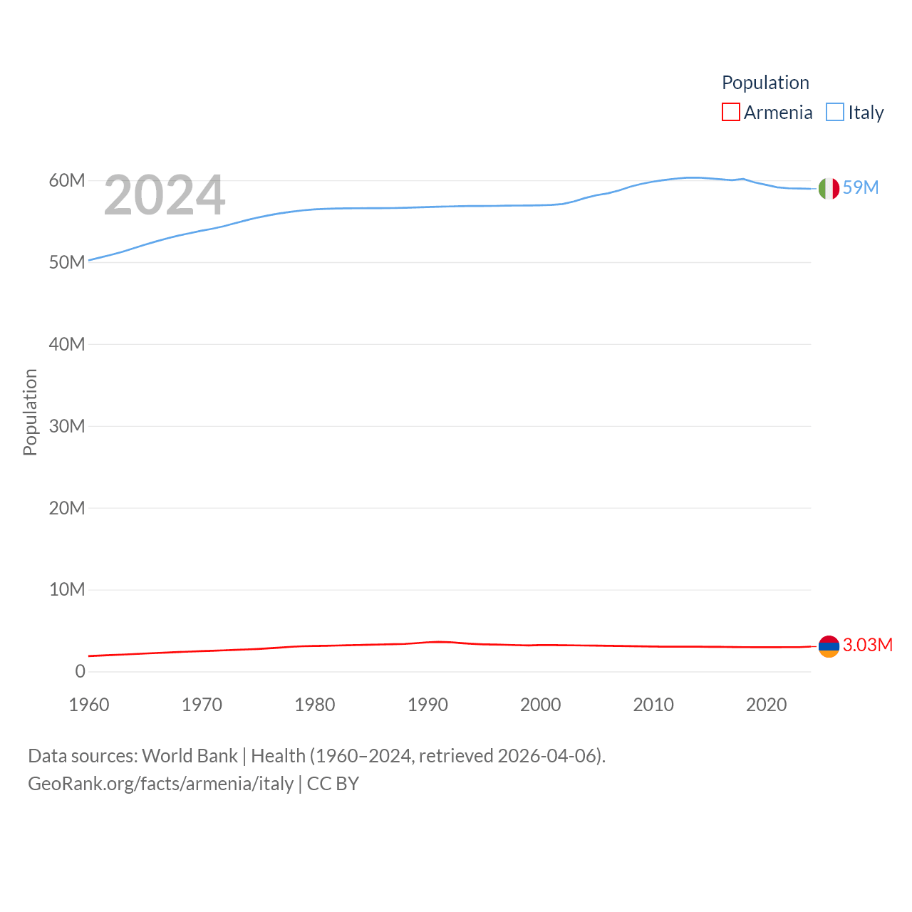 Armenia has a population of 3.03M (ranked 135/197), compared with 59M in Italy (ranked 25/197). Armenia's land area is 10,888 sq mi versus 114,178 sq mi for Italy (ranked 138th vs. 72nd).