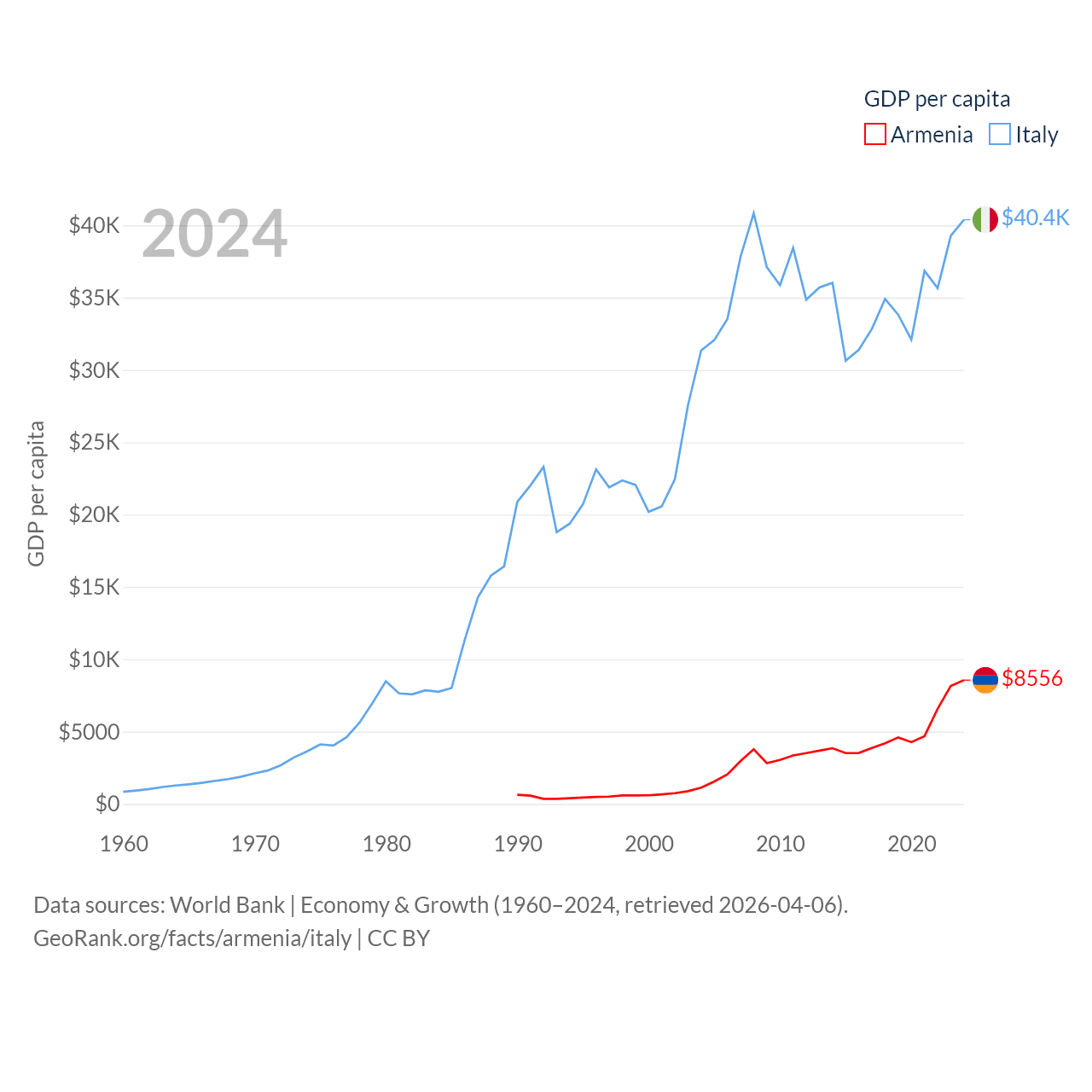 By GDP, Armenia ranks 114/197 ($26B) and Italy ranks 8/197 ($2.38T). By GDP per capita, Armenia ranks 90/197 ($8,556), while Italy ranks 29/197 ($40,385).