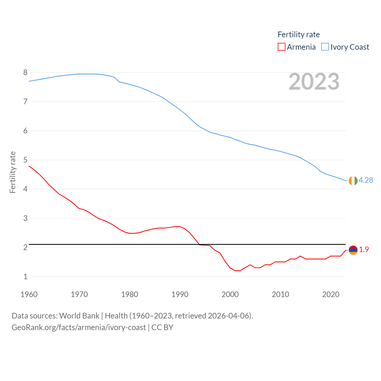 Armenia has a population of 3.03M (ranked 135/197), compared with 31.9M in Ivory Coast (ranked 50/197). Armenia's land area is 10,888 sq mi versus 122,780 sq mi for Ivory Coast (ranked 138th vs. 66th).