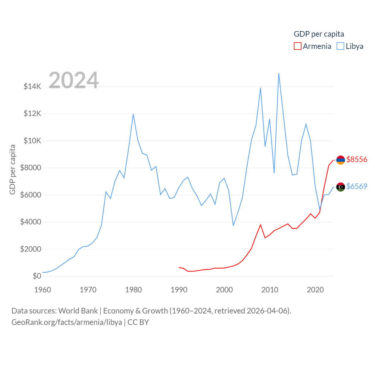 By GDP, Armenia ranks 114/197 ($26B) and Libya ranks 95/197 ($48.5B). By GDP per capita, Armenia ranks 90/197 ($8,556), while Libya ranks 107/197 ($6,569).