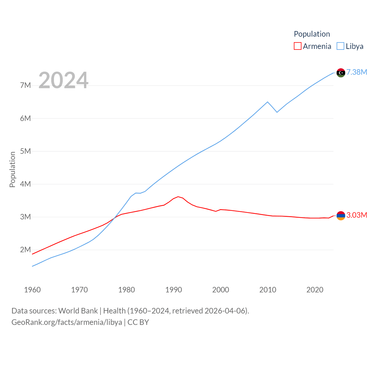 Armenia has a population of 3.03M (ranked 135/197), compared with 7.38M in Libya (ranked 105/197). Armenia's land area is 10,888 sq mi versus 679,362 sq mi for Libya (ranked 138th vs. 16th).