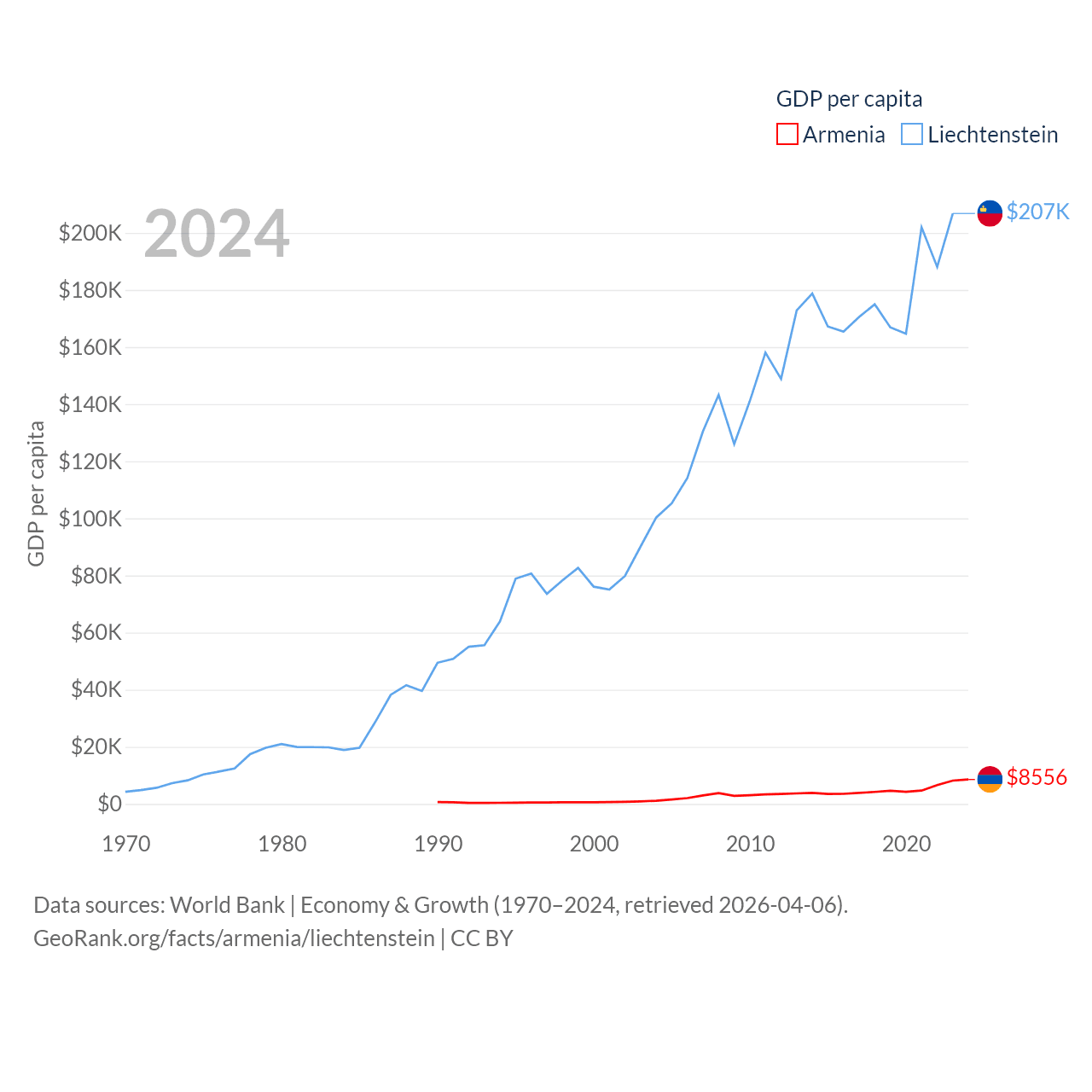 By GDP, Armenia ranks 114/197 ($26B) and Liechtenstein ranks 156/197 ($8.24B). By GDP per capita, Armenia ranks 90/197 ($8,556), while Liechtenstein ranks 2/197 ($206,781).