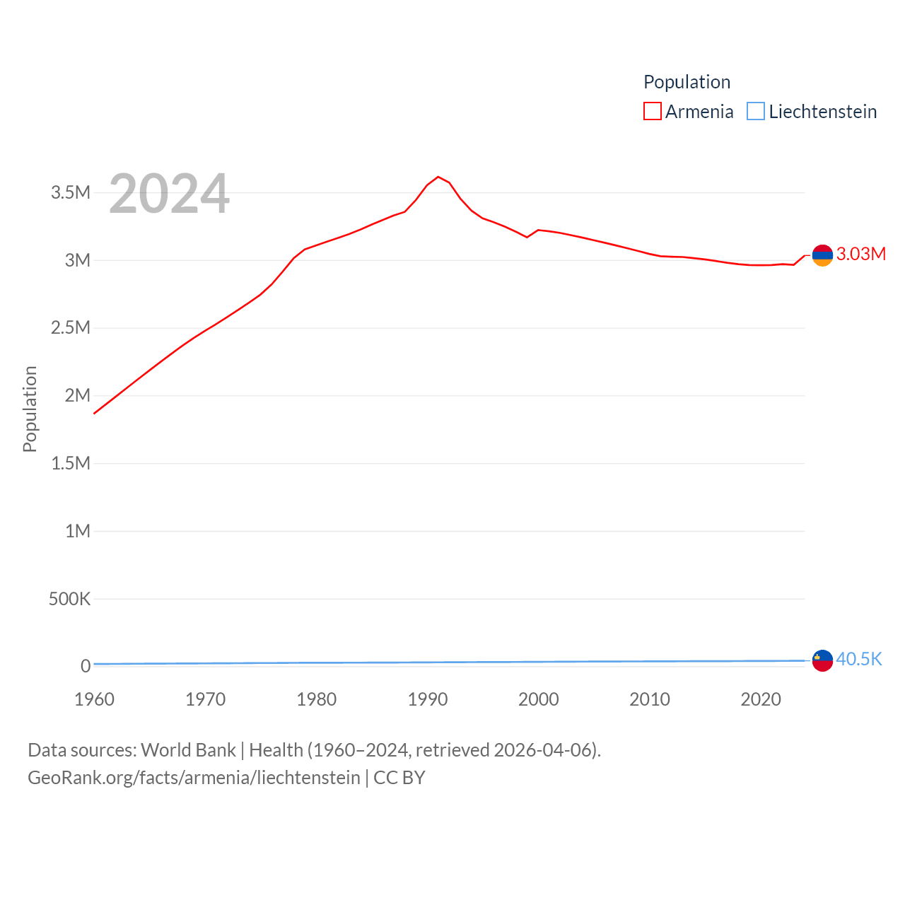 Armenia has a population of 3.03M (ranked 135/197), compared with 40.4K in Liechtenstein (ranked 190/197). Armenia's land area is 10,888 sq mi versus 61.8 sq mi for Liechtenstein (ranked 138th vs. 192nd).