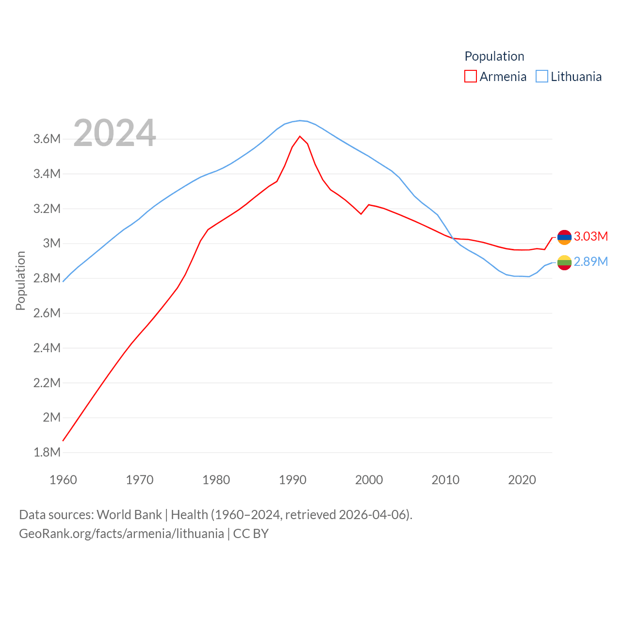 Armenia has a population of 3.03M (ranked 135/197), compared with 2.89M in Lithuania (ranked 137/197). Armenia's land area is 10,888 sq mi versus 24,170 sq mi for Lithuania (ranked 138th vs. 120th).