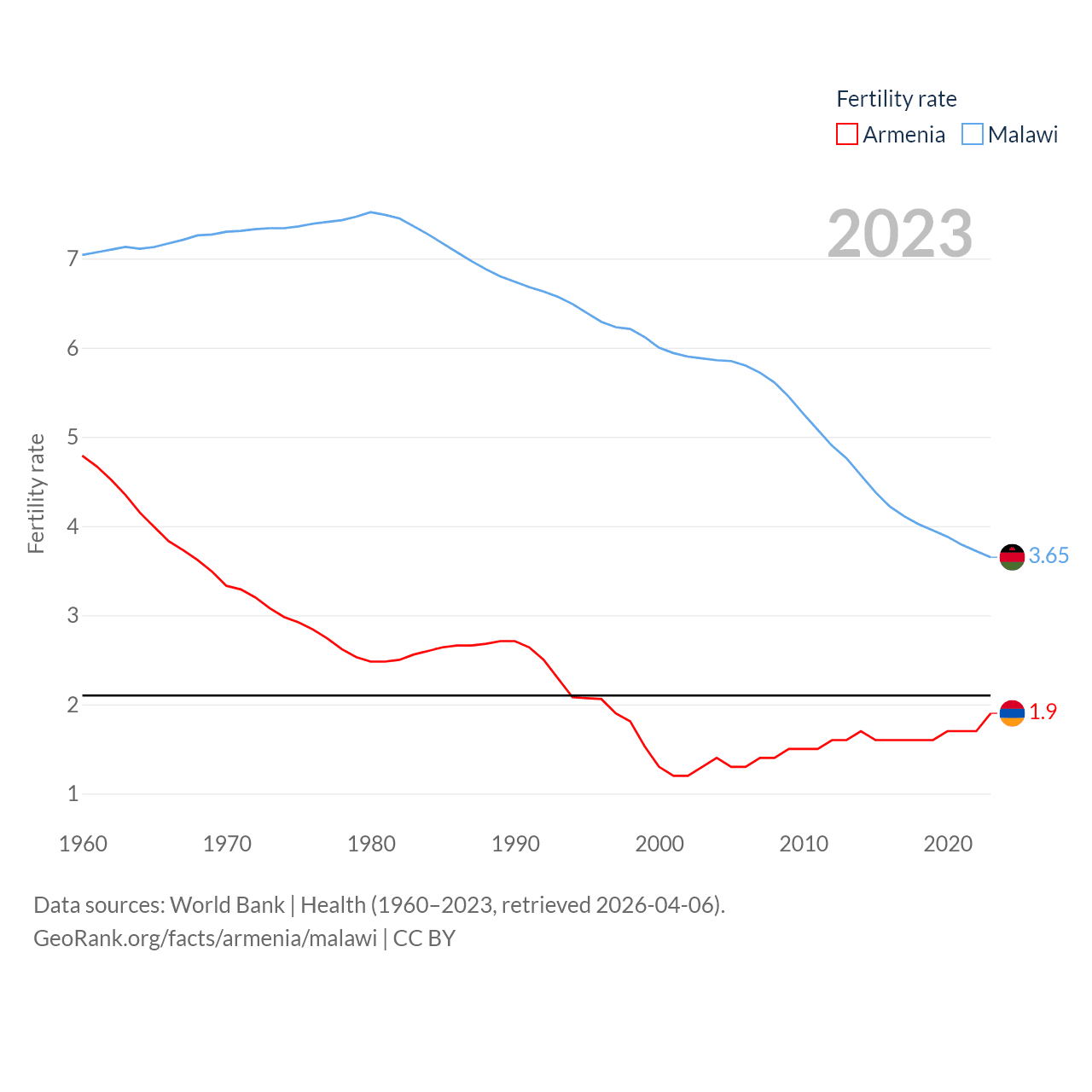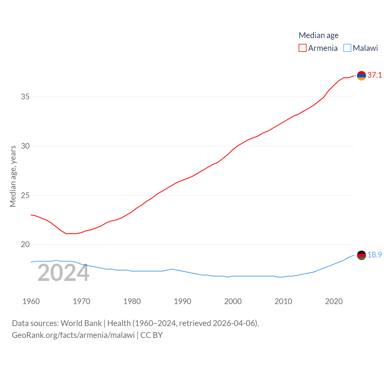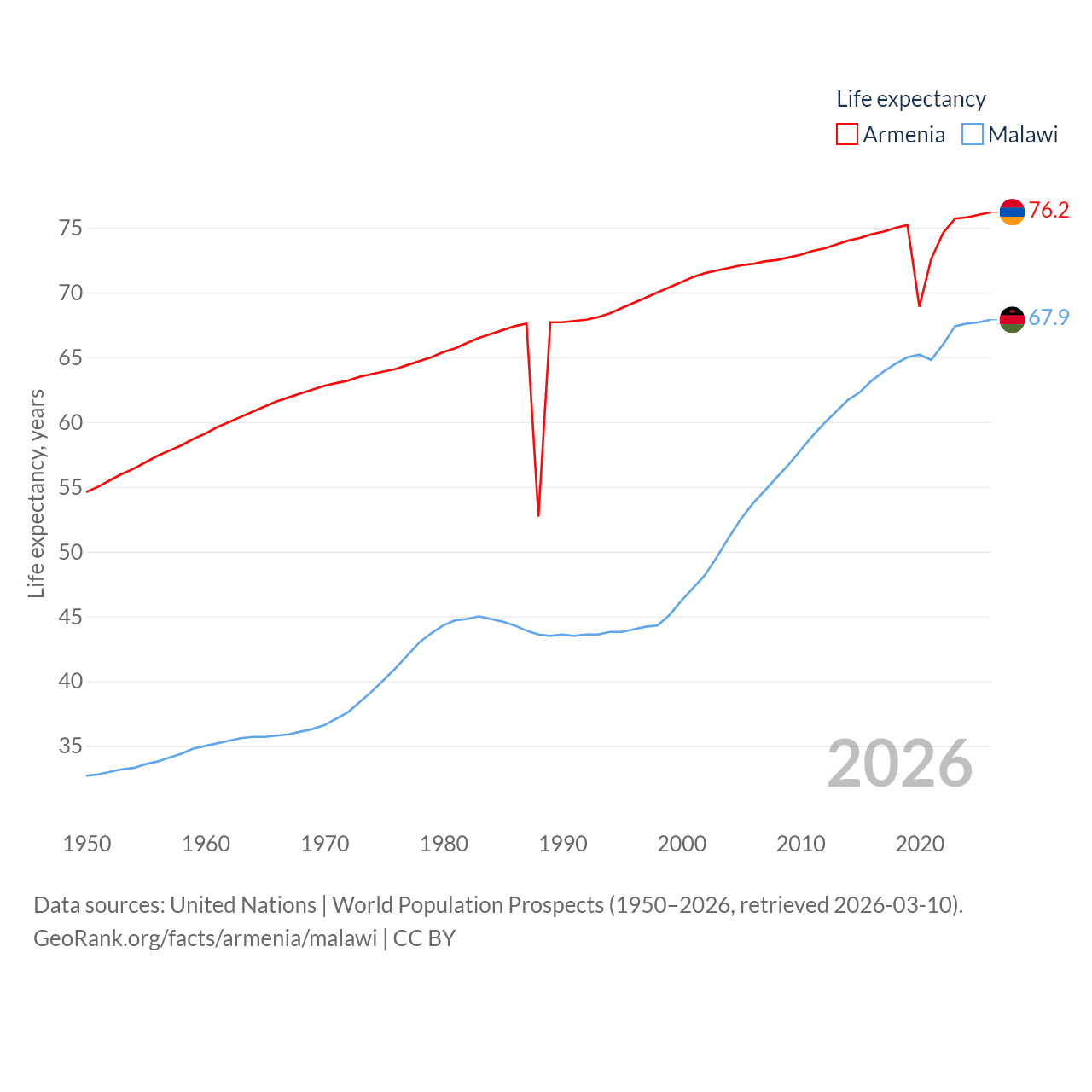 Armenia has a population of 3.03M (ranked 135/197), compared with 21.7M in Malawi (ranked 62/197). Armenia's land area is 10,888 sq mi versus 36,402 sq mi for Malawi (ranked 138th vs. 107th).