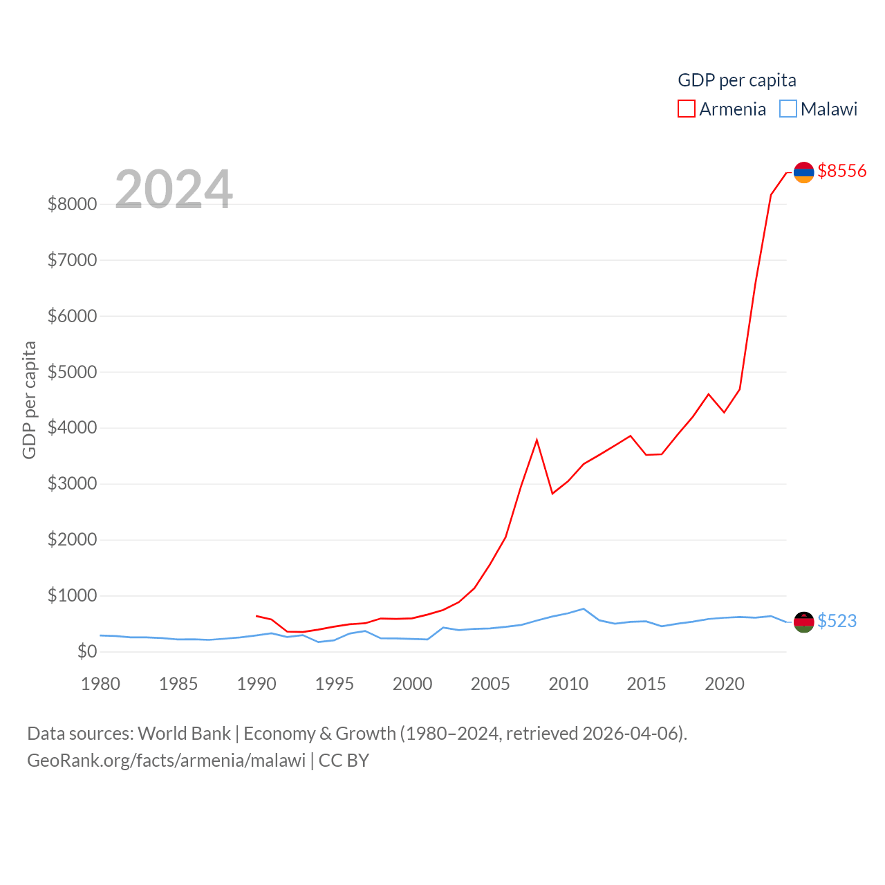 By GDP, Armenia ranks 114/197 ($26B) and Malawi ranks 151/197 ($11.3B). By GDP per capita, Armenia ranks 90/197 ($8,556), while Malawi ranks 194/197 ($523).